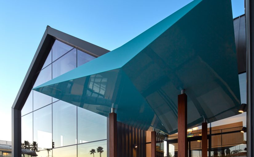 The building’s sense of transparency is enhanced by the cable rails installed by local sailors, which provide physical safety without compromising the bay’s vistas. Other local marine elements include the main entry canopy, reminiscent of an inverted boat hull built by a local builder using marine-grade ply covered in resin. In addition, Ipe trellis columns and canvas covering materials draw inspiration from nautical masts and booms.”