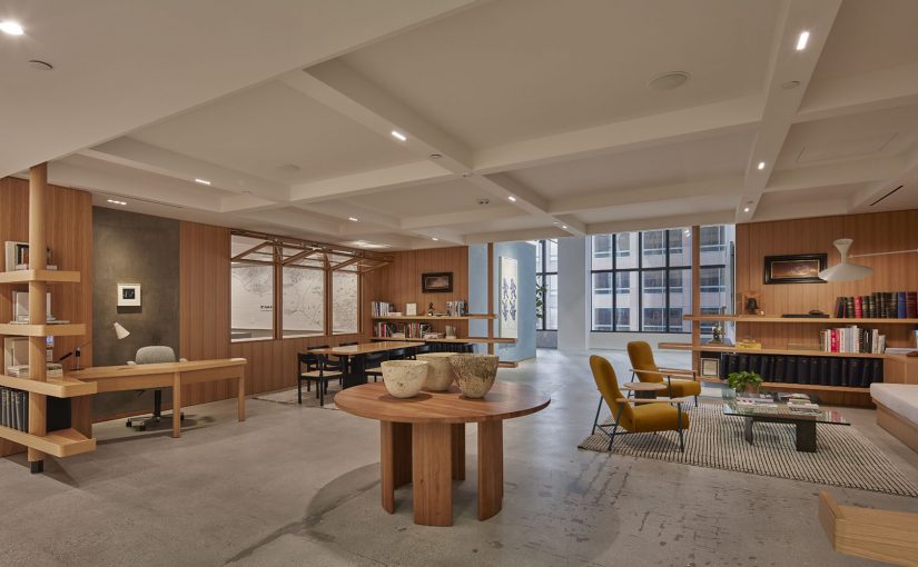 “Located On Bunker Hill, one block from The Broad Museum, this high-rise office space is organized as a series of curated spatial experiences that help promote the company’s values….Filled with a rich material palette, all the way up to the low coffered ceiling, the Education Library, which is based on the Le Corbusier, Charlotte Perriand exhibition “House for a Young Man”, serves as a domestic, communal space aimed to induce curiosity and promote conversation. ”