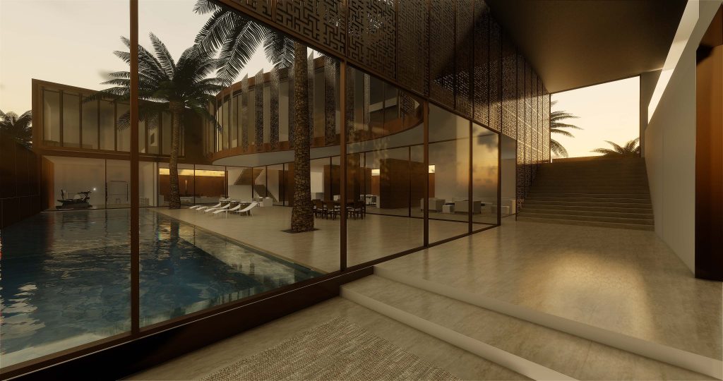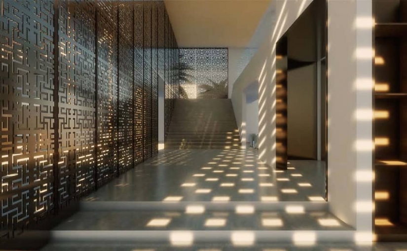 “The simplicity of its serene stone-clad exterior is expressed as flush, planar, and protective. At the same time, areas of perforated openings punctuate the surfaces, hinting at the interior and glowing lantern-like in the evening. The solid exterior appearance is contrasted by a simple curved interior edge that defines the hidden courtyard and recalls the edges of the wind-swept dunes of the desert. One moves through a concentricity of protective ‘shell’ walls from exterior to interior, revealing an interior garden oasis.”