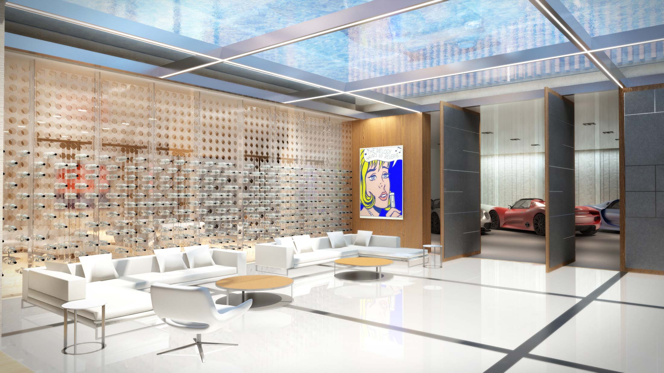 The lower level is a virtual playground of amenities including a Bar, Wine lounge, Billiards hall, Bowling alley, Wellness center complete with Salon, massage, sauna, steam and hot tub, a full gym with private outdoor courtyard and a state of the art theater. A large light well at the base of the central reflecting pool creates an aquatic lens linking the upper and lower levels; vertically binding them together in a wash of natural light and animated shadowing.