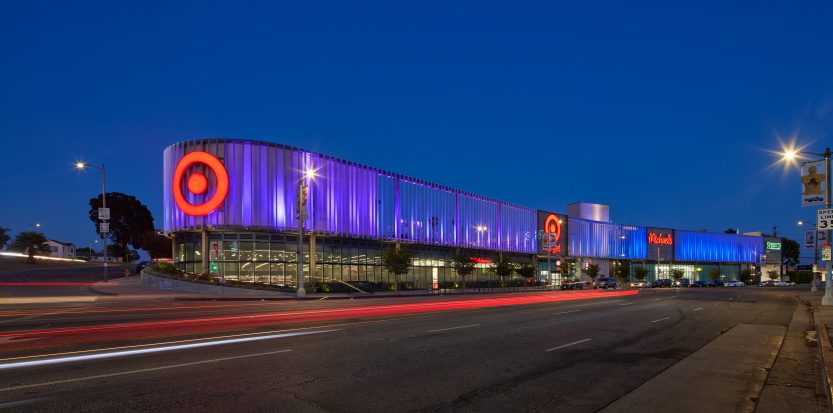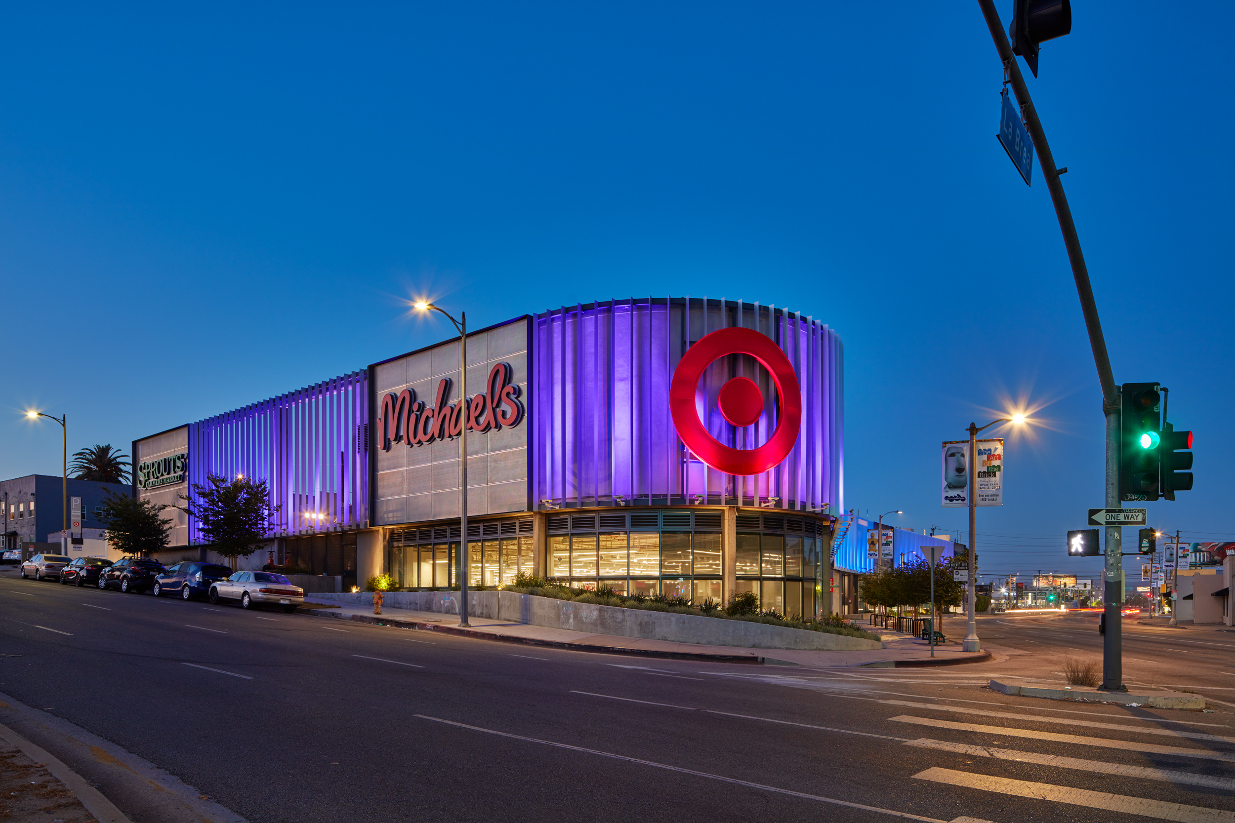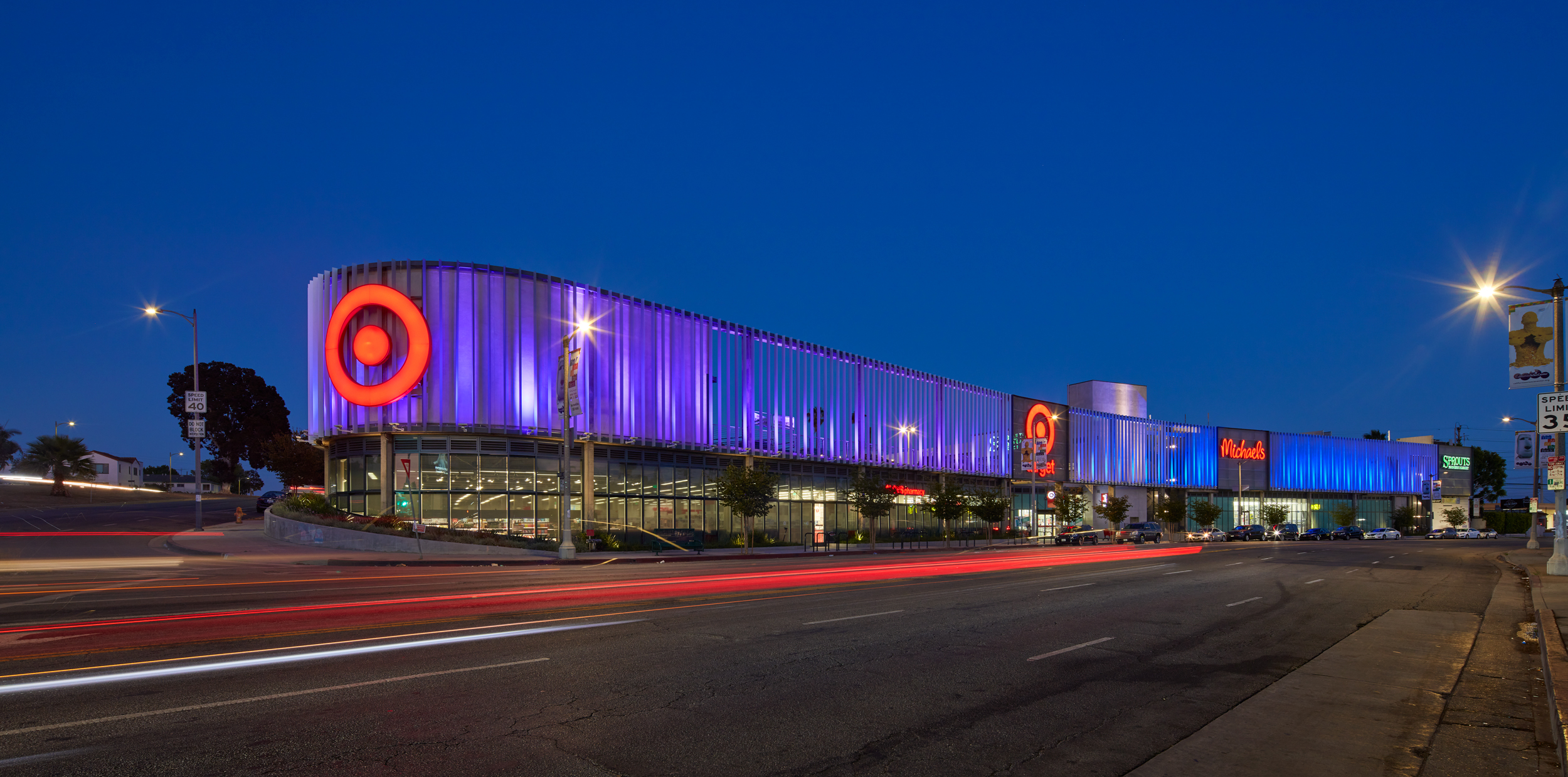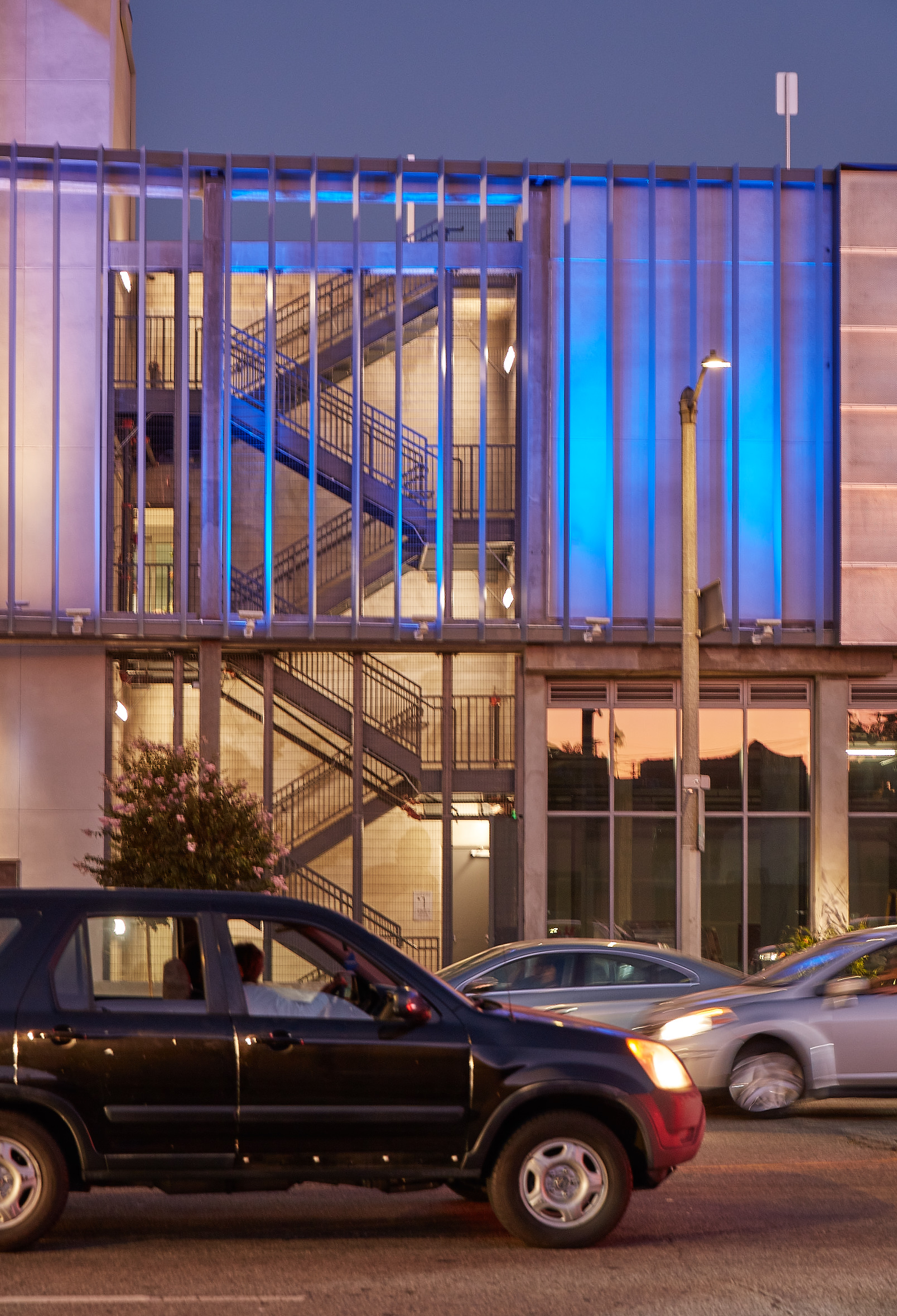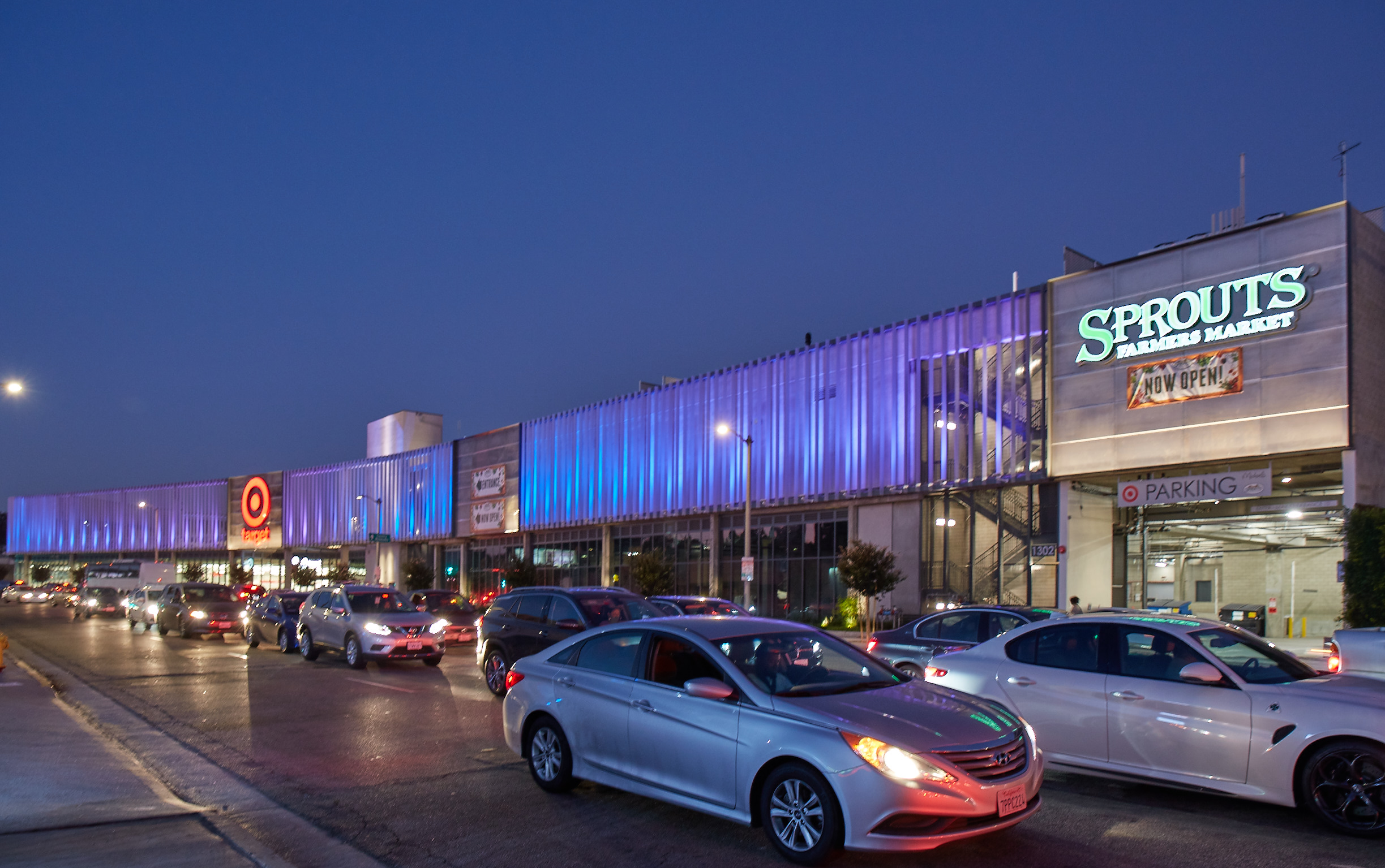 1302 La Brea is a two-story retail building south of mid-Wilshire with 80,000 square feet of retail with three levels of parking. In response to the lot size and dimensions, 1302 La Brea hosts a long horizontal proportion and follows the curvature of the boulevard. The building is situated in a retail desert and adjacent to heavy vehicle traffic. Responding to this environment, the building’s functions brings a needed retail space including a grocery store wrapped with a façade was designed to be experienced from a vehicle and public transit.