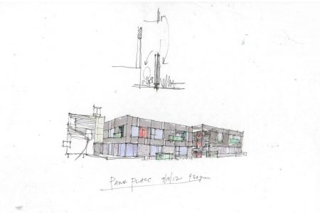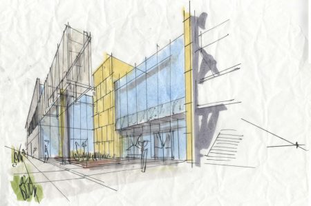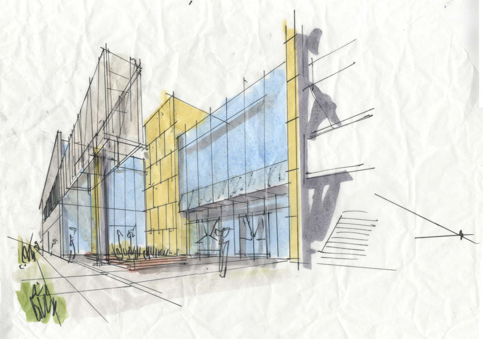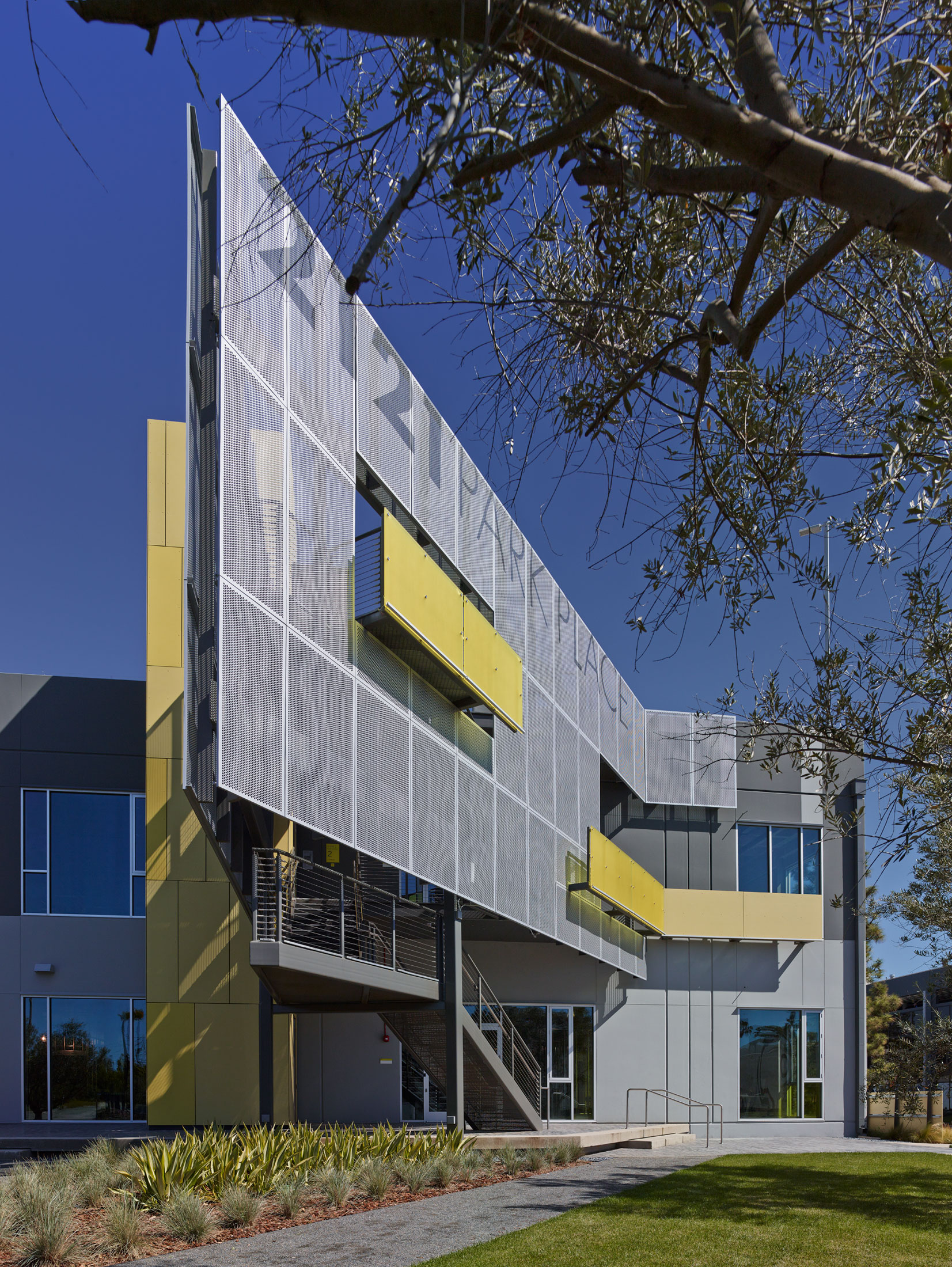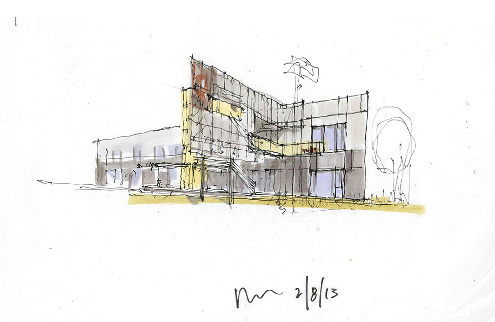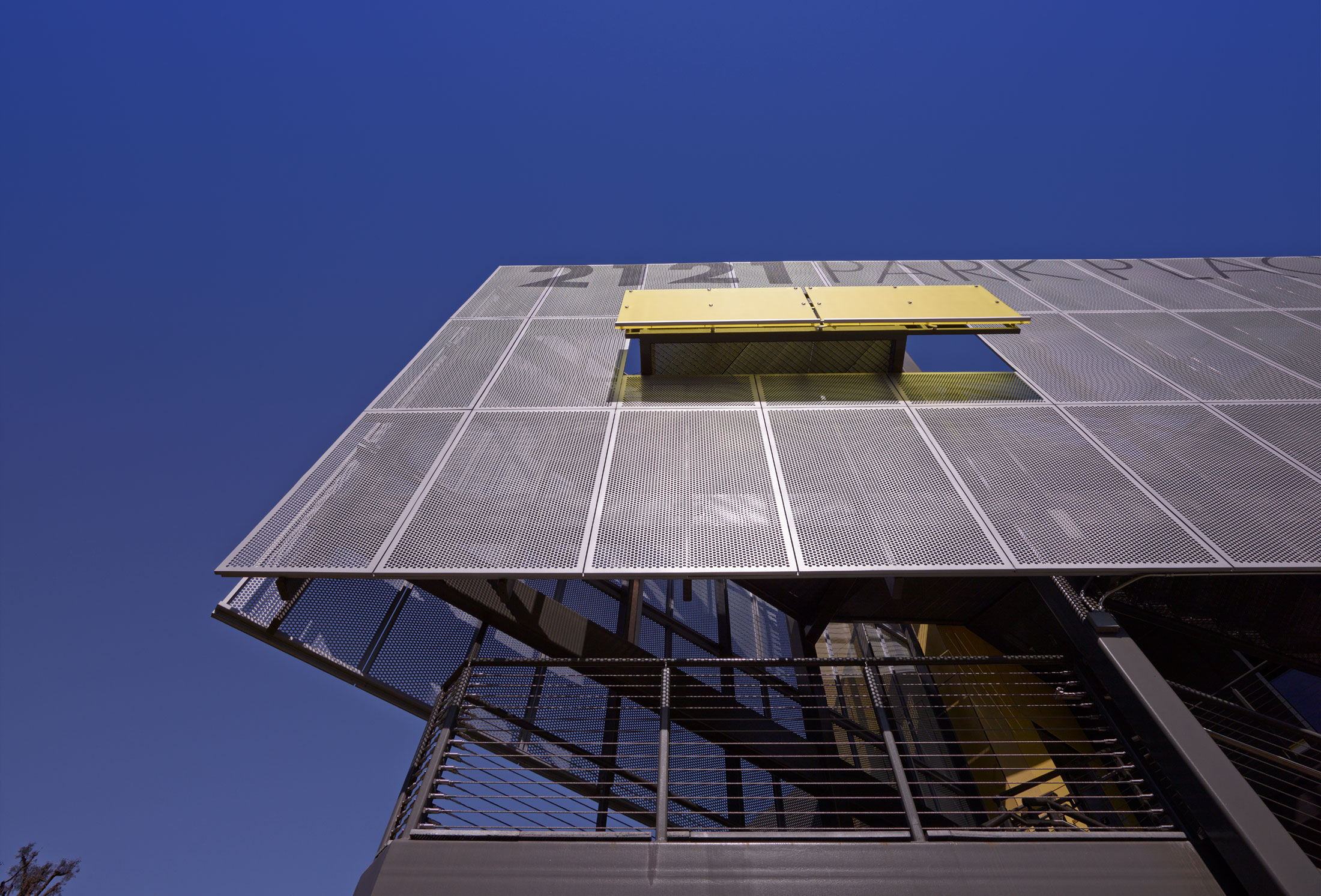 The design team created openness, connectivity and energy by subtracting structure, articulating openings for daylight, integrating landscaping, and adding connective architectural elements. A central courtyard was extracted from the building mass to create an active center. Double-height glazing connects the indoors and outdoors visually. Scored reveals on the concrete façade simulates block paneling, resulting in a more substantial expression. Through the use of warm, contemporary materials, colorful and variegated landscape design, as well as corporate identity branding elements, the transformation has become a catalyst for the emergence of a vibrant creative district.