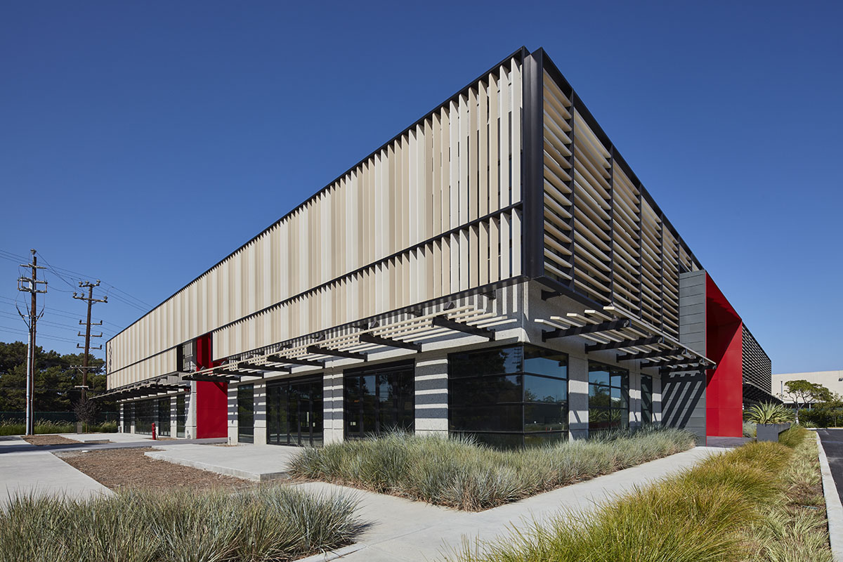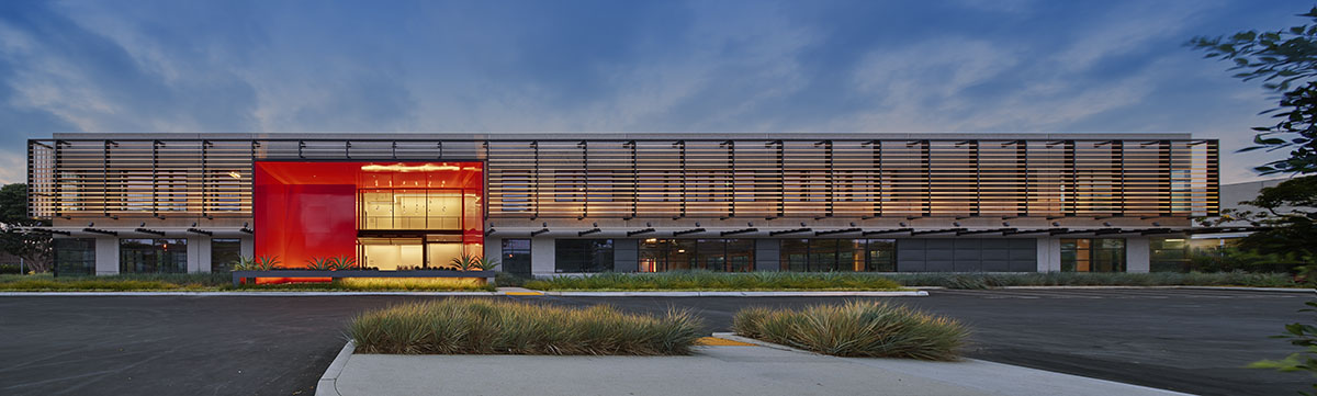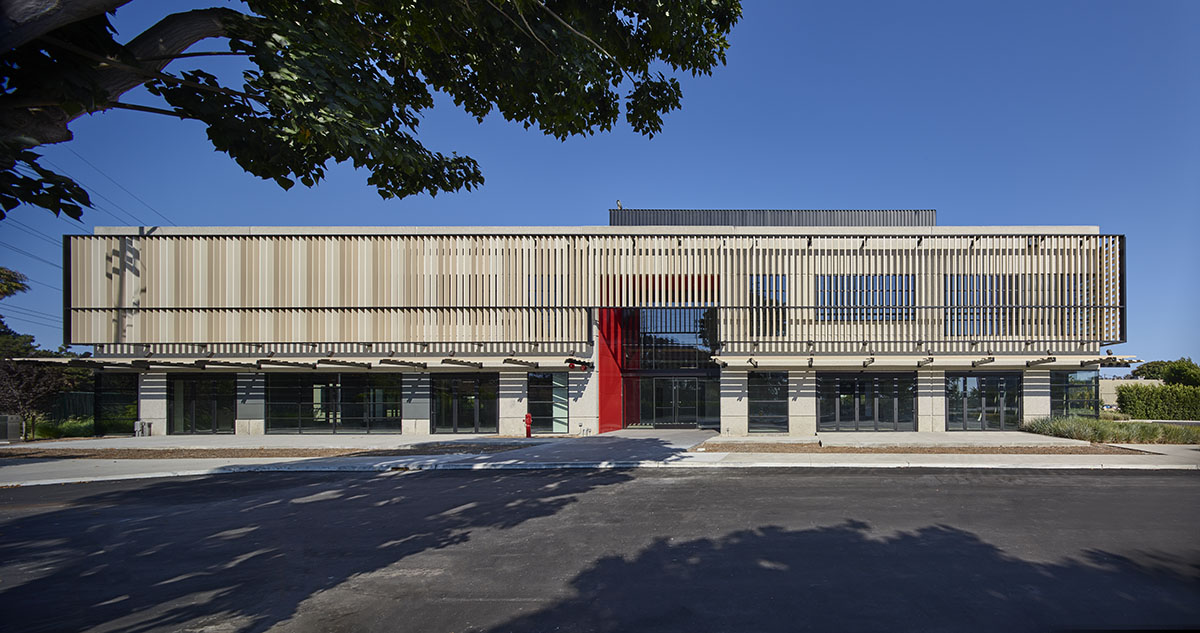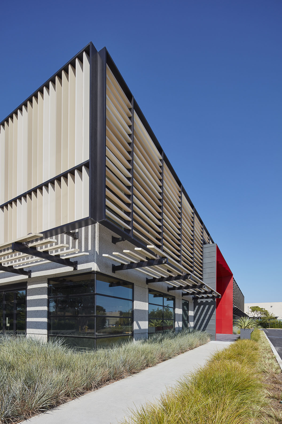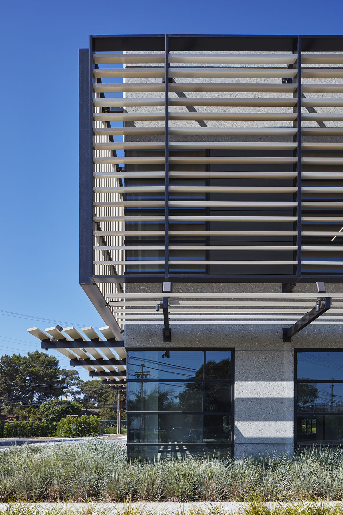 A system of aluminum louvers is installed over a dark steel structure, shrouding the top portion of the two-story building to mitigate solar heat gain and glare. On the southern-facing façade, the louvers are placed horizontally to shade the nearly vertical rays of the sun, while on the west-facing façade the louvers are oriented vertically, blocking the low afternoon sun. This shift of orientation offers a sophisticated appearance to the screen giving a new fresh look to the existing shell while functioning as a performative element.
