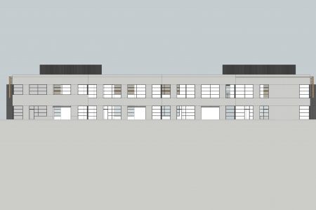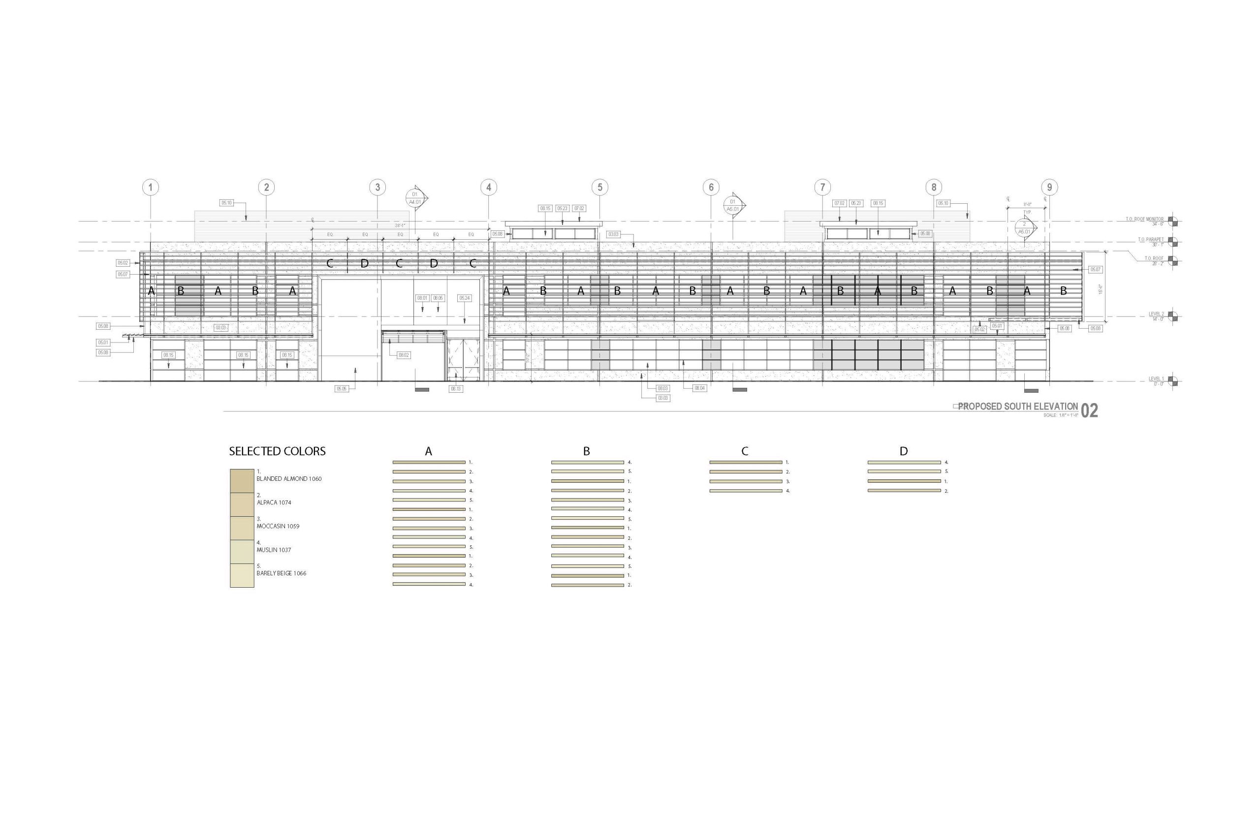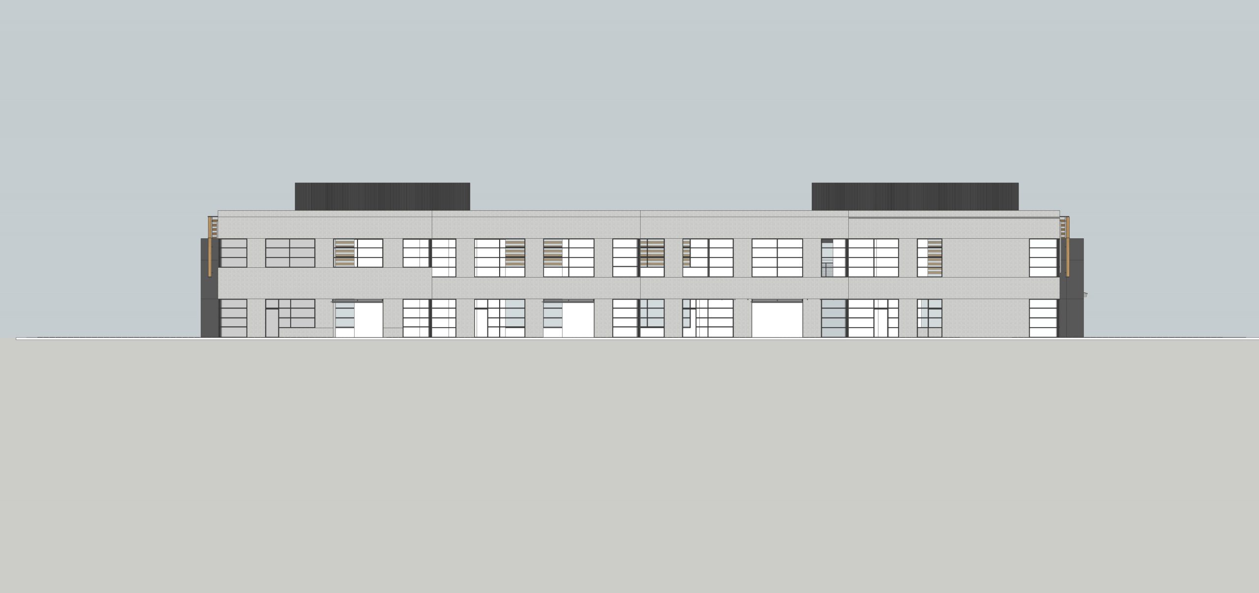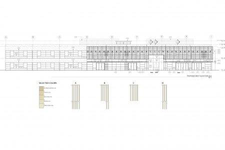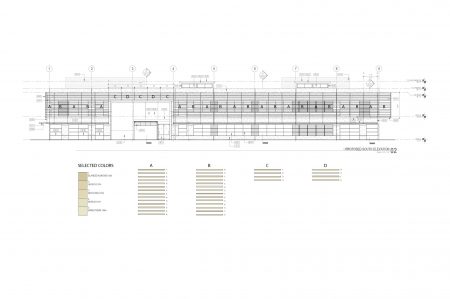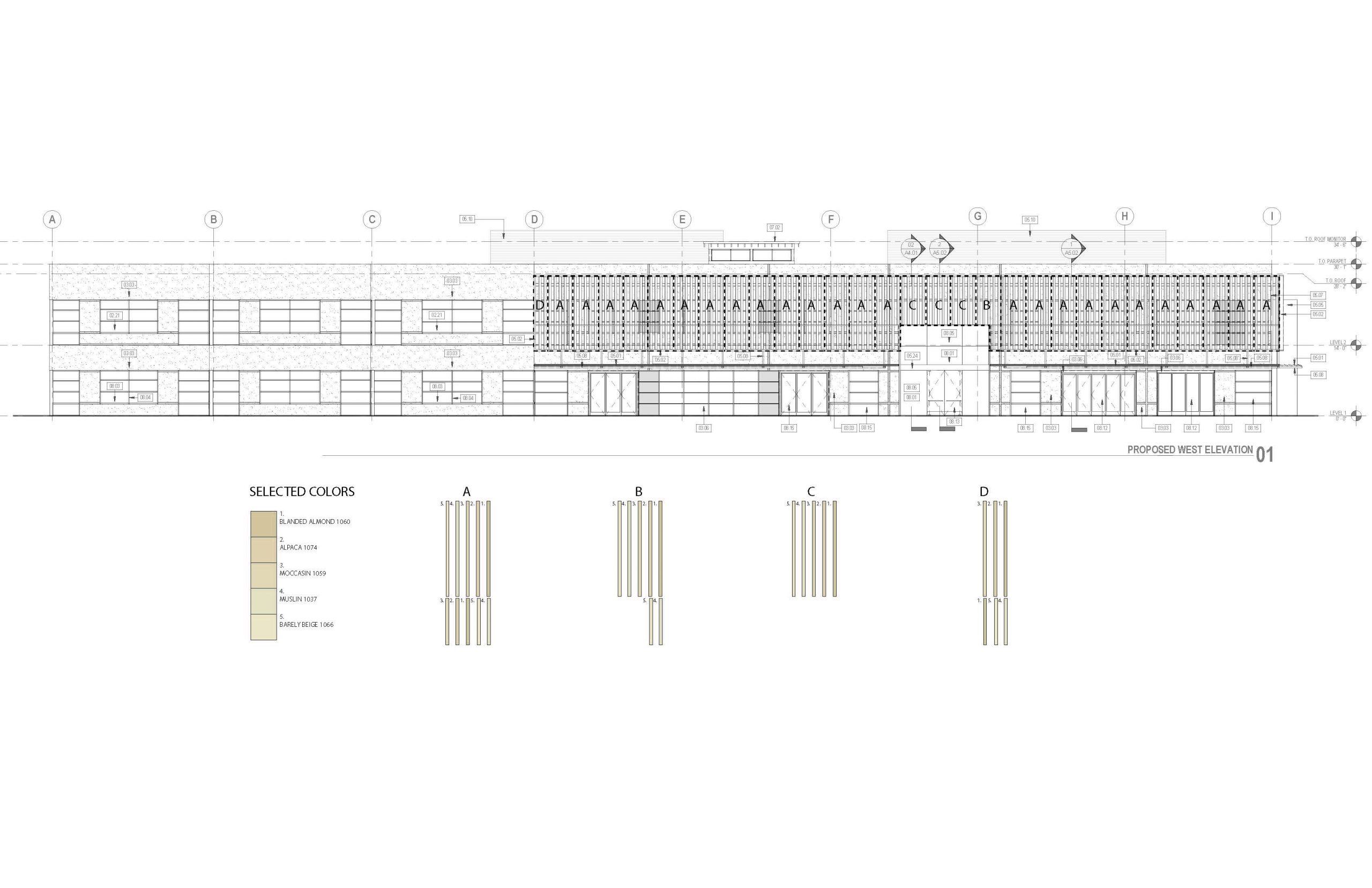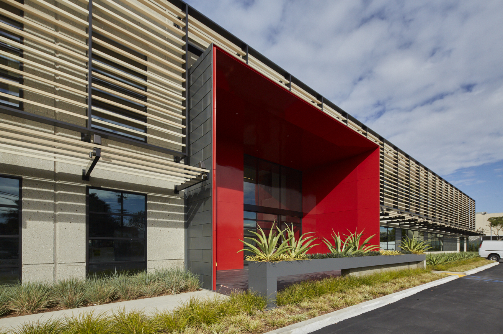A system of aluminum louvers is installed over a dark steel structure, shrouding the top portion of the two-story building to mitigate solar heat gain and glare. On the southern-facing façade, the louvers are placed horizontally to shade the nearly vertical rays of the sun, while on the west-facing façade the louvers are oriented vertically, blocking the low afternoon sun. This shift of orientation offers a sophisticated appearance to the screen giving a new fresh look to the existing shell while functioning as a performative element.