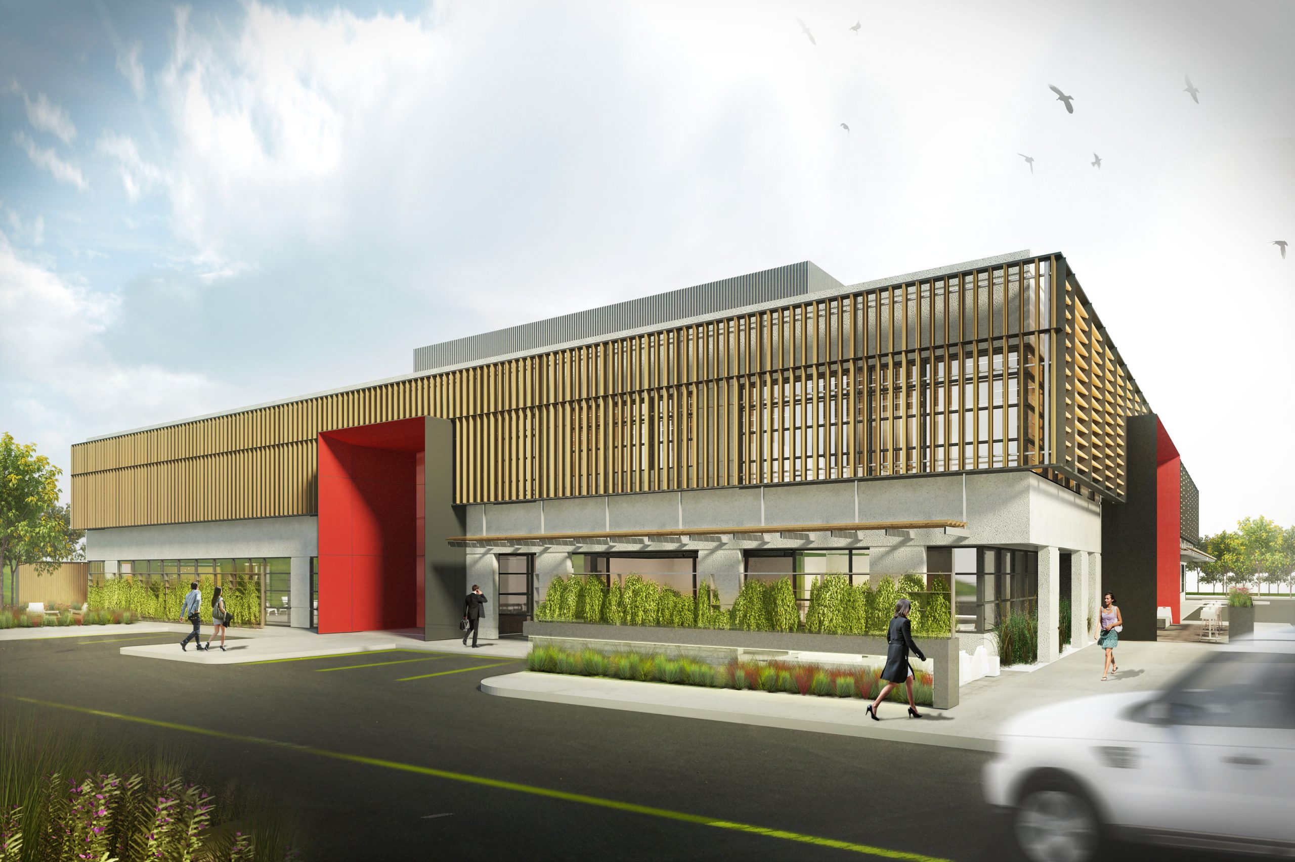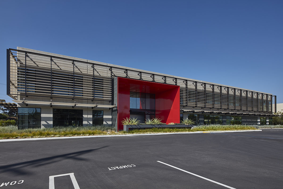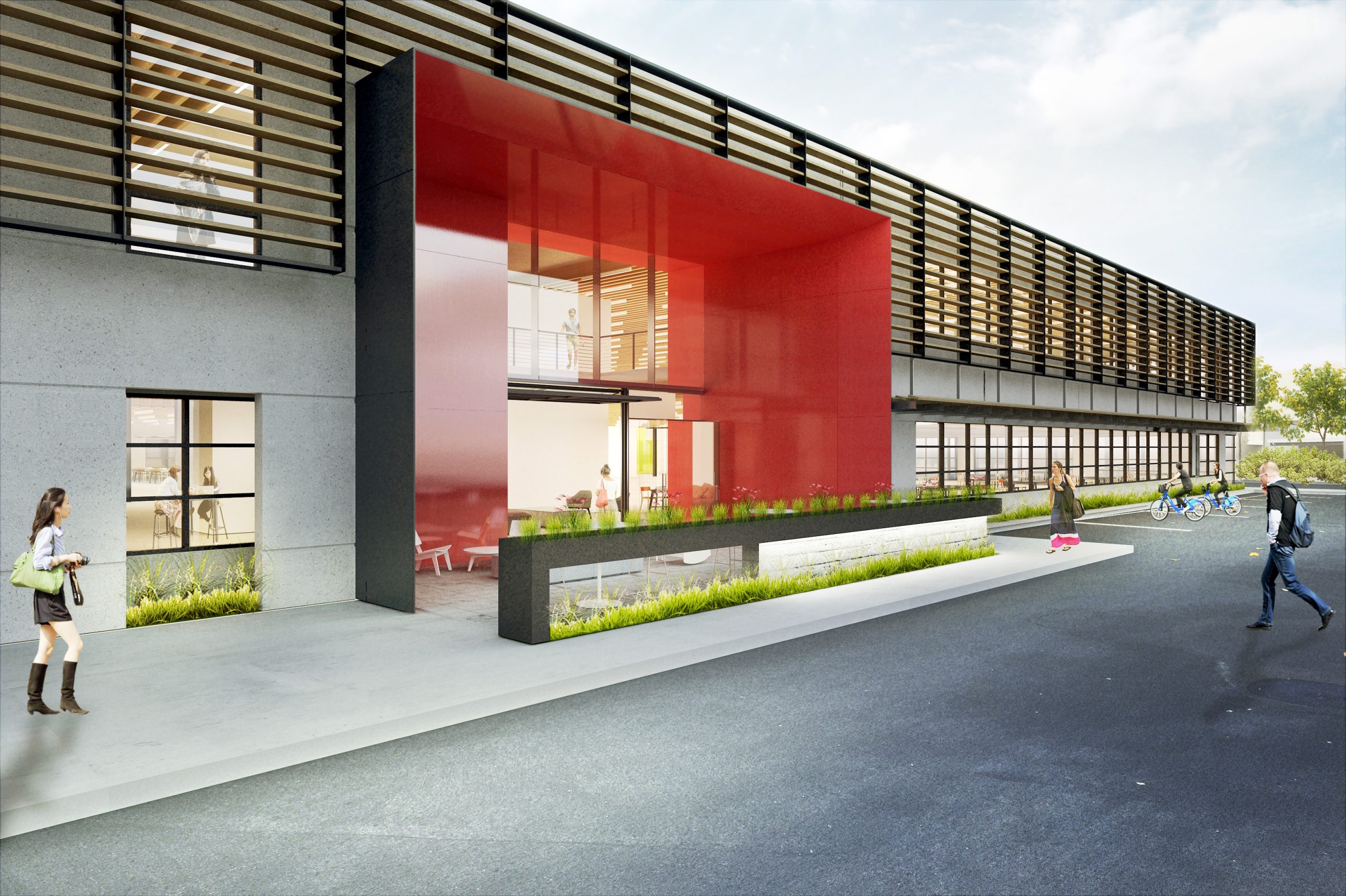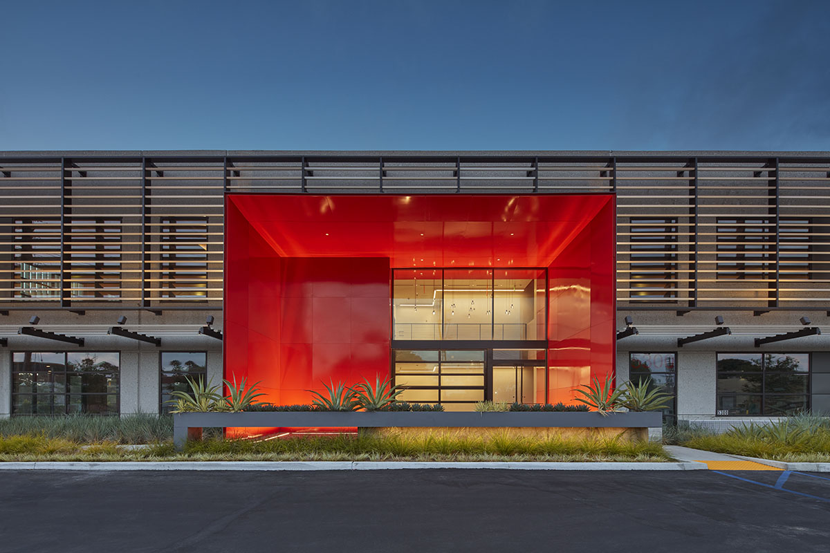 On the south façade facing the street and approach, a bright red metal enclosure frames the main lobby entry – a clear wayfinding marker for visitors, and an anchor for the long horizontal south elevation. Dark zinc cladding wraps the outside of the enclosure, further focusing the bright red entry. On the west and east facades are smaller versions of the enclosure marking future tenant entries.