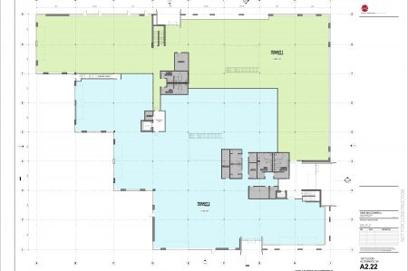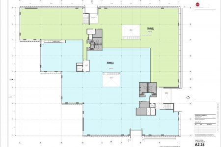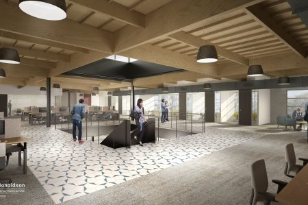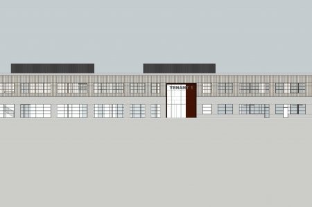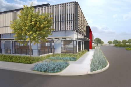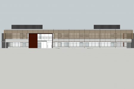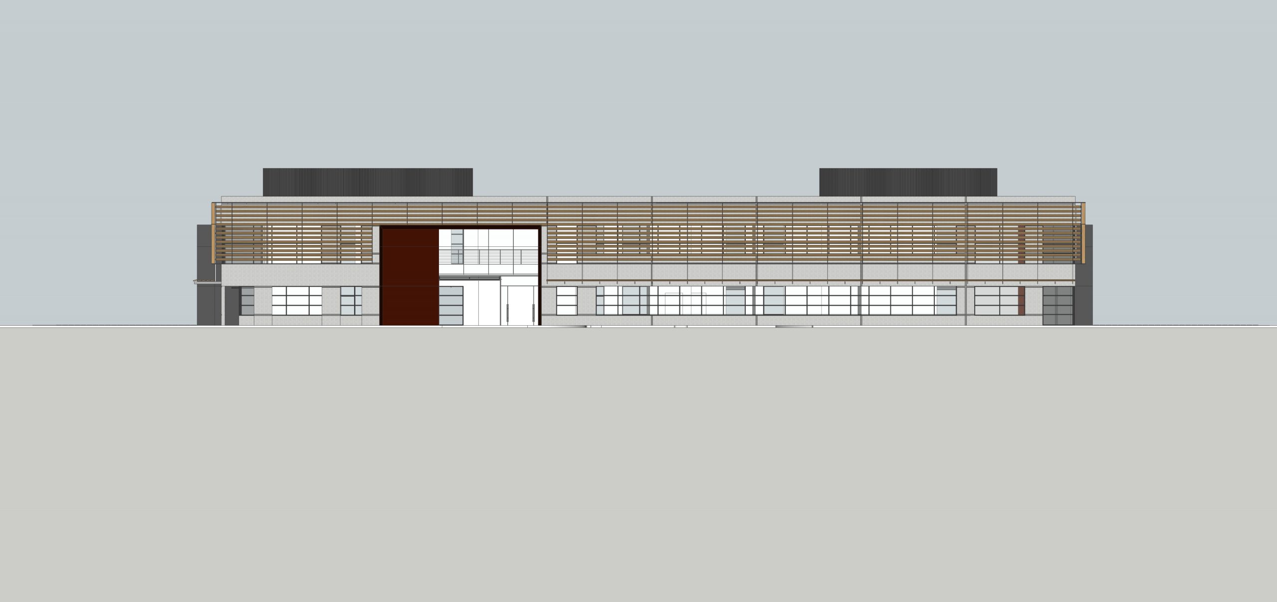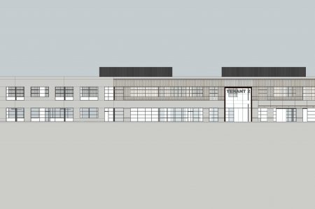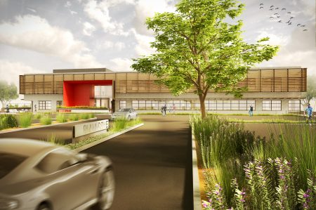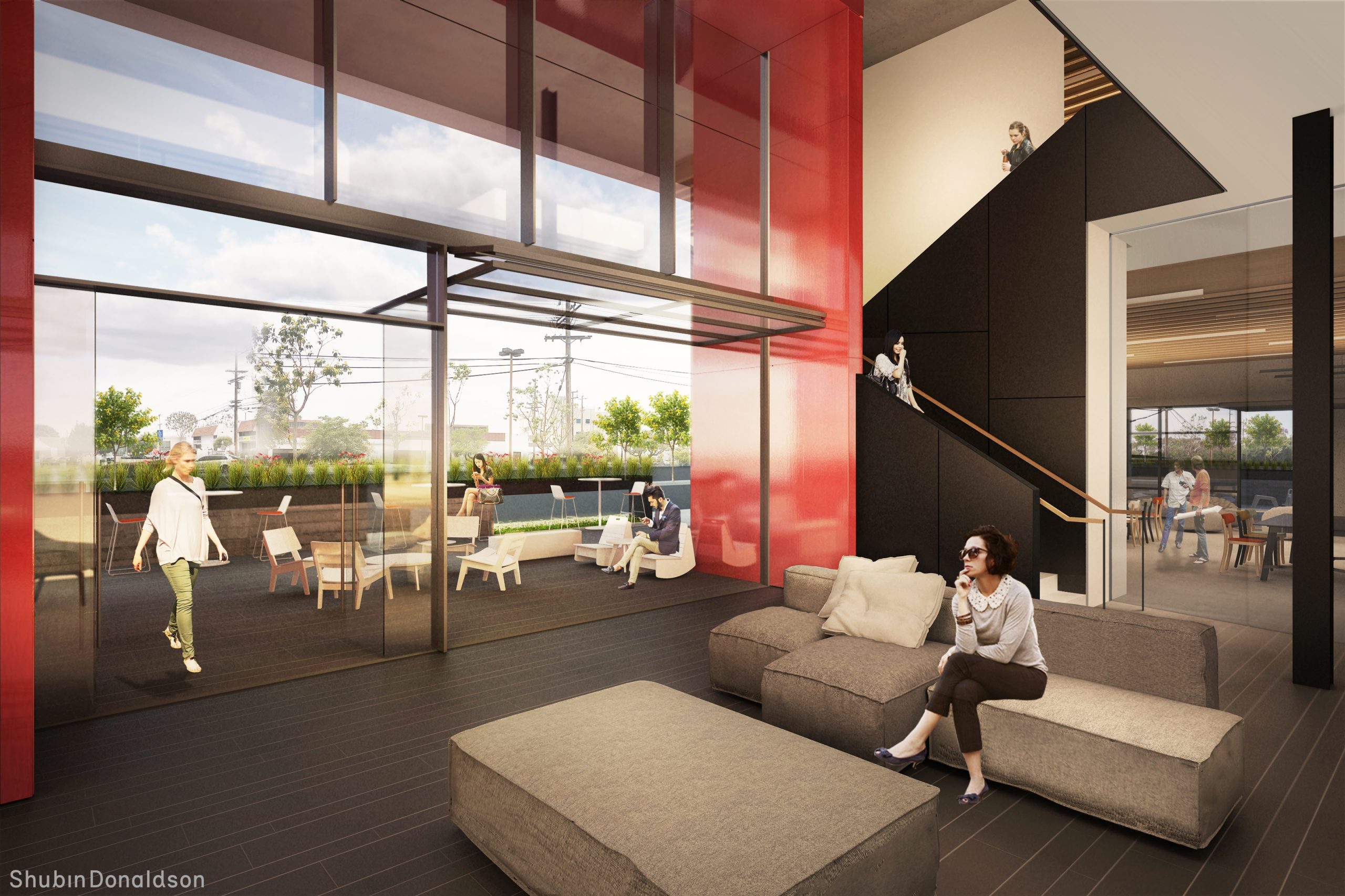 On the south façade facing the street and approach, a bright red metal enclosure frames the main lobby entry – a clear wayfinding marker for visitors, and an anchor for the long horizontal south elevation. Dark zinc cladding wraps the outside of the enclosure, further focusing the bright red entry. On the west and east facades are smaller versions of the enclosure marking future tenant entries.