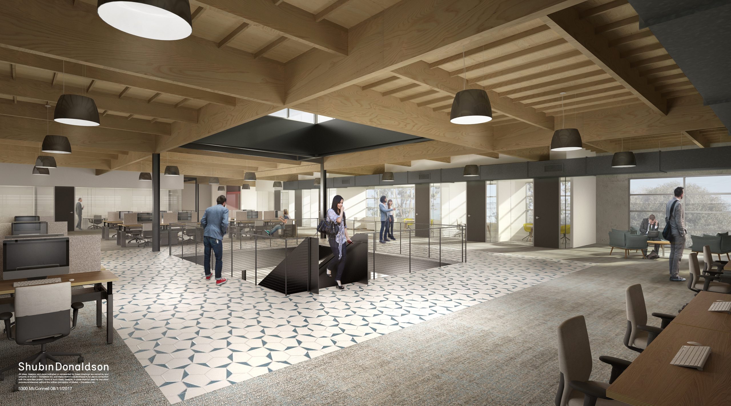 The aluminum louvers painted in a gradient of four subtle colors shift across the façade, mimicking an oversized, super graphics wood grain. At night the illuminated screen glows, making the building appear as an inviting lantern. New high-performance insulated glass further improves the energy performance of 5300 McConnell.