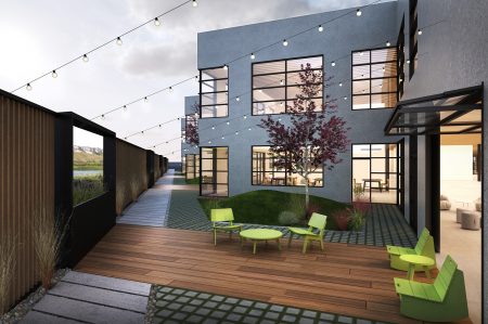 Landscape elements at the building perimeter include a raised planter in front of the main lobby, creating a gentle buffer to vehicles and marking the edge of where the building and landscape merge. The same approach is applied in specific spots around the building where smaller entries and private tenant patios emerge from the landscape.