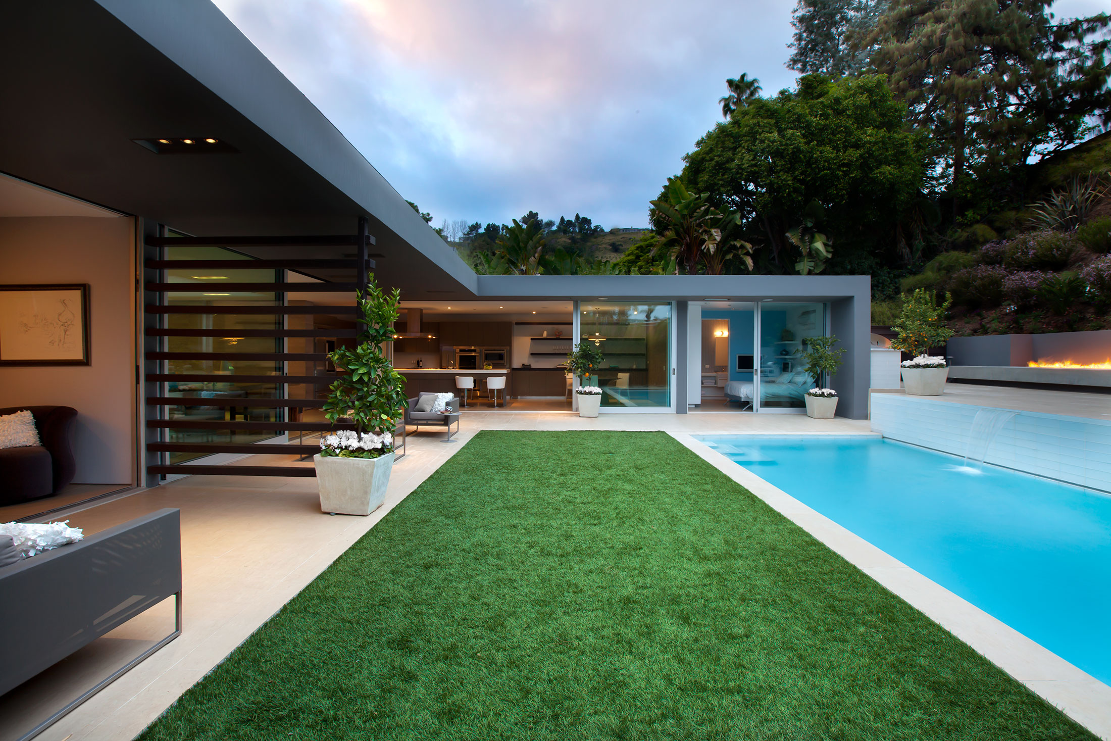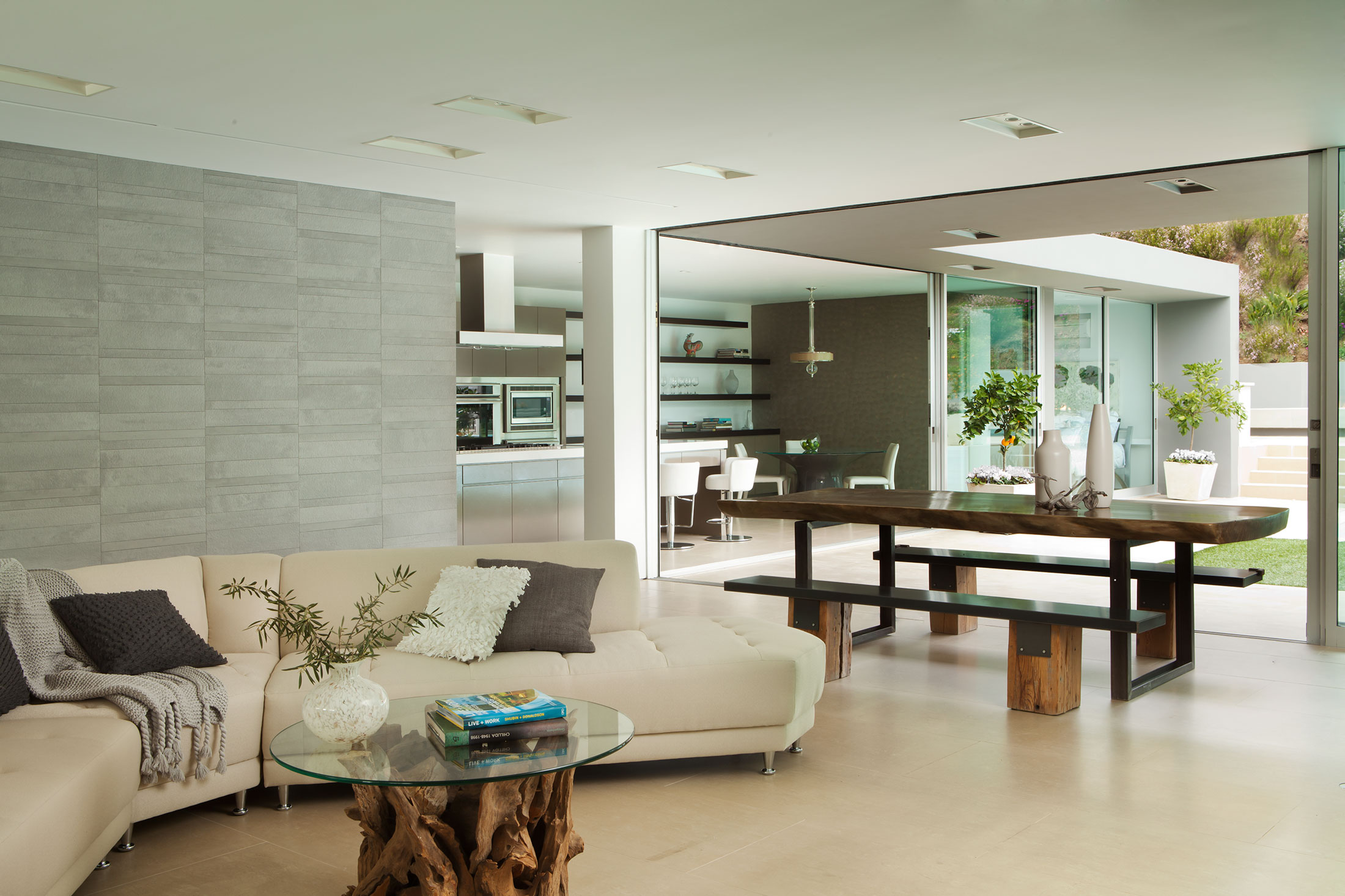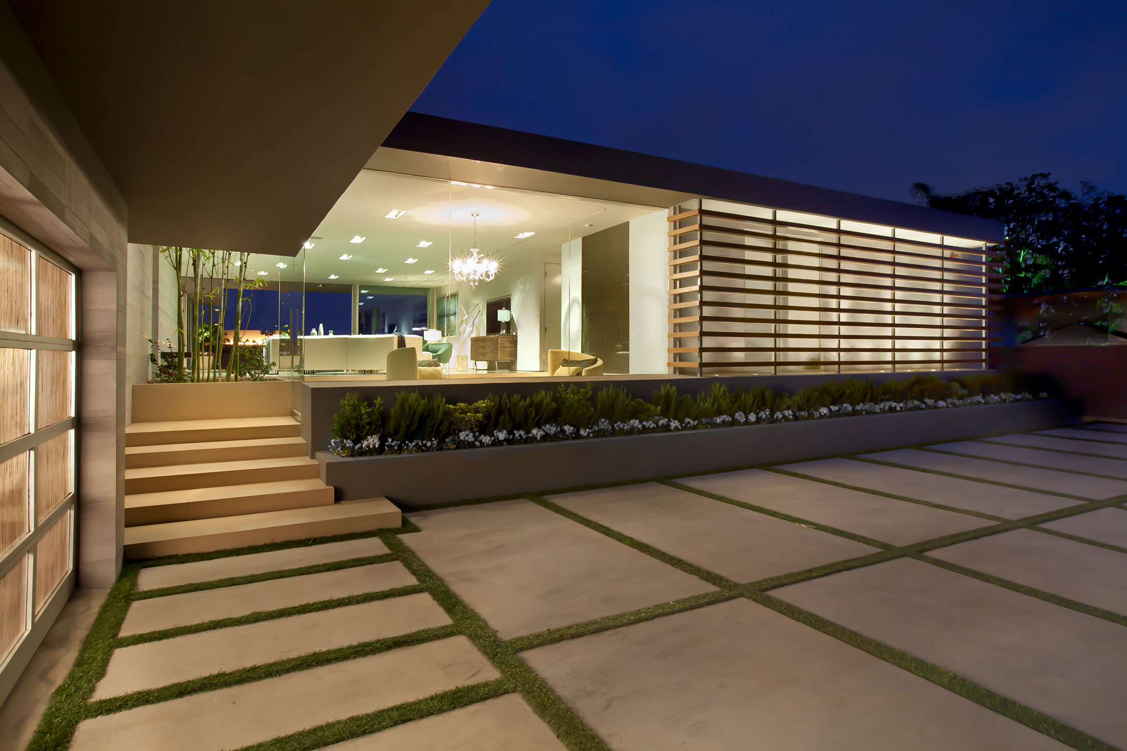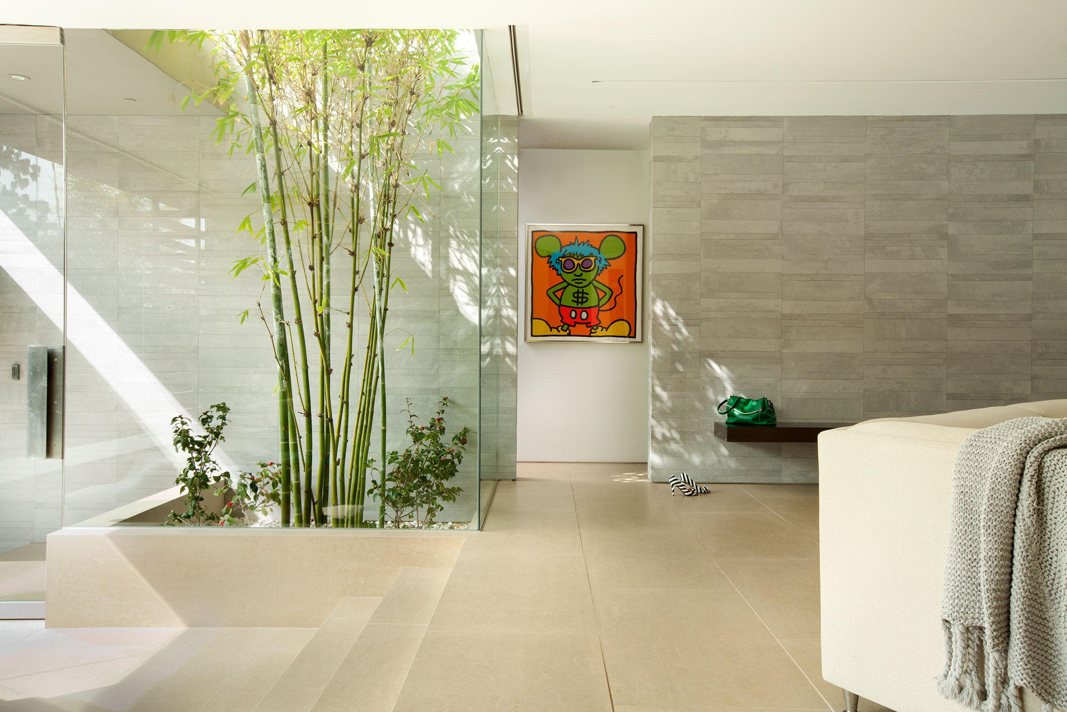 Ipe wood slats are a unifying element, wrapping the exterior and into the interior of the house, and reemerging at the back of the house. The horizontal slats serve as a shading device on the exterior, and as a wall shelving treatment on the interior before terminating as a privacy screen separating the view from the rear terrace to the master bedroom. Four bedrooms and five bathrooms are organized into separate wings divided by a central living space. A raised terrace lifts from the backside of the zero-edge pool to create a large gathering space for outdoor entertaining.