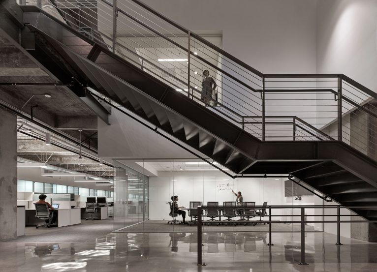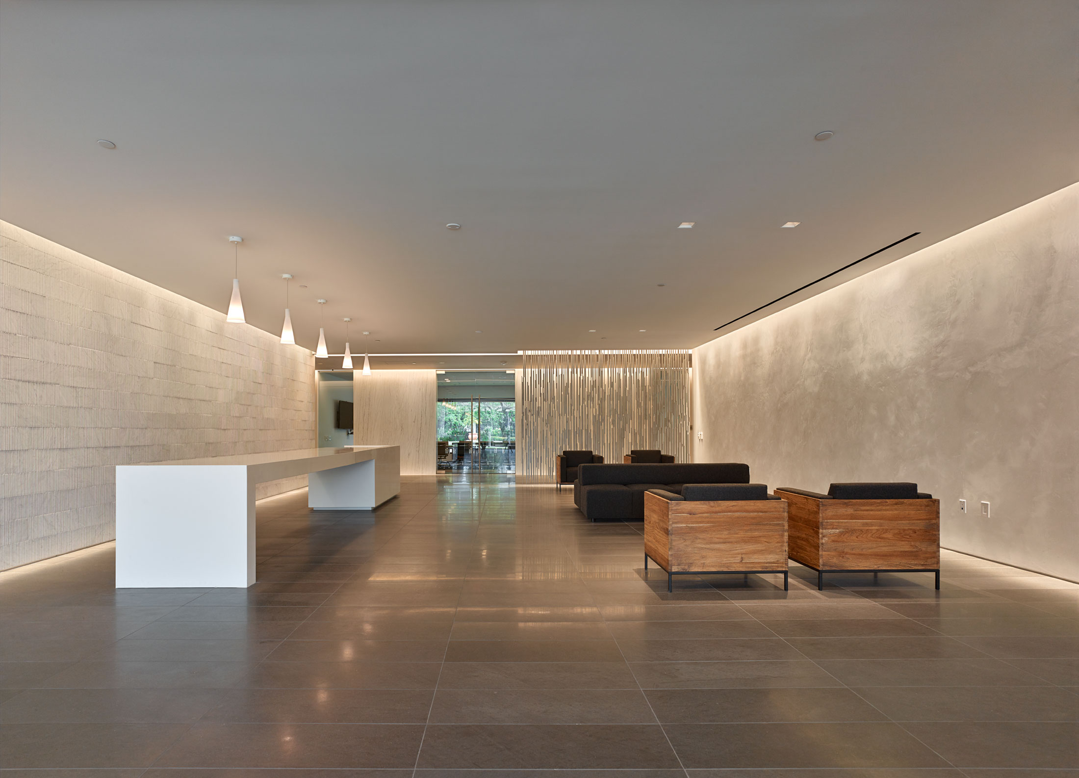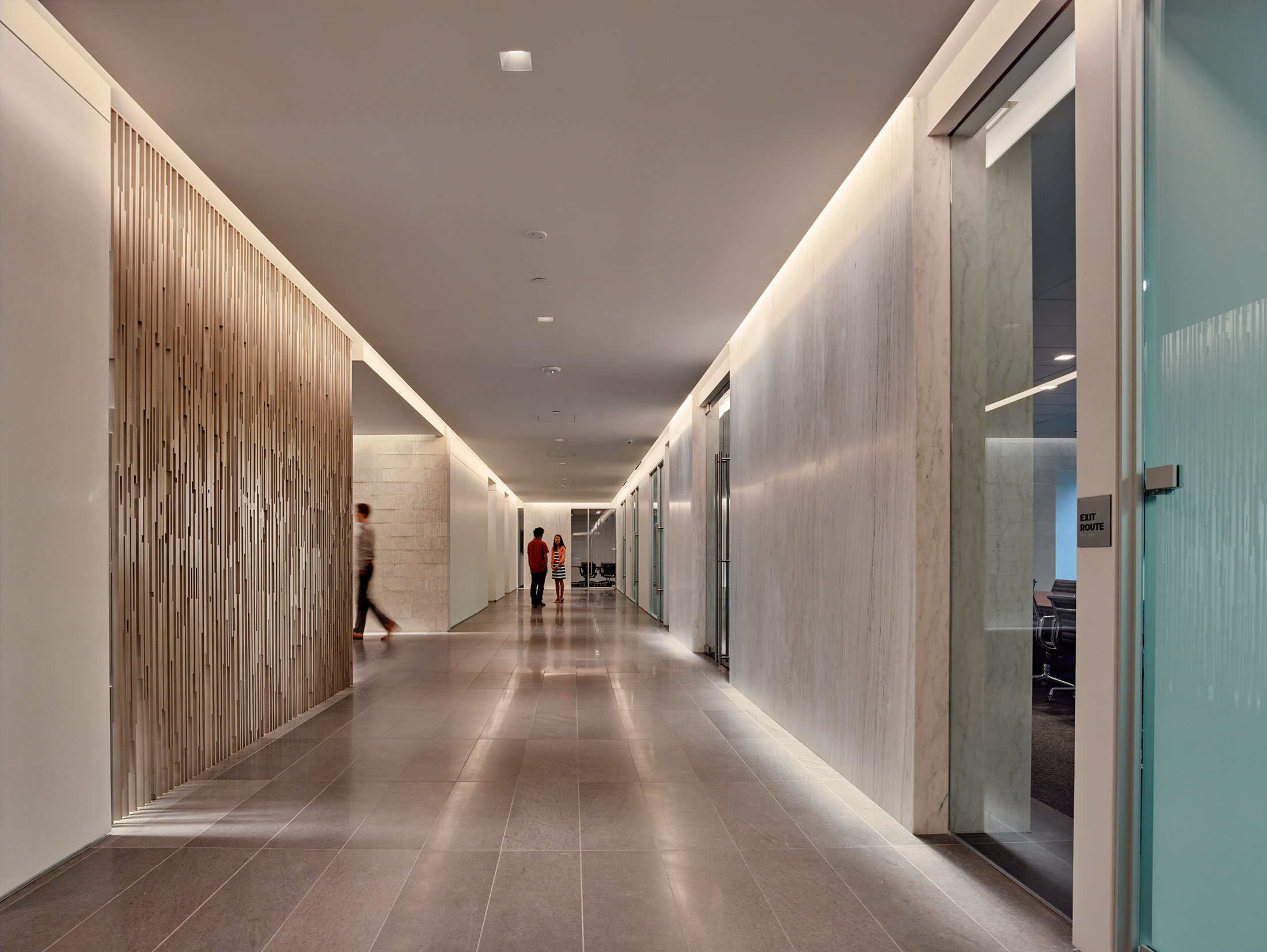 Most of the first floor was designed to perform as a conference center to address their client-facing hospitality requirements. Understated luxury is conveyed through screening elements with clean lines in a muted material palette of warm wood and textured stone. A procession of conference rooms emerges gradually and are marked by marble slabs. On the upper levels, the group’s dynamic, fast-paced work environment calls for a space that is balanced, open, and flexible. An open stair is a social hub between the two upper floors and glass conference rooms, creating a sense of transparency while showcasing their cultural community. Banquettes along the perimeter as well as moveable furniture allow employees greater autonomy to create impromptu breakout spaces and areas for privacy.