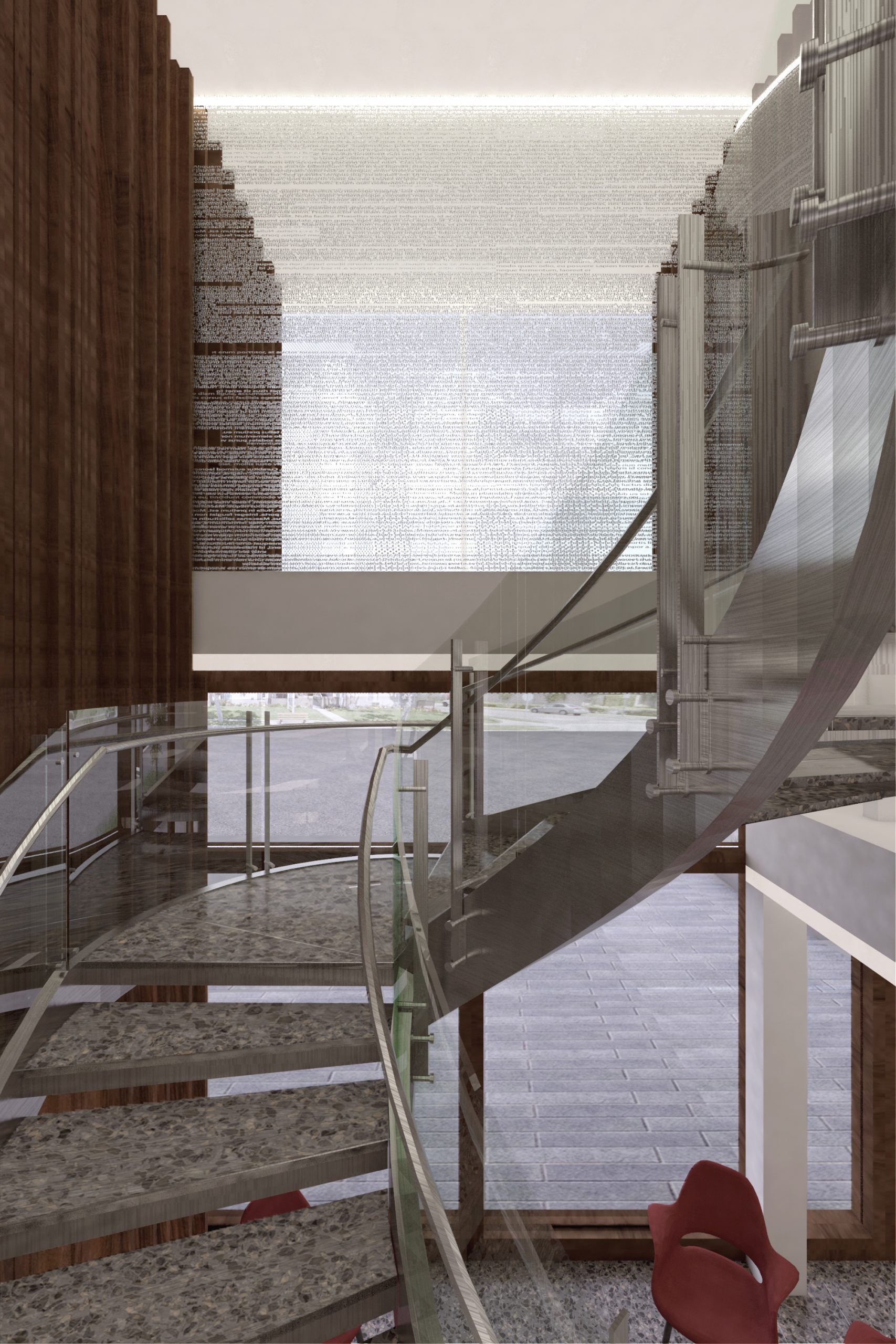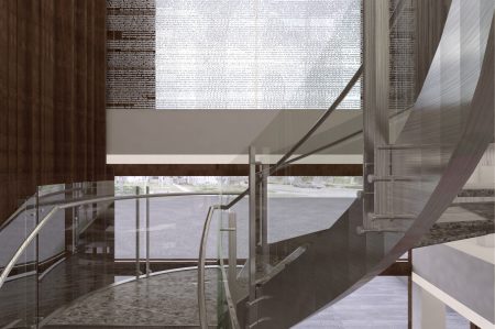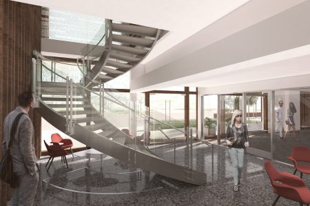 The main interior lobby renovation features a circular staircase, refinished and renovated with a glass guardrail and stainless steel handrails and a terrazzo tile finish on the treads. Ceiling heights were redesigned to give the space an open feel. Stacked, large format, terrazzo tile flows from the elevated exterior plaza throughout the lobby and into the south entrance of the building creating a cohesive exterior and interior design.
