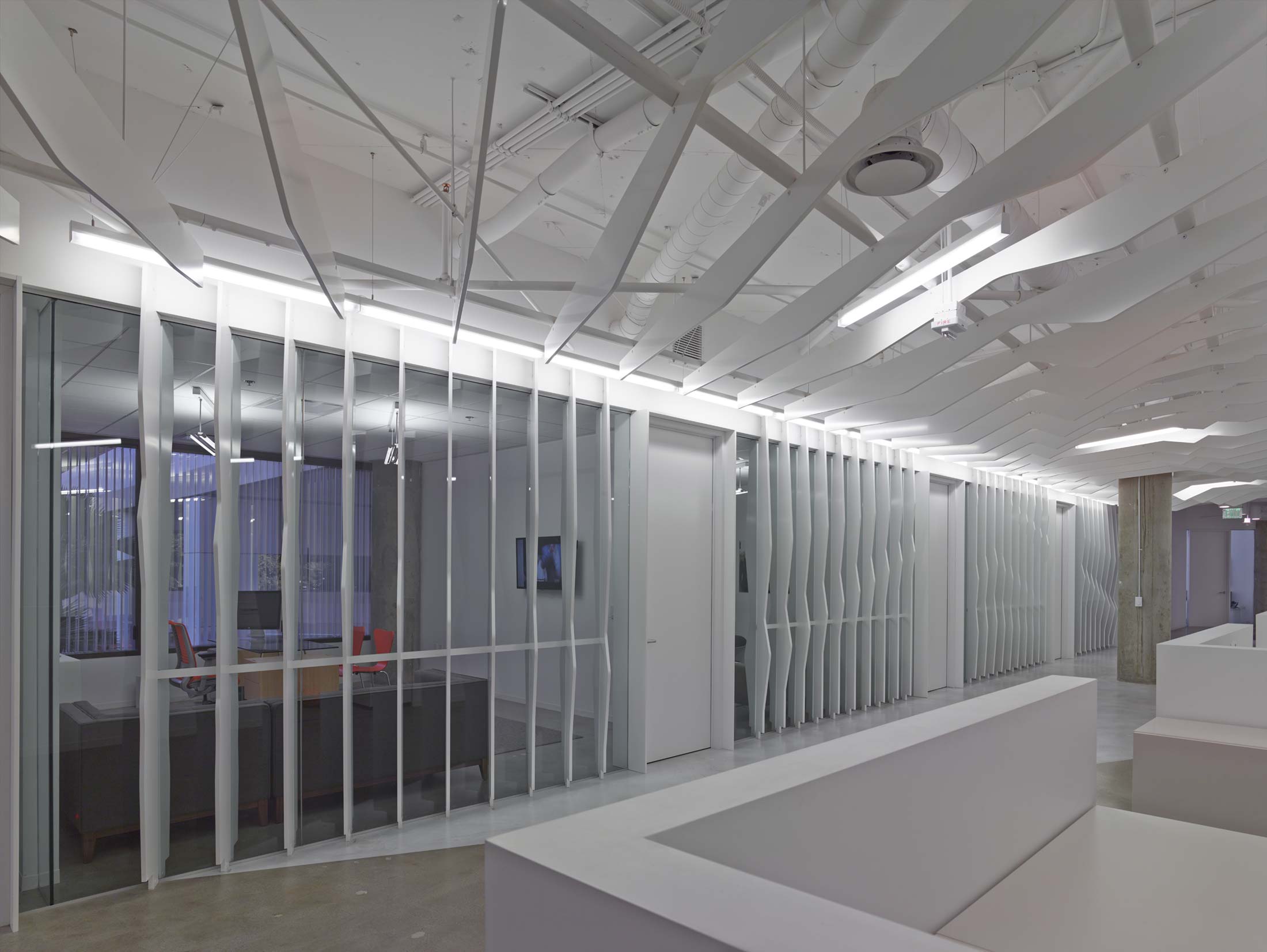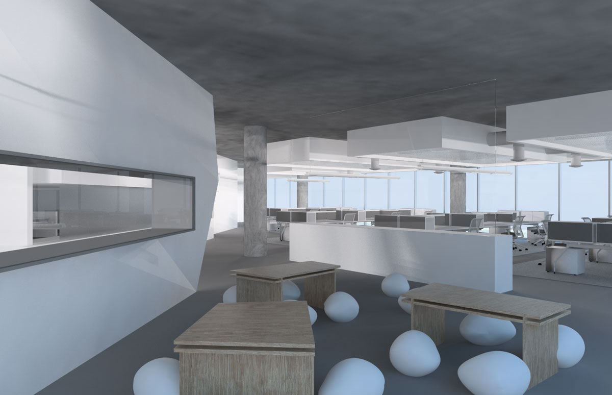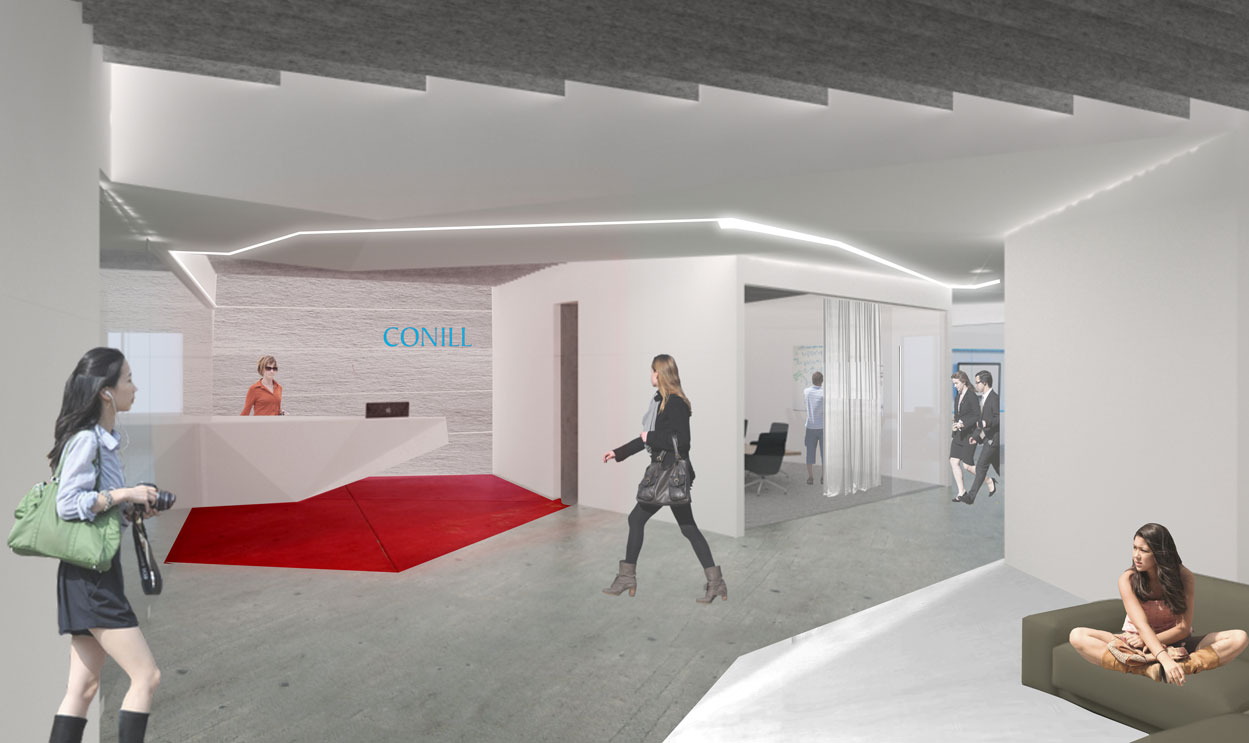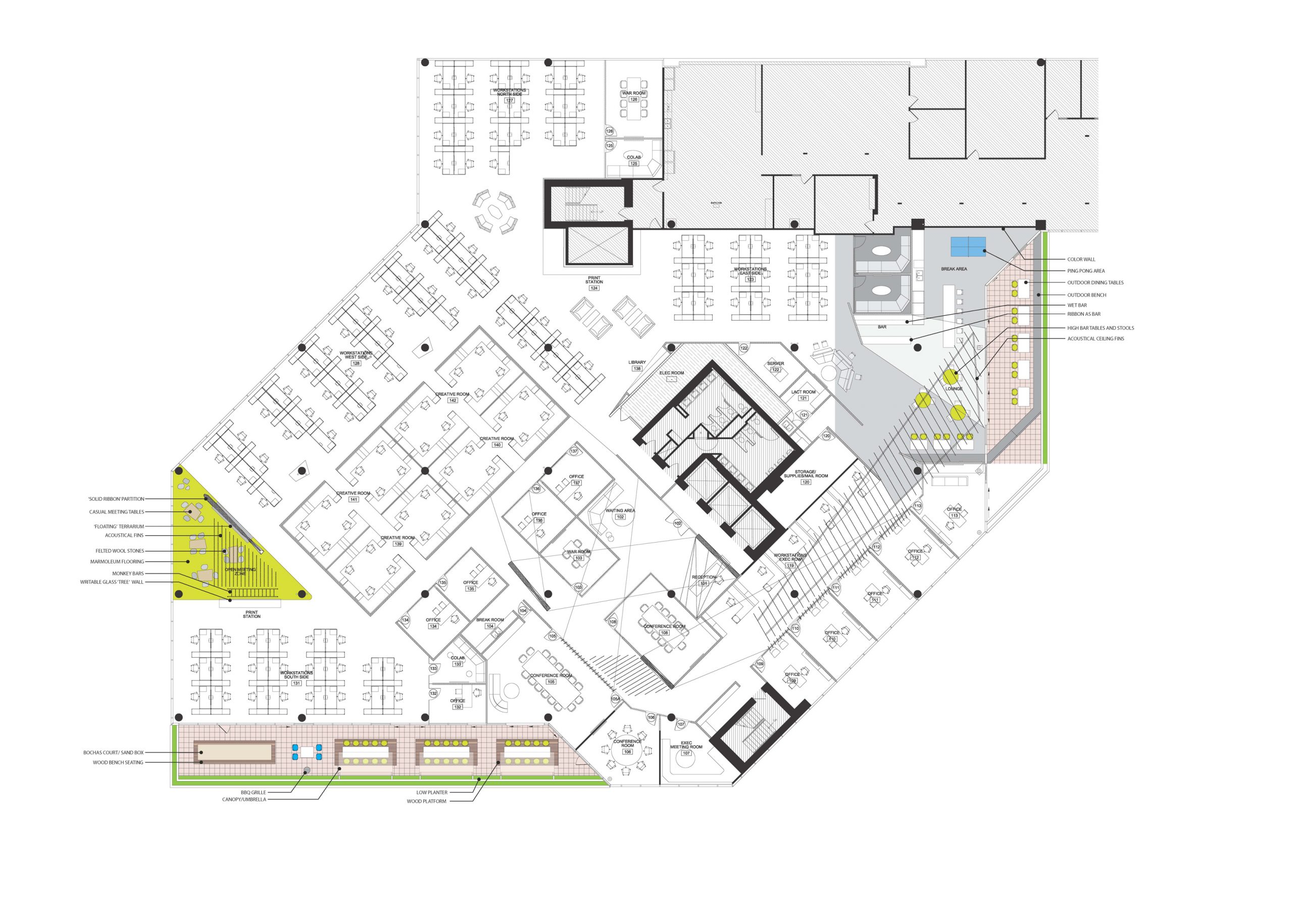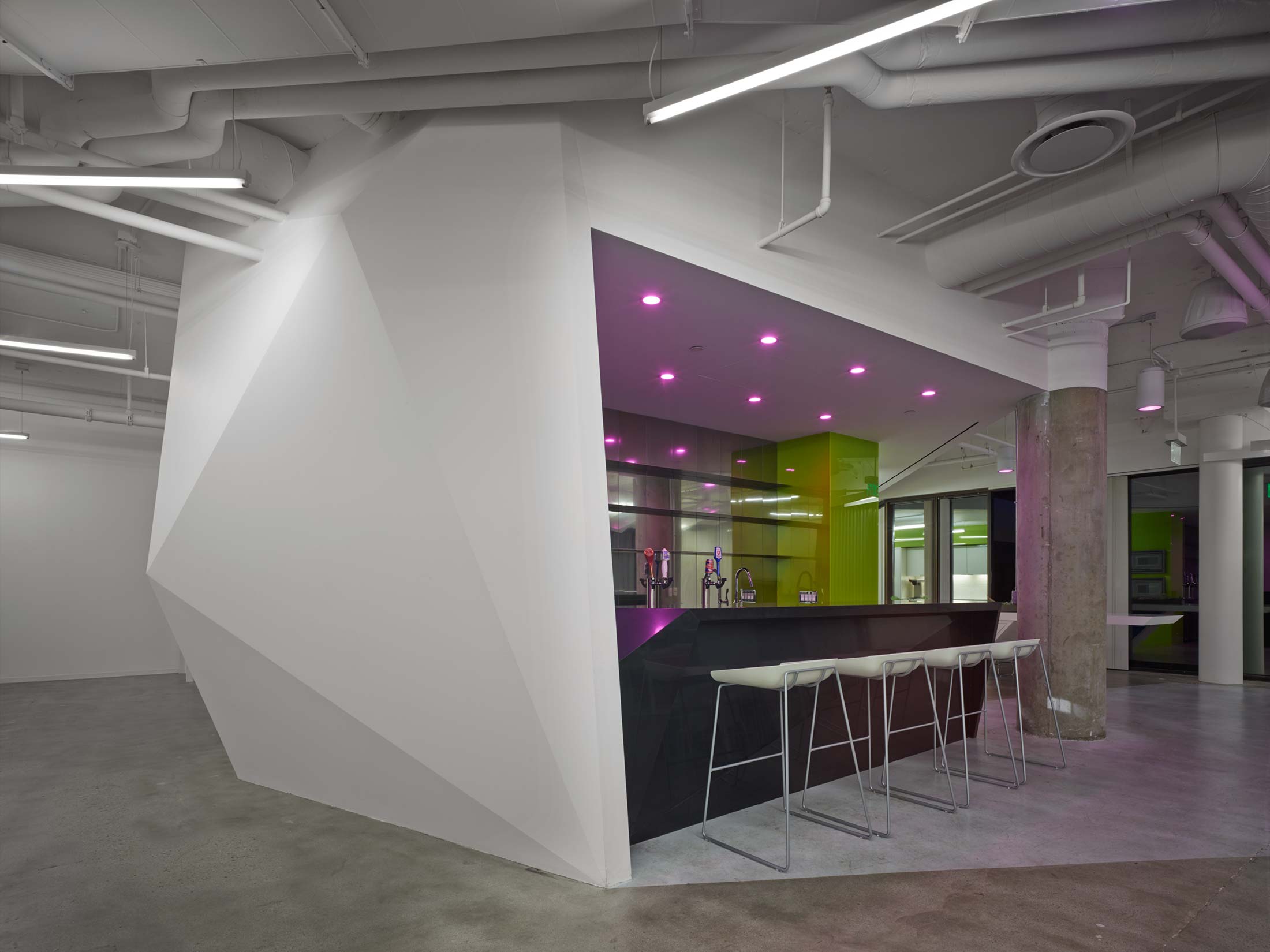 The arrival into the space — as is typical with most offices of this size — begins at the centrally-located elevator core filtering into the main reception area. This space serves as the nucleus of the office providing two arteries leading into either the executive offices/conference rooms or into the main workstations. Using faceted walls and undulating fins, the design creates dynamic circulation throughout which lead into different “places” each possessing unique identities and opportunities for collaboration. These “places” include “the club” — the primary break out space containing a fully-equiped bar, kitchen, ping pong table, and seating; “the park” — a playful break out space adjacent to the workstations integrating monkey bars, whiteboards, terrariums, and fun lounge seating resembling large rocks; and “the beach” — an outdoor terrace with synthetic grass and patio seating spaces for the employees to get some fresh air. In short, the design for Conill created a fun, energetic environment for the young advertising agency to get the creative juices flowing and provide the resources needed for collaboration and innovation to thrive.