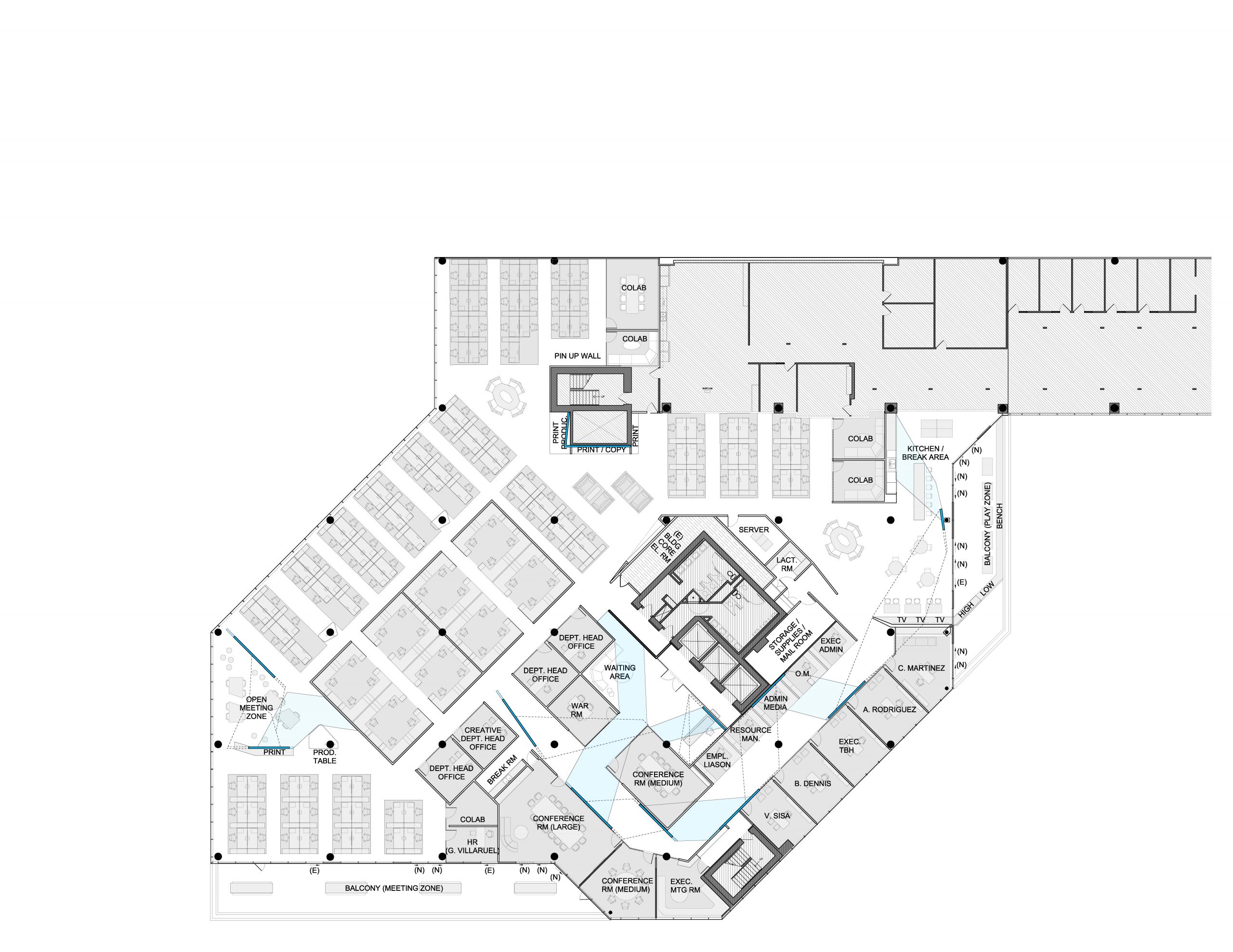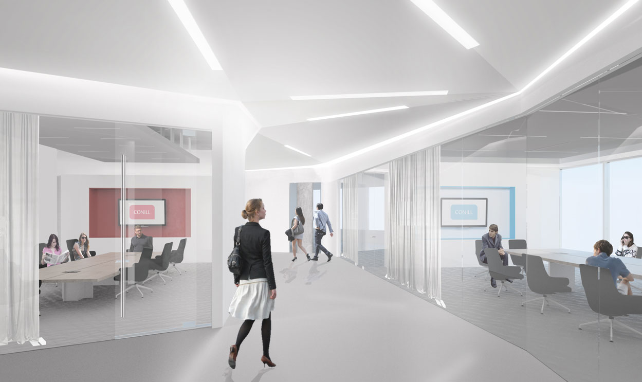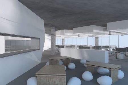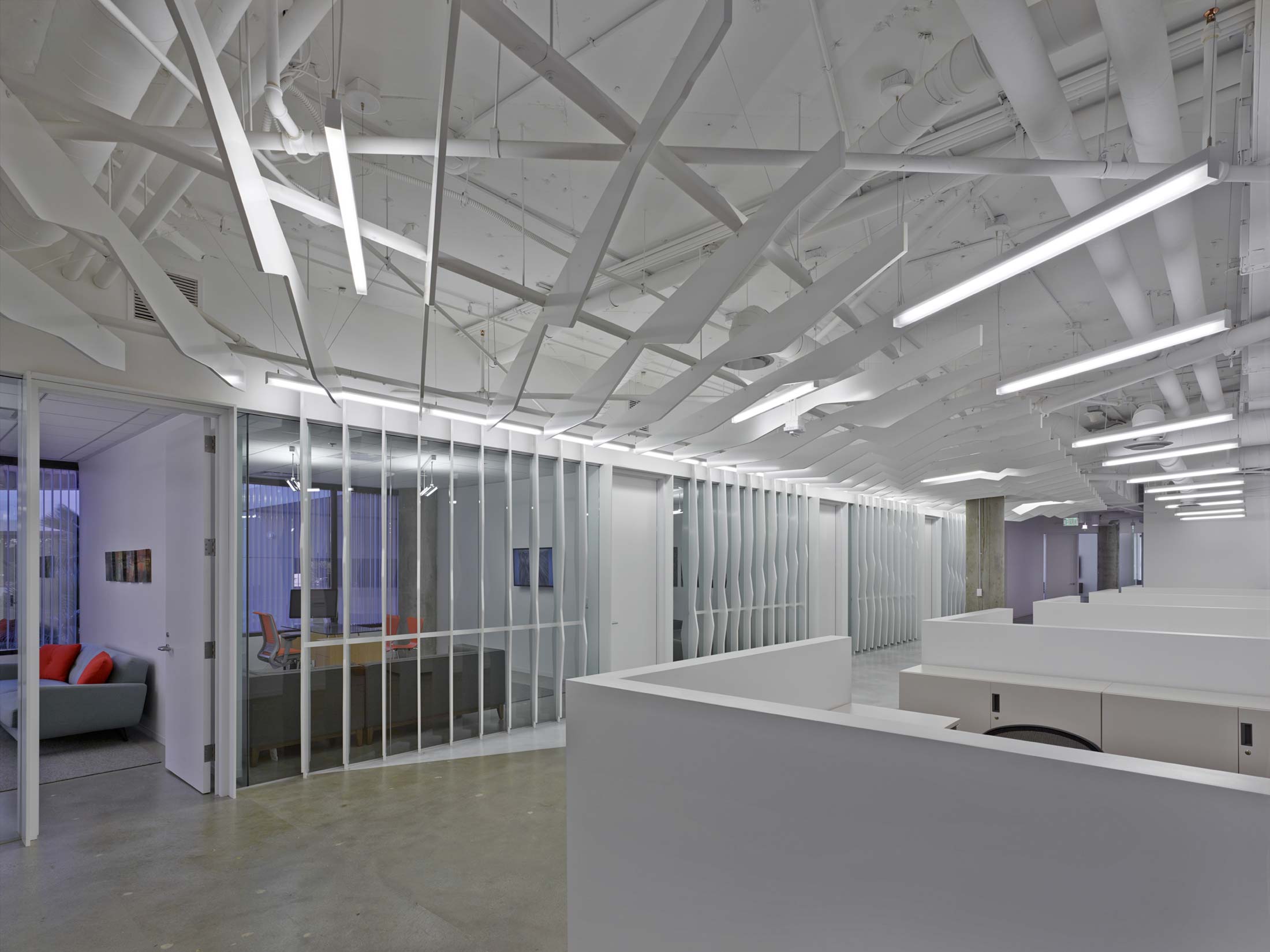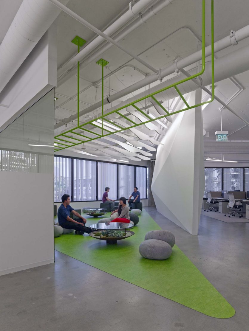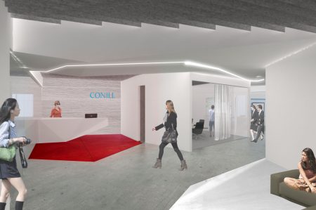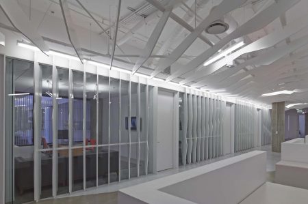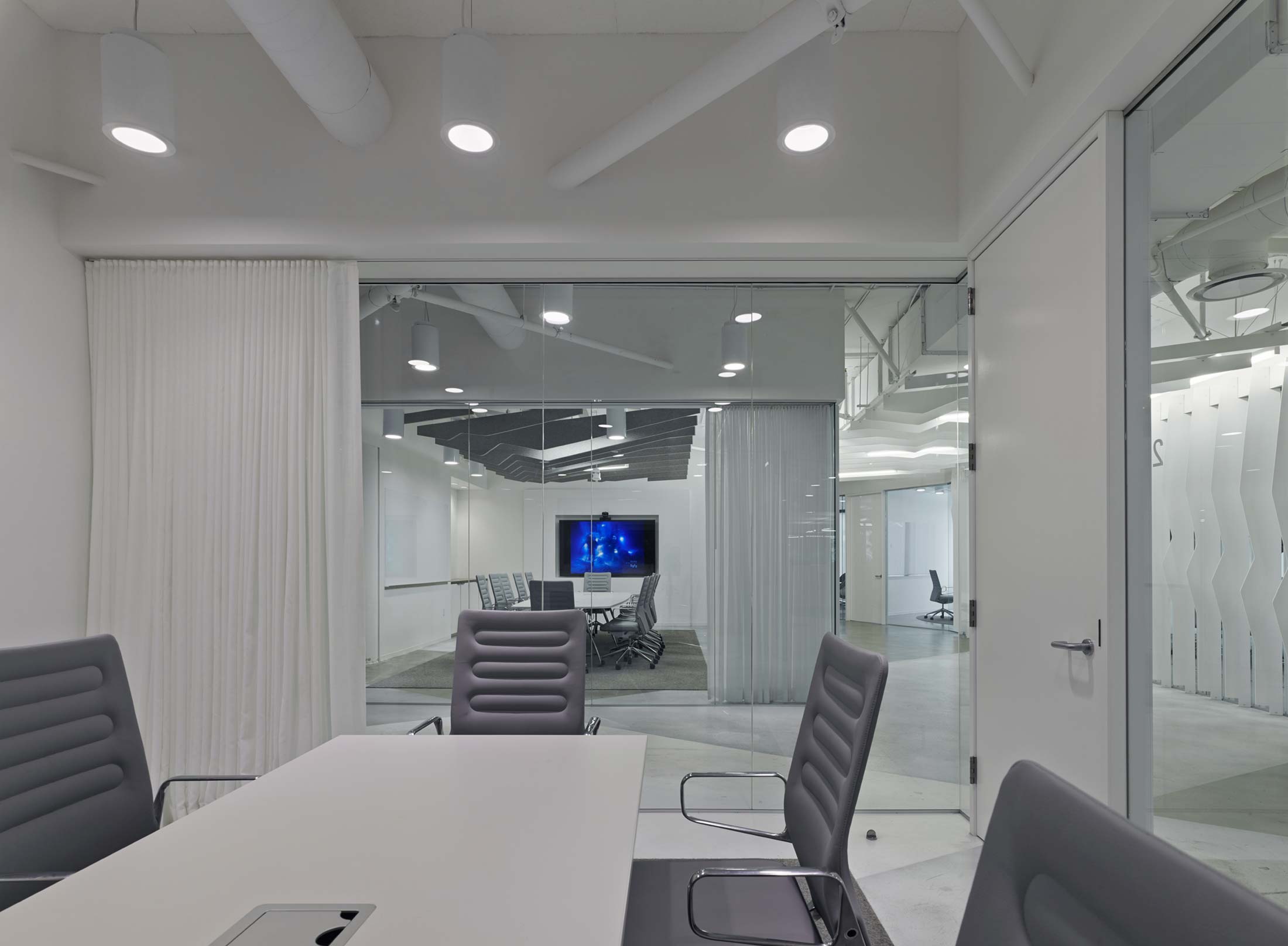 The arrival into the space — as is typical with most offices of this size — begins at the centrally-located elevator core filtering into the main reception area. This space serves as the nucleus of the office providing two arteries leading into either the executive offices/conference rooms or into the main workstations. Using faceted walls and undulating fins, the design creates dynamic circulation throughout which lead into different “places” each possessing unique identities and opportunities for collaboration. These “places” include “the club” — the primary break out space containing a fully-equiped bar, kitchen, ping pong table, and seating; “the park” — a playful break out space adjacent to the workstations integrating monkey bars, whiteboards, terrariums, and fun lounge seating resembling large rocks; and “the beach” — an outdoor terrace with synthetic grass and patio seating spaces for the employees to get some fresh air. In short, the design for Conill created a fun, energetic environment for the young advertising agency to get the creative juices flowing and provide the resources needed for collaboration and innovation to thrive.
