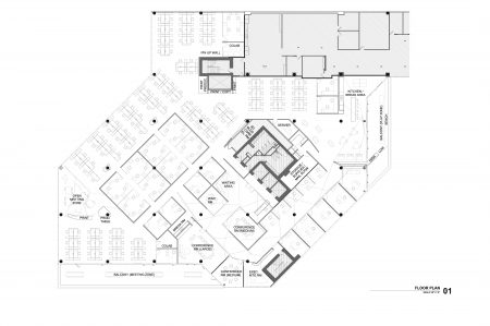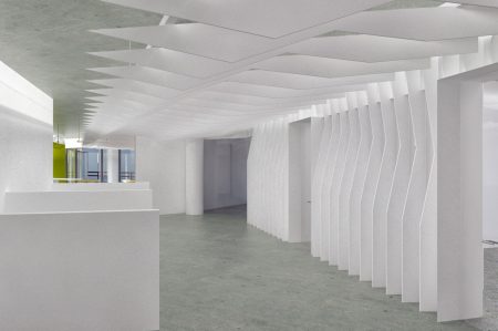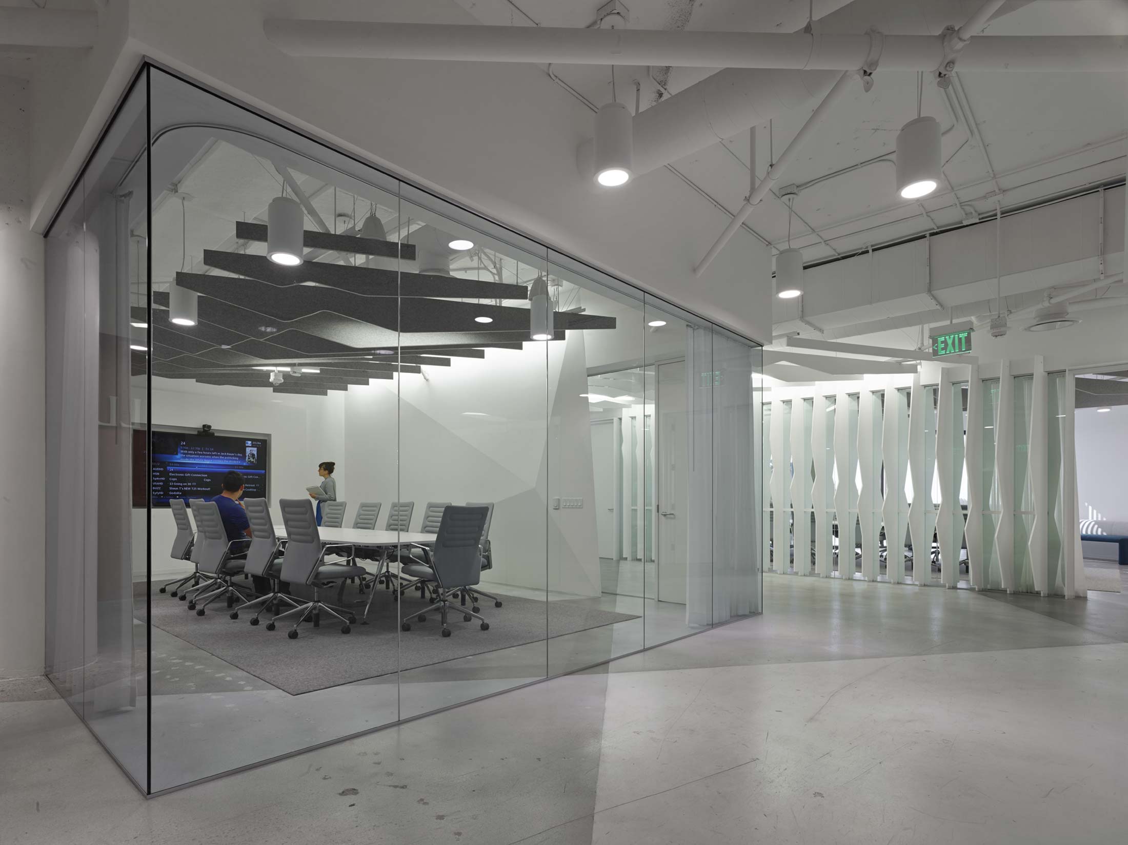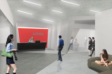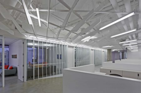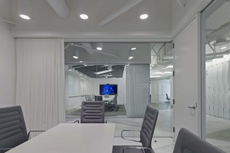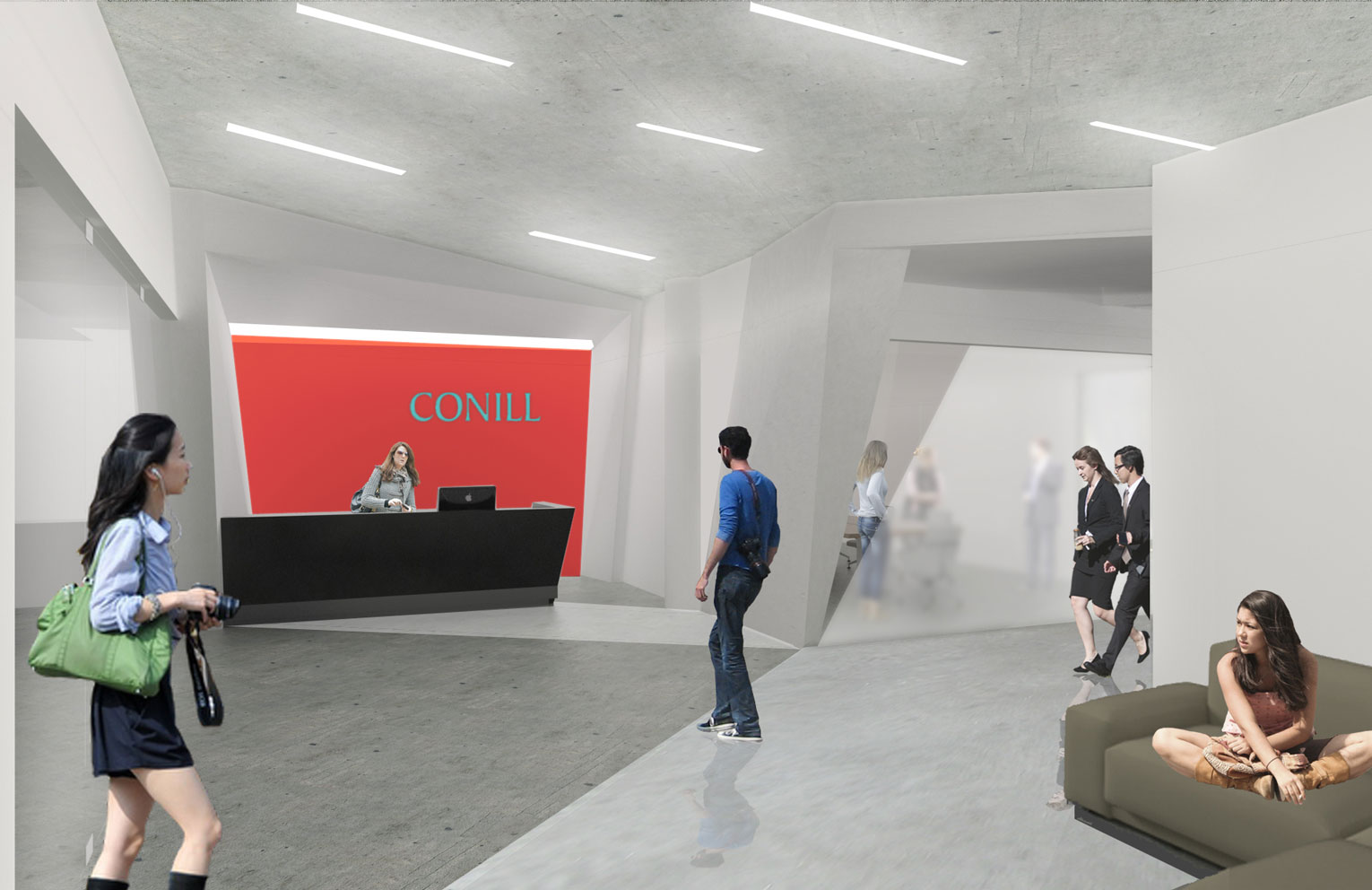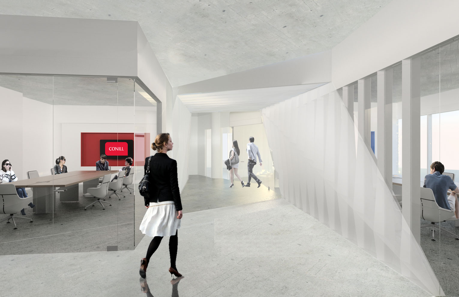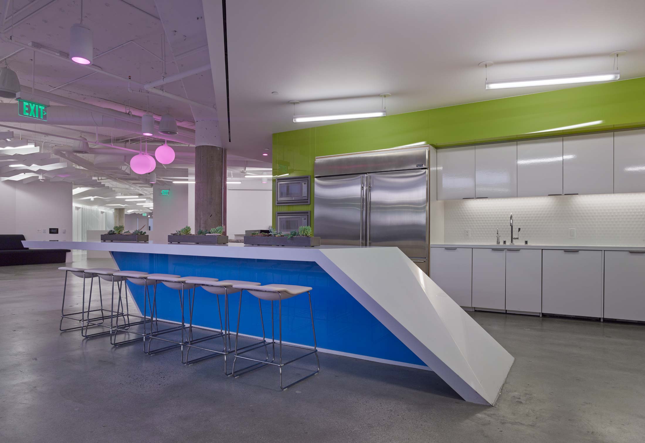 The arrival into the space — as is typical with most offices of this size — begins at the centrally-located elevator core filtering into the main reception area. This space serves as the nucleus of the office providing two arteries leading into either the executive offices/conference rooms or into the main workstations. Using faceted walls and undulating fins, the design creates dynamic circulation throughout which lead into different “places” each possessing unique identities and opportunities for collaboration. These “places” include “the club” — the primary break out space containing a fully-equiped bar, kitchen, ping pong table, and seating; “the park” — a playful break out space adjacent to the workstations integrating monkey bars, whiteboards, terrariums, and fun lounge seating resembling large rocks; and “the beach” — an outdoor terrace with synthetic grass and patio seating spaces for the employees to get some fresh air. In short, the design for Conill created a fun, energetic environment for the young advertising agency to get the creative juices flowing and provide the resources needed for collaboration and innovation to thrive.