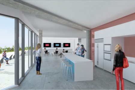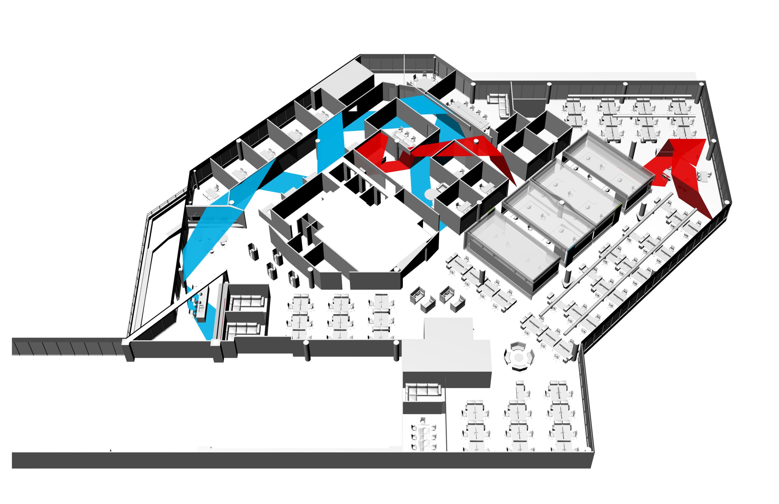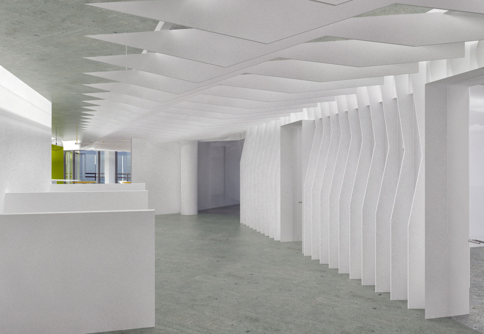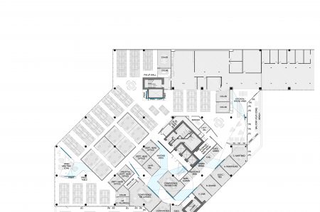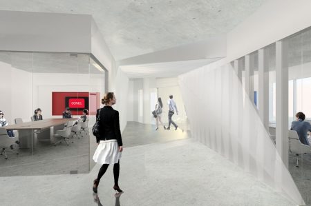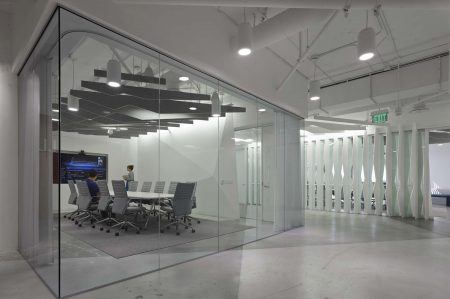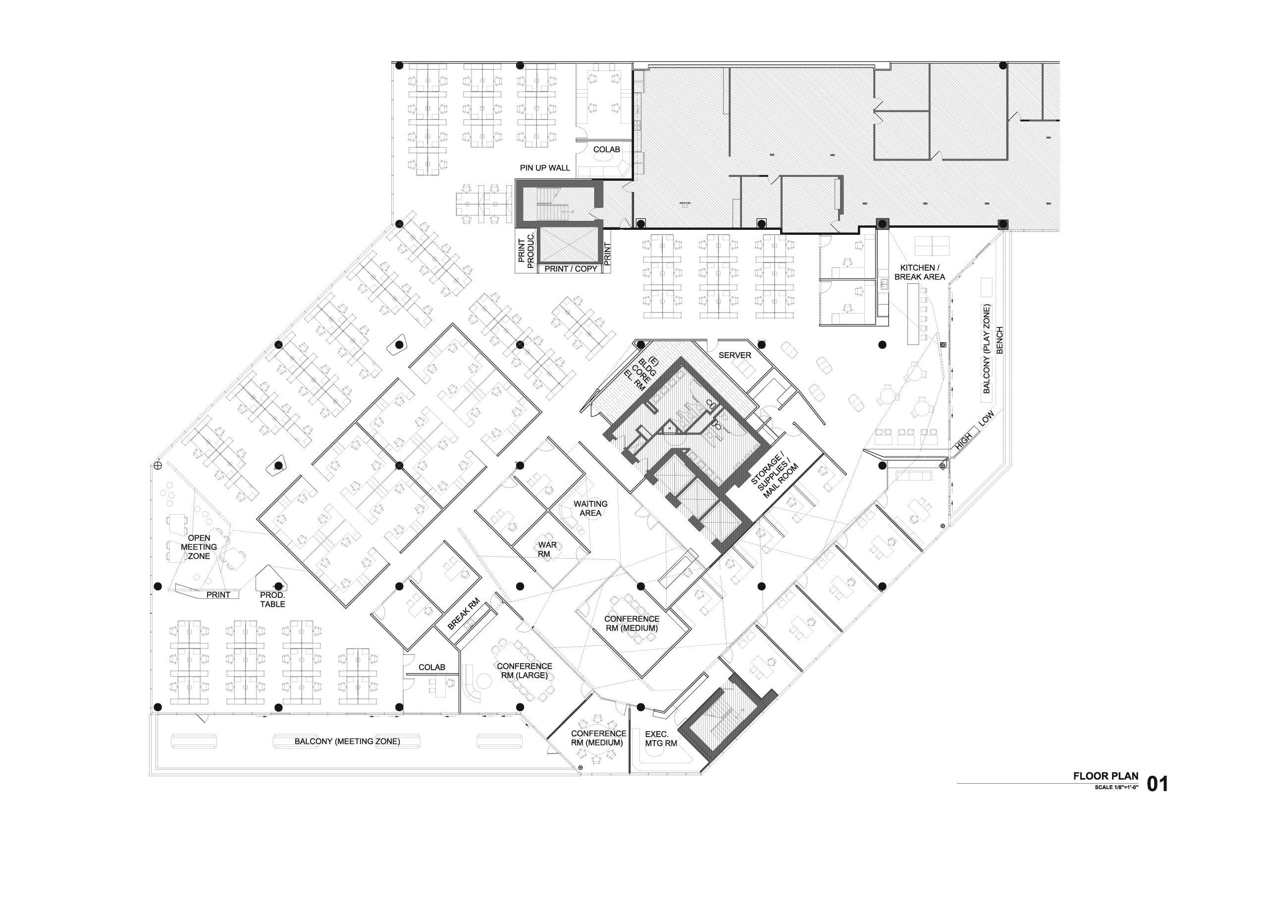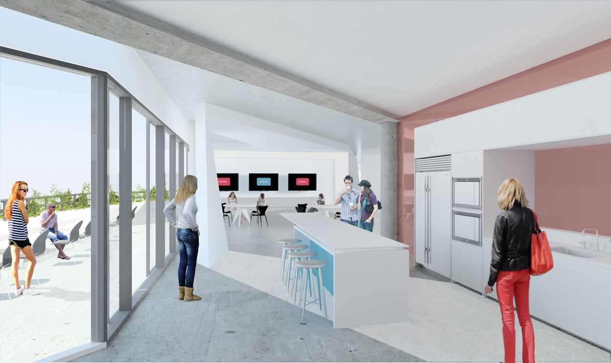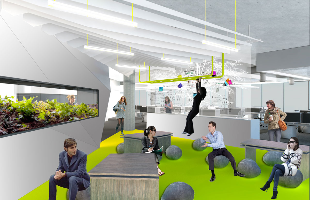 The arrival into the space — as is typical with most offices of this size — begins at the centrally-located elevator core filtering into the main reception area. This space serves as the nucleus of the office providing two arteries leading into either the executive offices/conference rooms or into the main workstations. Using faceted walls and undulating fins, the design creates dynamic circulation throughout which lead into different “places” each possessing unique identities and opportunities for collaboration. These “places” include “the club” — the primary break out space containing a fully-equiped bar, kitchen, ping pong table, and seating; “the park” — a playful break out space adjacent to the workstations integrating monkey bars, whiteboards, terrariums, and fun lounge seating resembling large rocks; and “the beach” — an outdoor terrace with synthetic grass and patio seating spaces for the employees to get some fresh air. In short, the design for Conill created a fun, energetic environment for the young advertising agency to get the creative juices flowing and provide the resources needed for collaboration and innovation to thrive.