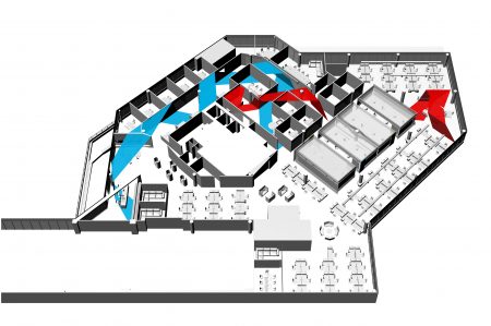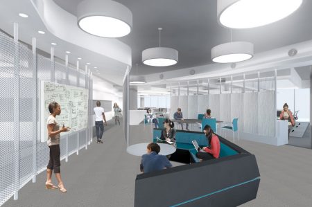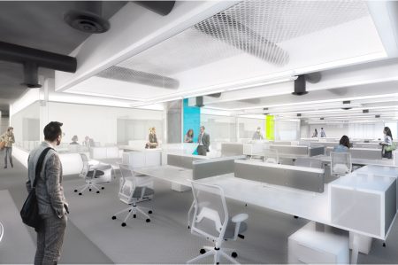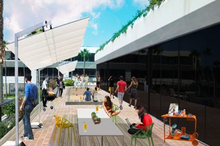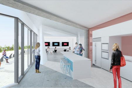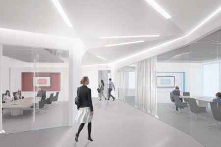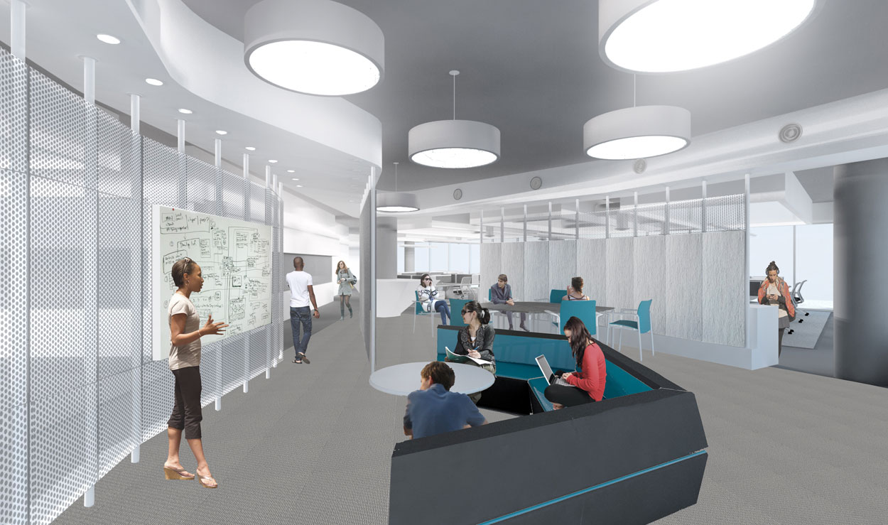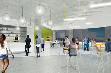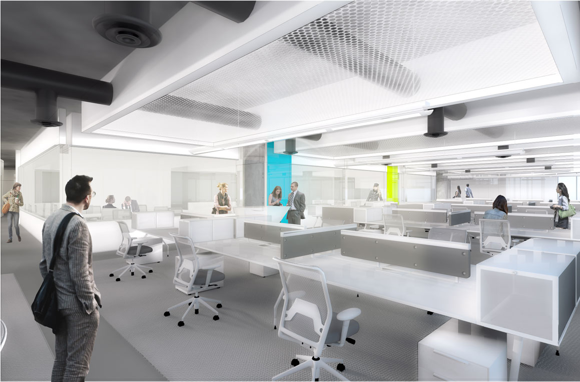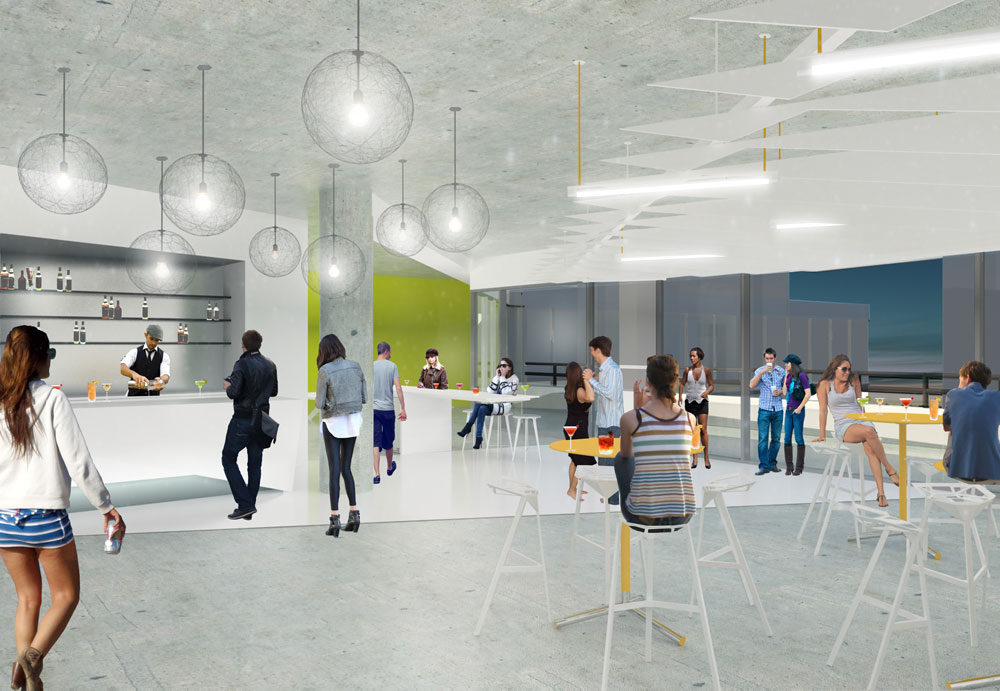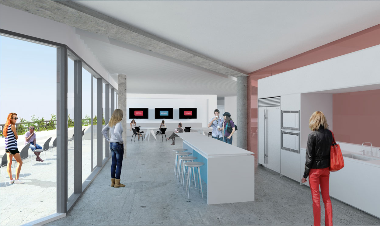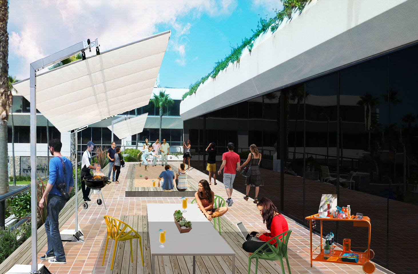 The arrival into the space — as is typical with most offices of this size — begins at the centrally-located elevator core filtering into the main reception area. This space serves as the nucleus of the office providing two arteries leading into either the executive offices/conference rooms or into the main workstations. Using faceted walls and undulating fins, the design creates dynamic circulation throughout which lead into different “places” each possessing unique identities and opportunities for collaboration. These “places” include “the club” — the primary break out space containing a fully-equiped bar, kitchen, ping pong table, and seating; “the park” — a playful break out space adjacent to the workstations integrating monkey bars, whiteboards, terrariums, and fun lounge seating resembling large rocks; and “the beach” — an outdoor terrace with synthetic grass and patio seating spaces for the employees to get some fresh air. In short, the design for Conill created a fun, energetic environment for the young advertising agency to get the creative juices flowing and provide the resources needed for collaboration and innovation to thrive.