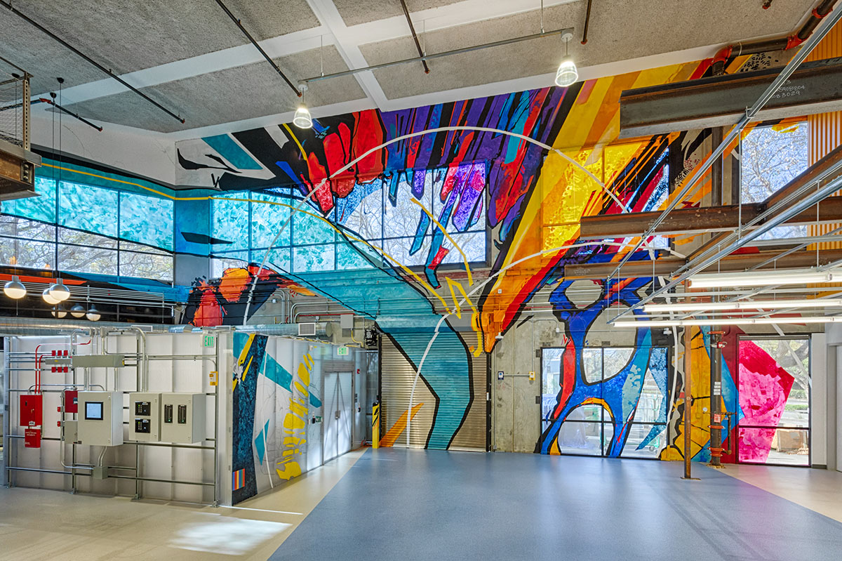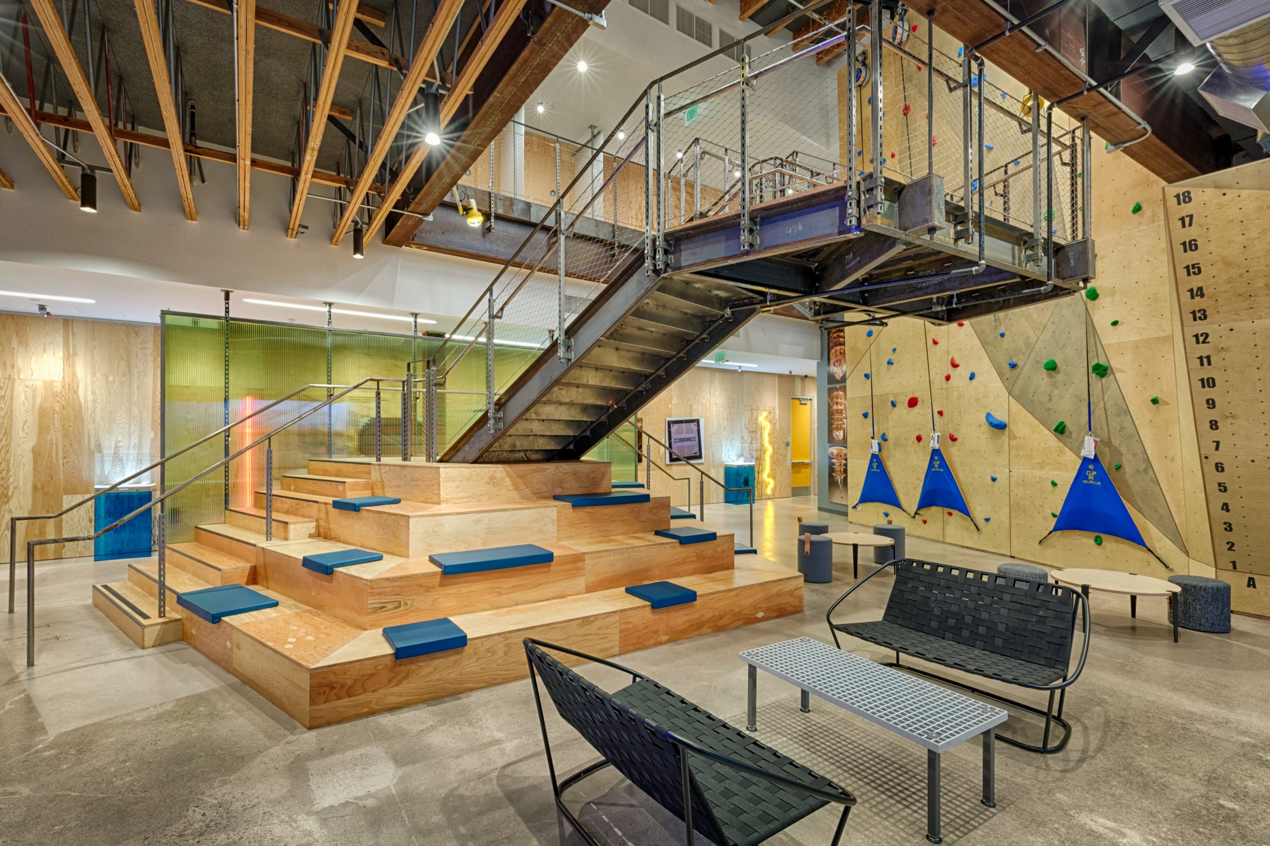 Defying the normal bounds of the suburban office building, both natural materials and natural structures have influenced the spaces’ design. Tactile layered graphics are carved into the plywood walls. A textured wall panel inspired by the framework of a bristlecone pinecone greets you adjacent to an indoor climbing wall linking the 1st and 2nd-floor open lobby. The space incorporates the creativity in “craft” and seamlessly compliments it with the most cutting-edge tools and systems that are helping to engineer and assemble the developing pieces of world-changing technology.