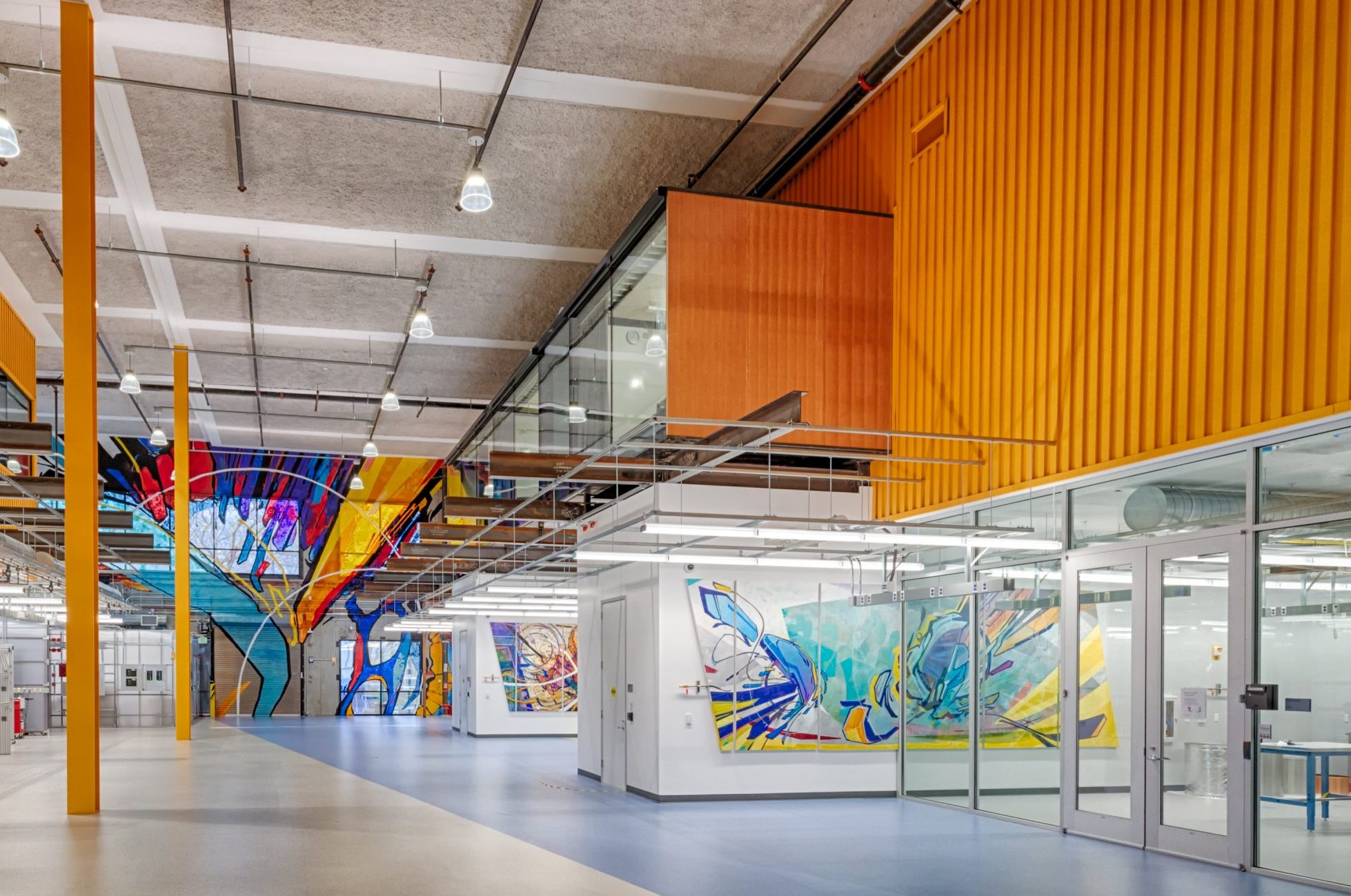 Developing technology is a perpetual work in progress. It was vitally important to the client to develop a space that could change as research and need continued to dictate. All MEP infrastructure was coordinated to be plug and play and carefully concealed throughout. The bold graphics and textural elements pull focus to the design and away from the infrastructure and engineering elements of a building stretched to its seams with emerging technologies.
