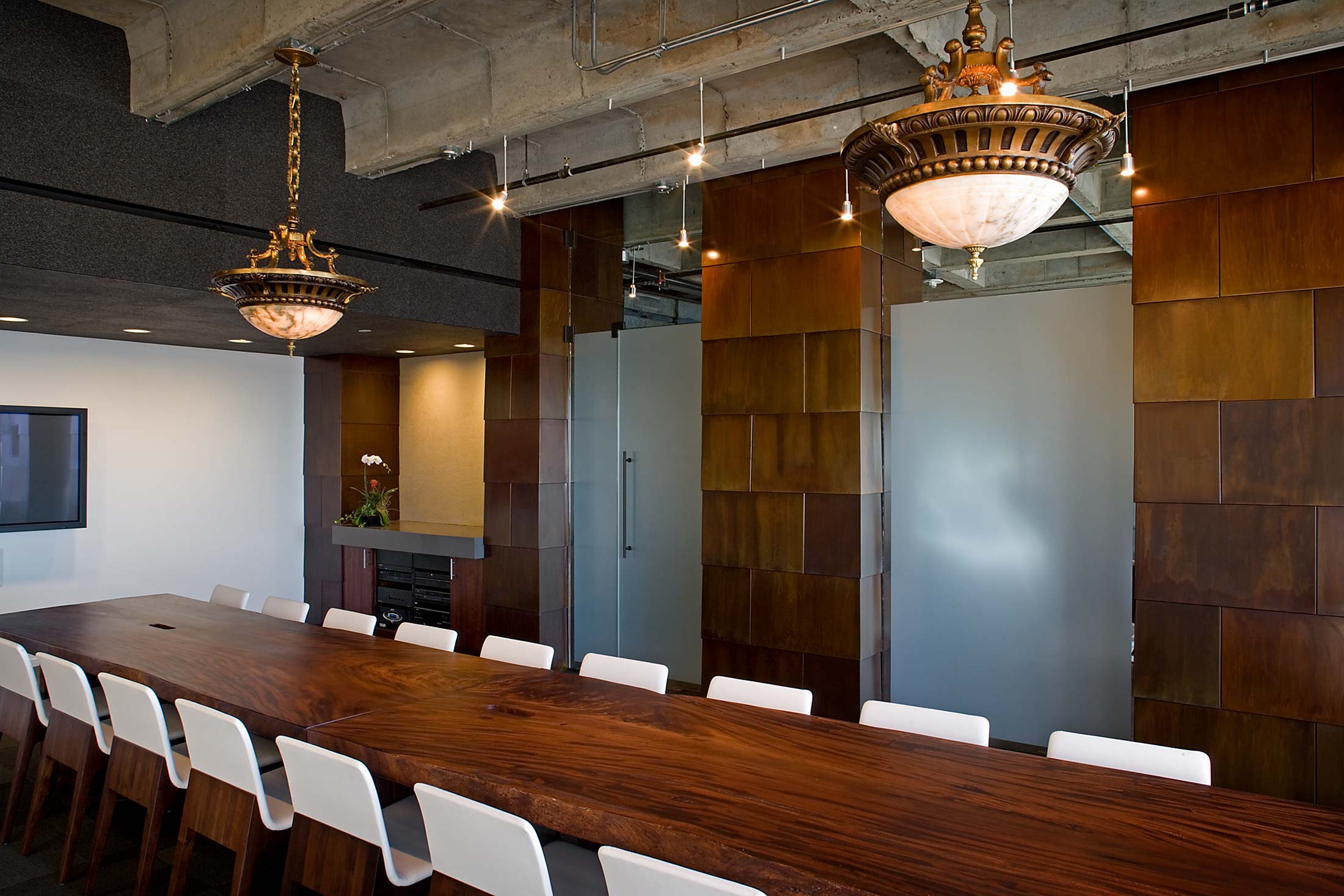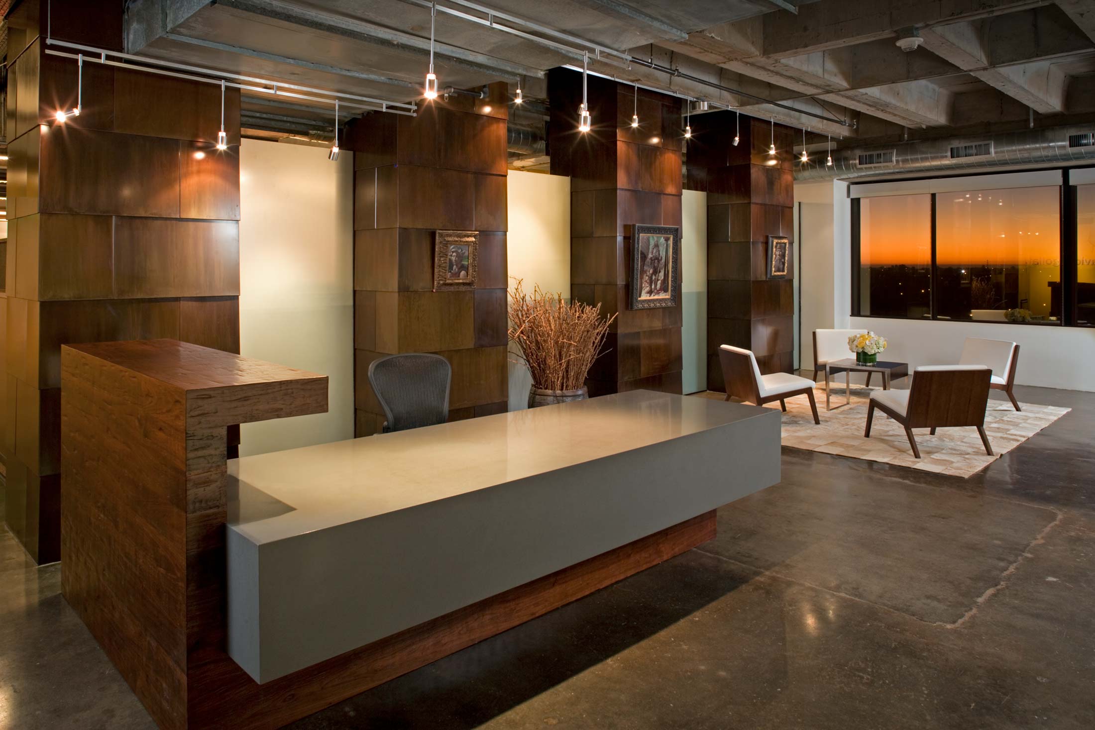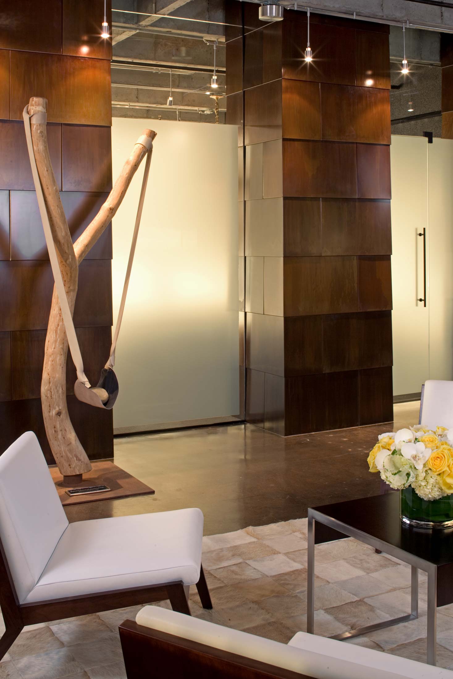 The illusionistic qualities (the aura) of the old book, as well as the organizational strategies that promote creative, playful exchange, generated several operating rules consistently executed in the design. For example, many contemporary office spaces use “thin,” shiny, veneer surfaces whose perceptual attributes are opposed to the appearance of lasting permanence. The office design tried instead to suggest a “thickness” of materials, a physical weight and immediacy of rough material surface.