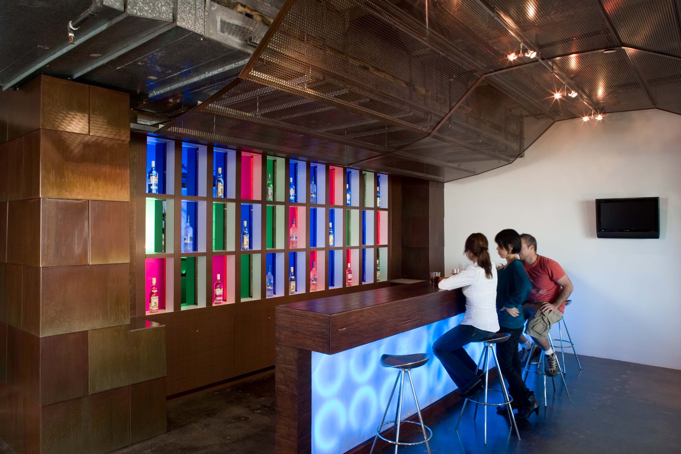 The existing building, housing these offices, was designed to contain a predictable concentric layout of perimeter offices. In order to level the resulting hierarchy and to make room for still more exciting play spaces, the Architects planned the offices as a series of open and closed spaces. The closed spaces use hard walls to contain individual offices, “war rooms” and various service functions, while the open spaces are distinguished by soft boundaries, to house office landscapes or spaces that accelerate activities and unforeseen events, like “water cooler chats.” In turn, these open spaces become familiar performative areas of play and creative collaboration. The bar, coffee counter, informal meeting area, reading and game areas, are all spatially framed by ornamental lighting, perforated metal canopies, curtains and textiles — surfaces intended to counter the rough, brutal materials of the exposed building structure.