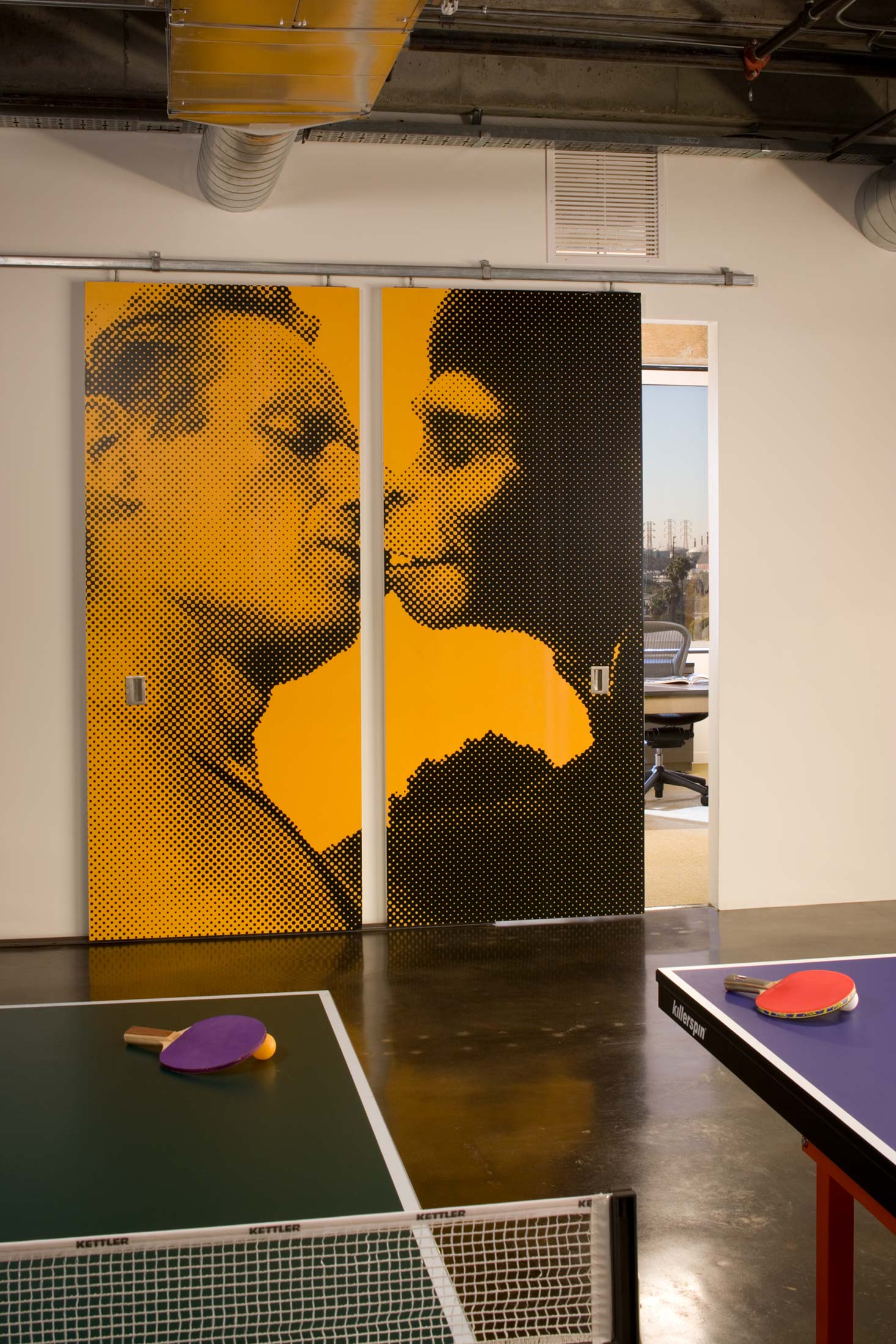The closed doors of the individual offices remain the last formidable sign of hierarchy and control that limits this informal exchange. In the design of David and Goliath they too become part of the architectural concept and instruments of communication. Each sliding office door is printed with a partial image; and when any two doors are open, the staff is rewarded with a complete image concept. The precise content of the door graphics was itself the product of a vibrant dialogue between Shubin + Donaldson and “creative staff” within the advertising agency.