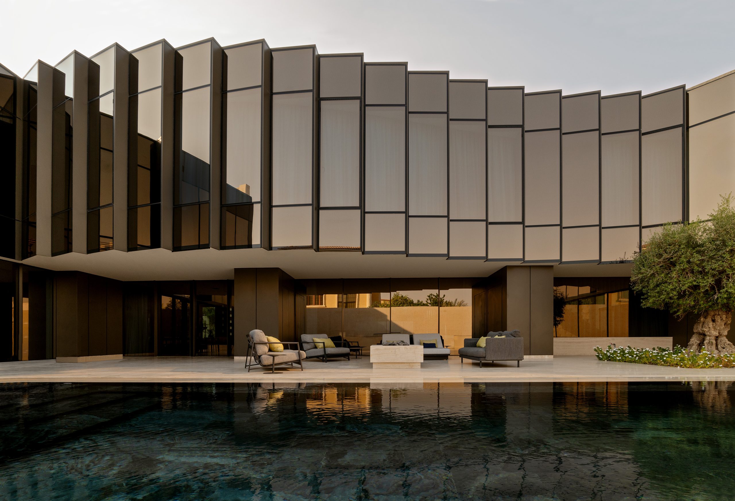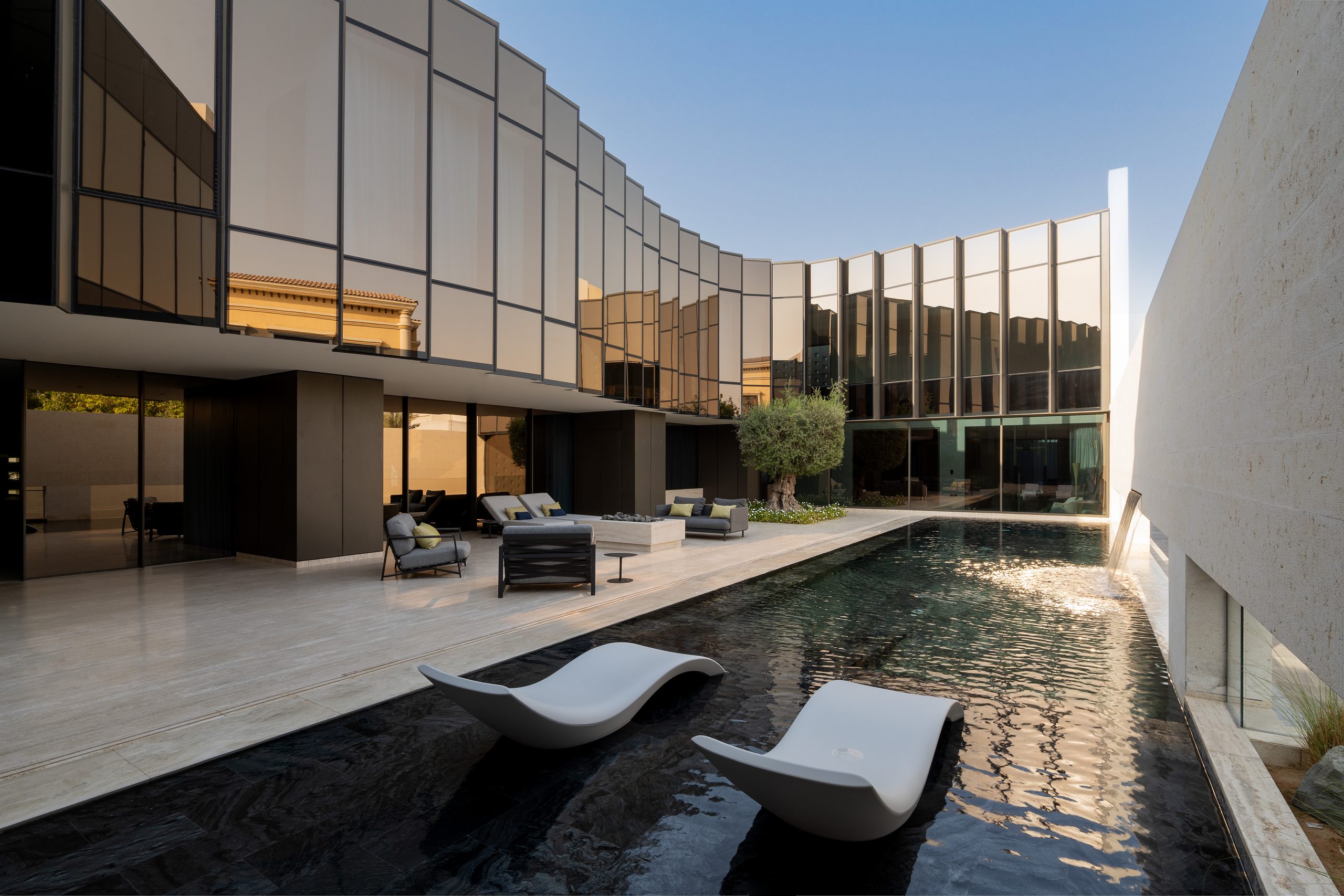 The building is oriented using its taller mass to passively protect the inner courtyard from the dominant direction of wind and sandstorms while also maximizing valuable shading throughout the day. Other portions of the building volume are arranged to visually screen the neighboring structures and reinforce a framed view toward the sky. The view over a dark bottomed swimming pool adds visual depth to the courtyard experience as water spills over an infinity-edge towards the descending driveway buffering the outer wall.