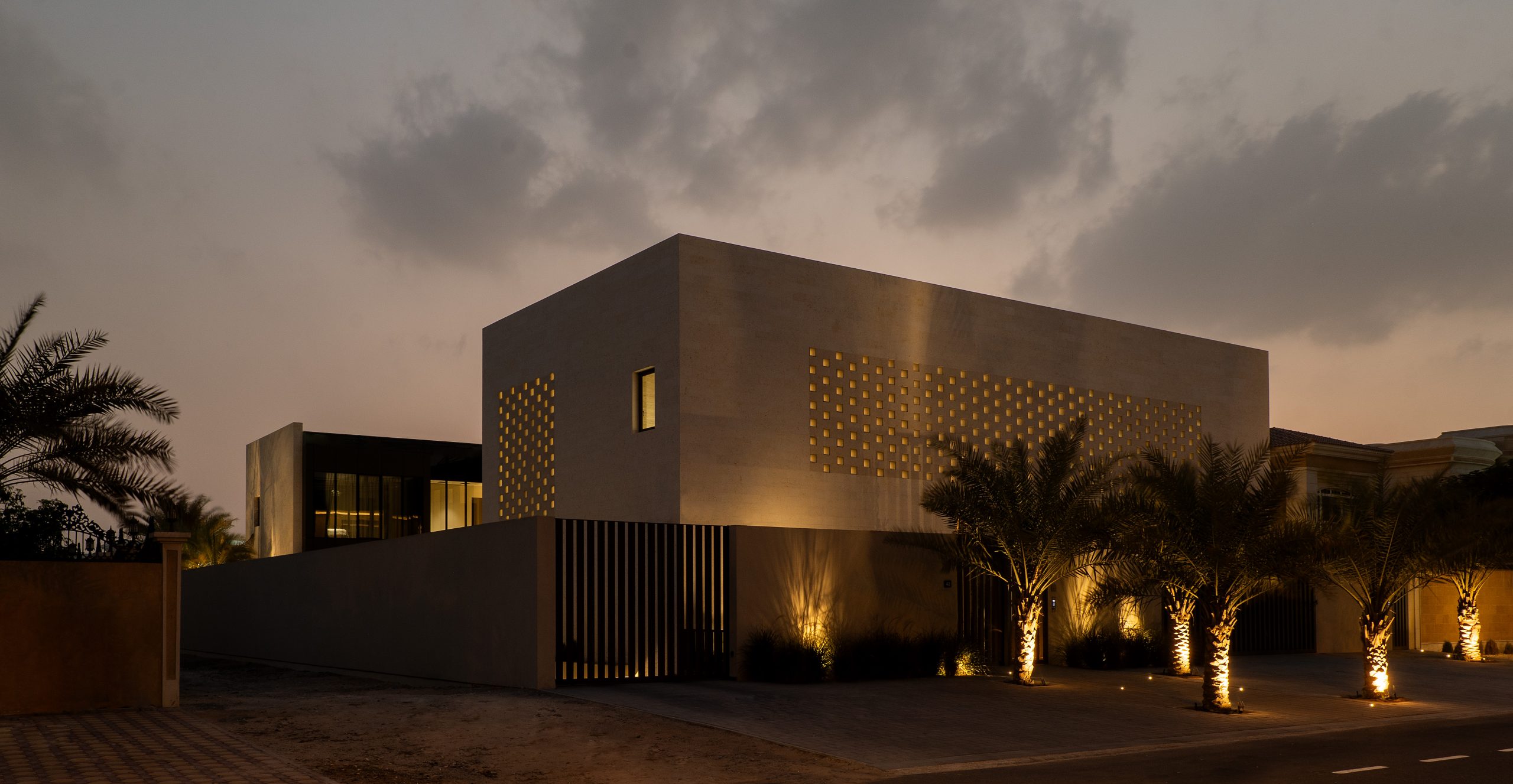 This 1,700 m2 single-family home nestles discreetly into a community of private villas, each surrounded by 3-meter high boundary walls. The simplicity of its serene stone-clad exterior is expressed as flush, planar, and protective. At the same time, areas of perforated openings punctuate the surfaces, hinting at the interior and glowing lantern-like in the evening. The solid exterior appearance is contrasted by a simple curved interior edge that defines the hidden courtyard and recalls the edges of the wind-swept dunes of the nearby desert. One moves through a concentricity of protective ‘shell’ walls from exterior to interior, revealing an interior garden oasis.