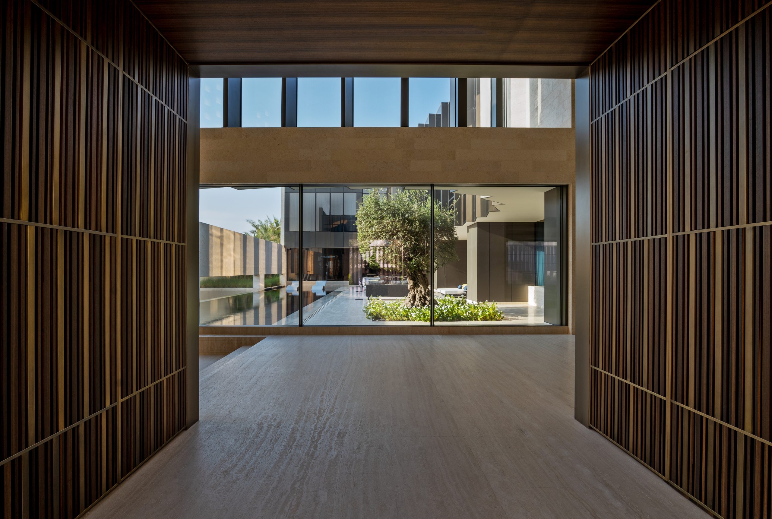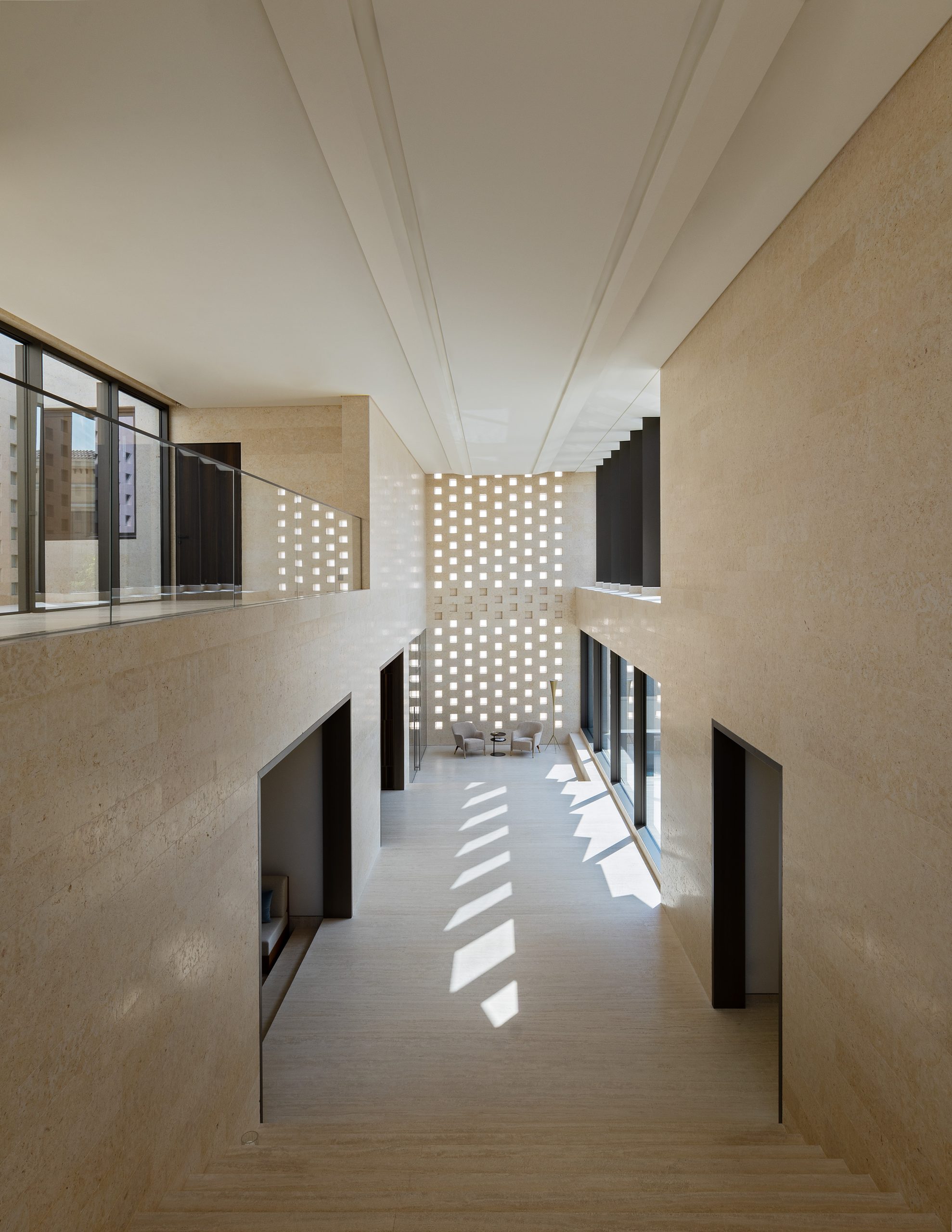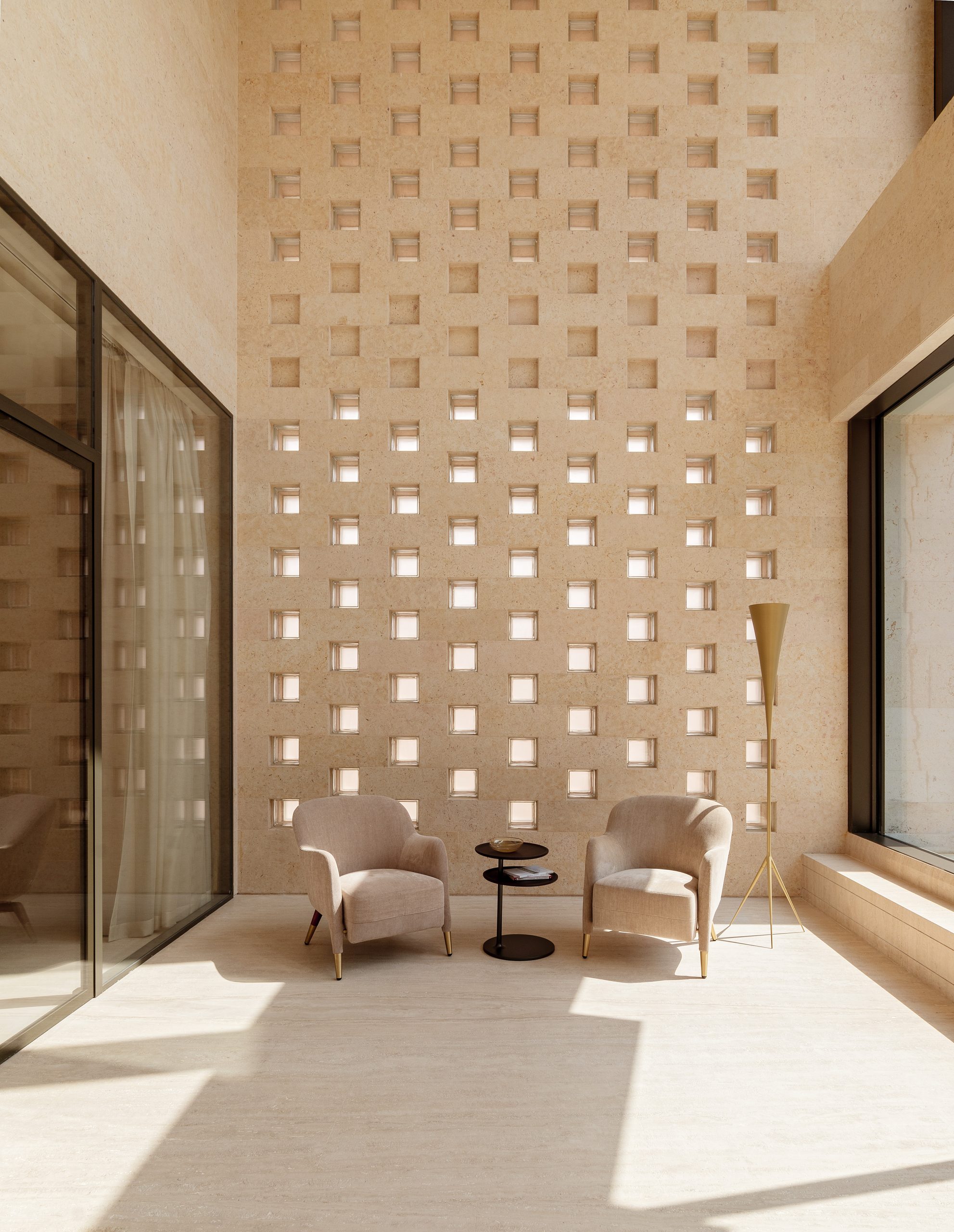 This 1,700 m2 single-family home nestles discreetly into a community of private villas, each surrounded by 3-meter high boundary walls. The simplicity of its serene stone-clad exterior is expressed as flush, planar, and protective. At the same time, areas of perforated openings punctuate the surfaces, hinting at the interior and glowing lantern-like in the evening. The solid exterior appearance is contrasted by a simple curved interior edge that defines the hidden courtyard and recalls the edges of the wind-swept dunes of the nearby desert. One moves through a concentricity of protective ‘shell’ walls from exterior to interior, revealing an interior garden oasis.