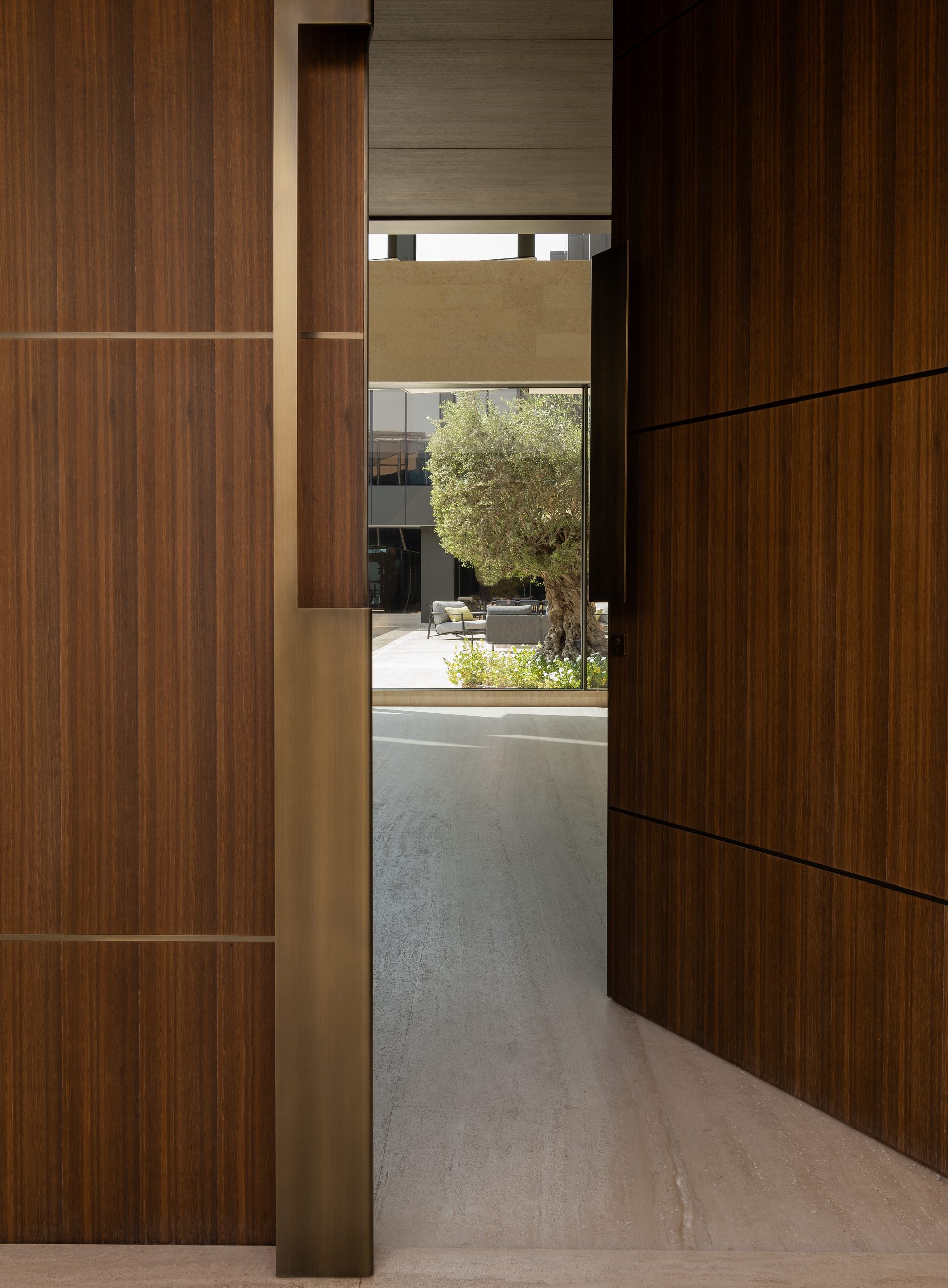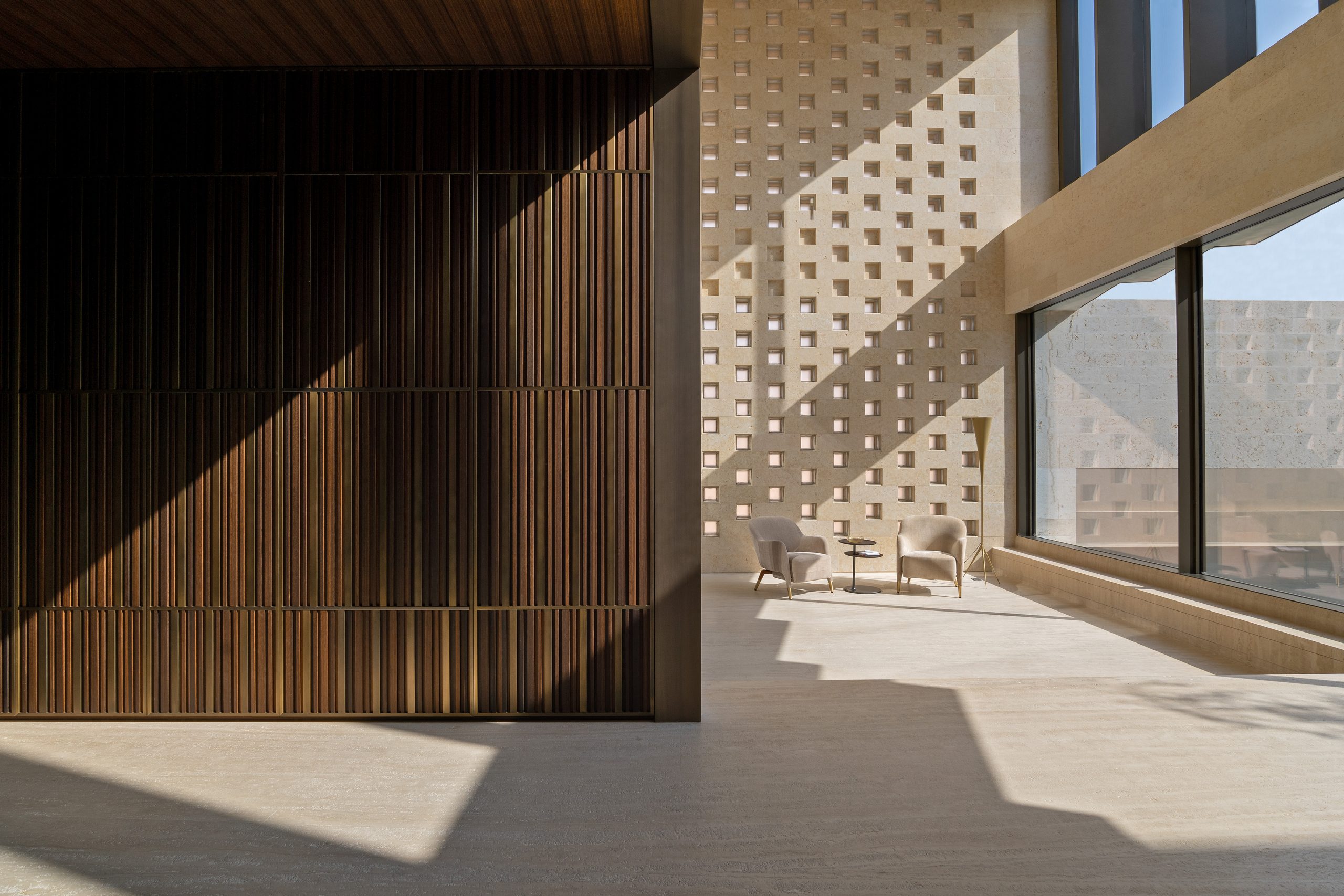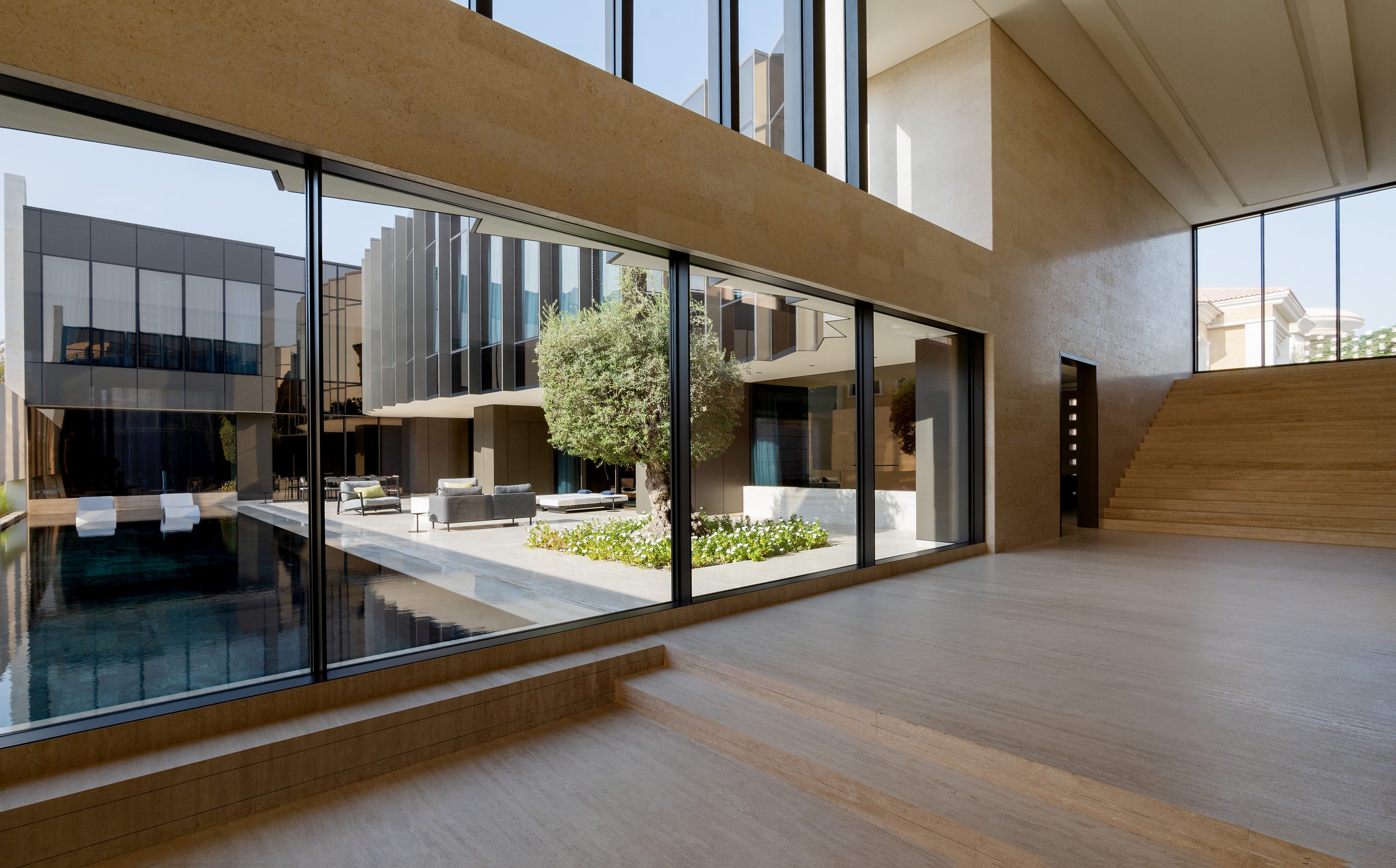 This 1,700 m2 single-family home nestles discreetly into a community of private villas, each surrounded by 3-meter high boundary walls. The simplicity of its serene stone-clad exterior is expressed as flush, planar, and protective. At the same time, areas of perforated openings punctuate the surfaces, hinting at the interior and glowing lantern-like in the evening. The solid exterior appearance is contrasted by a simple curved interior edge that defines the hidden courtyard and recalls the edges of the wind-swept dunes of the nearby desert. One moves through a concentricity of protective ‘shell’ walls from exterior to interior, revealing an interior garden oasis.