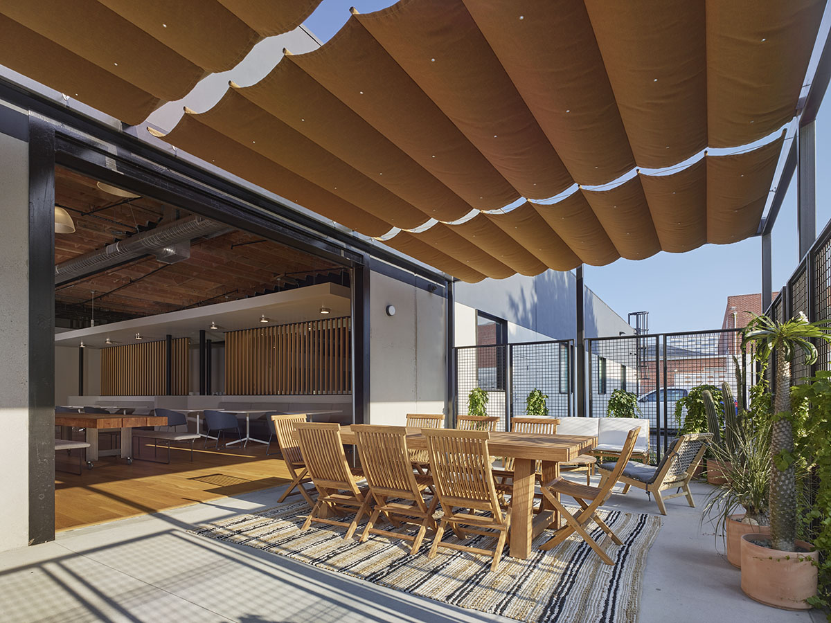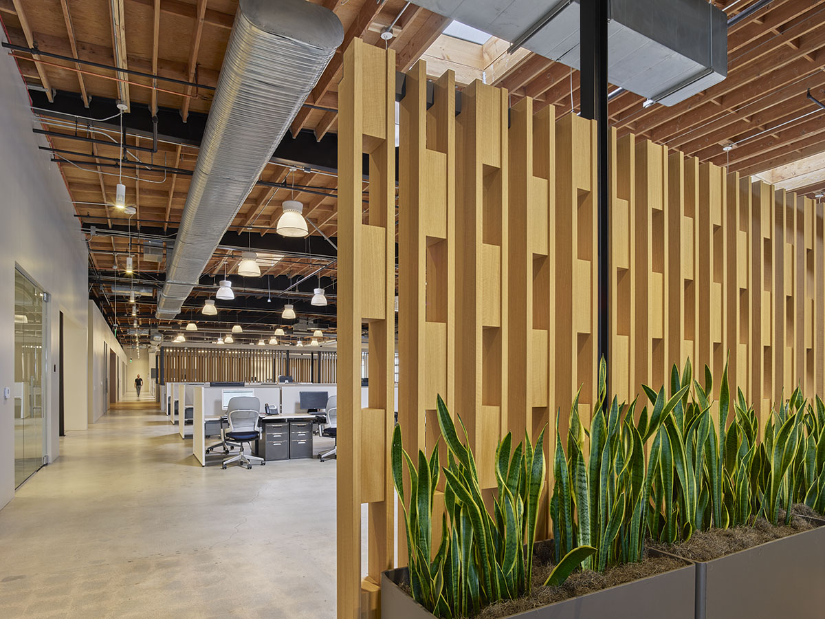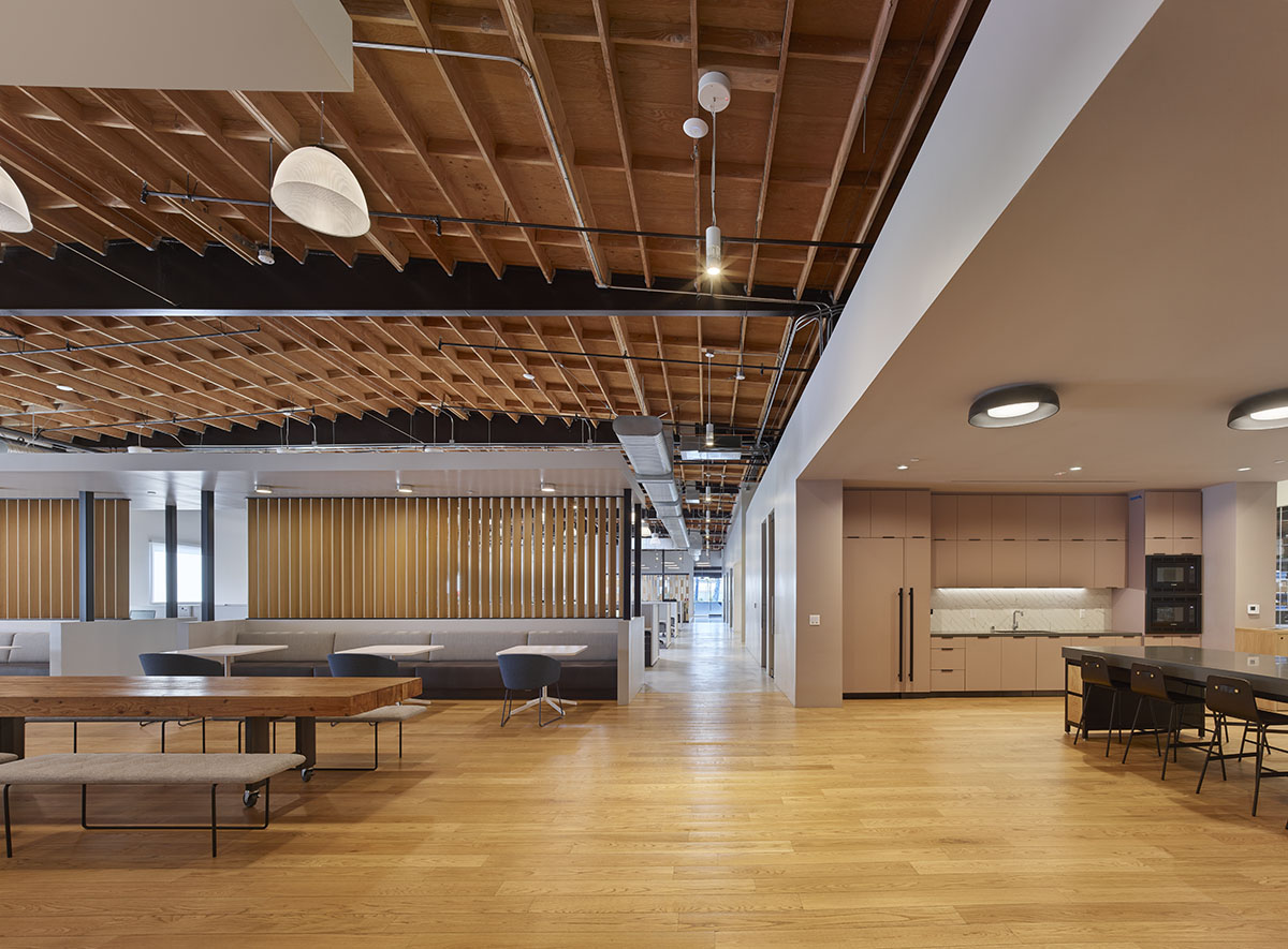 To further denote the spatial uses, communal spaces feature framed wood flooring and screened partitions made out of wooden fins which acts as a barrier between the public salon area. The communal eating area and kitchen are denoted through mirrored wooden fin-screens, creating a sense of privacy from the open office spaces while acting as a sound barrier within the office.