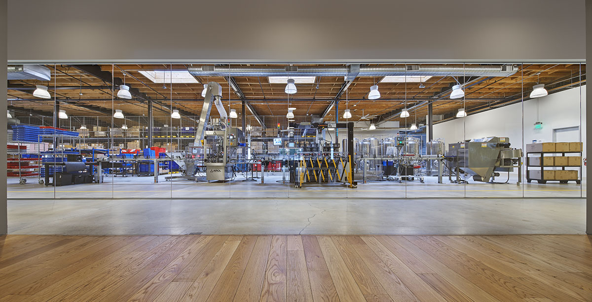 From the established organizational structure, two principal axes were implemented to facilitate the functions of manufacturing and office-work. The first axis is positioned through the center of the building, with manufacturing on the east and all the other business functions to the west. The second axis is positioned perpendicular to the first, with the center housing the communal kitchen, eating area, and new exterior patio with two open office sections, break-out rooms, and main conference rooms radiating from each side. The intersection of the two axes is extenuated by a floating glass plane.