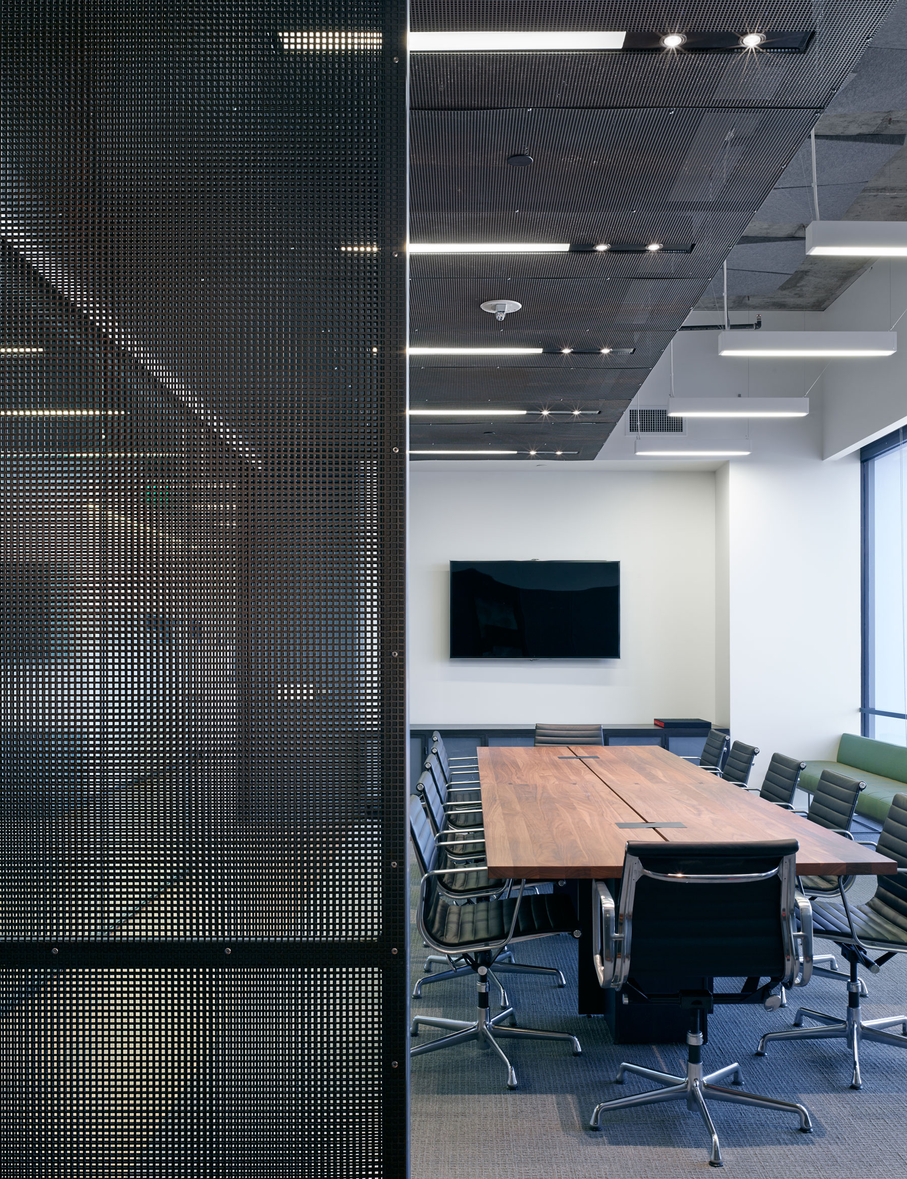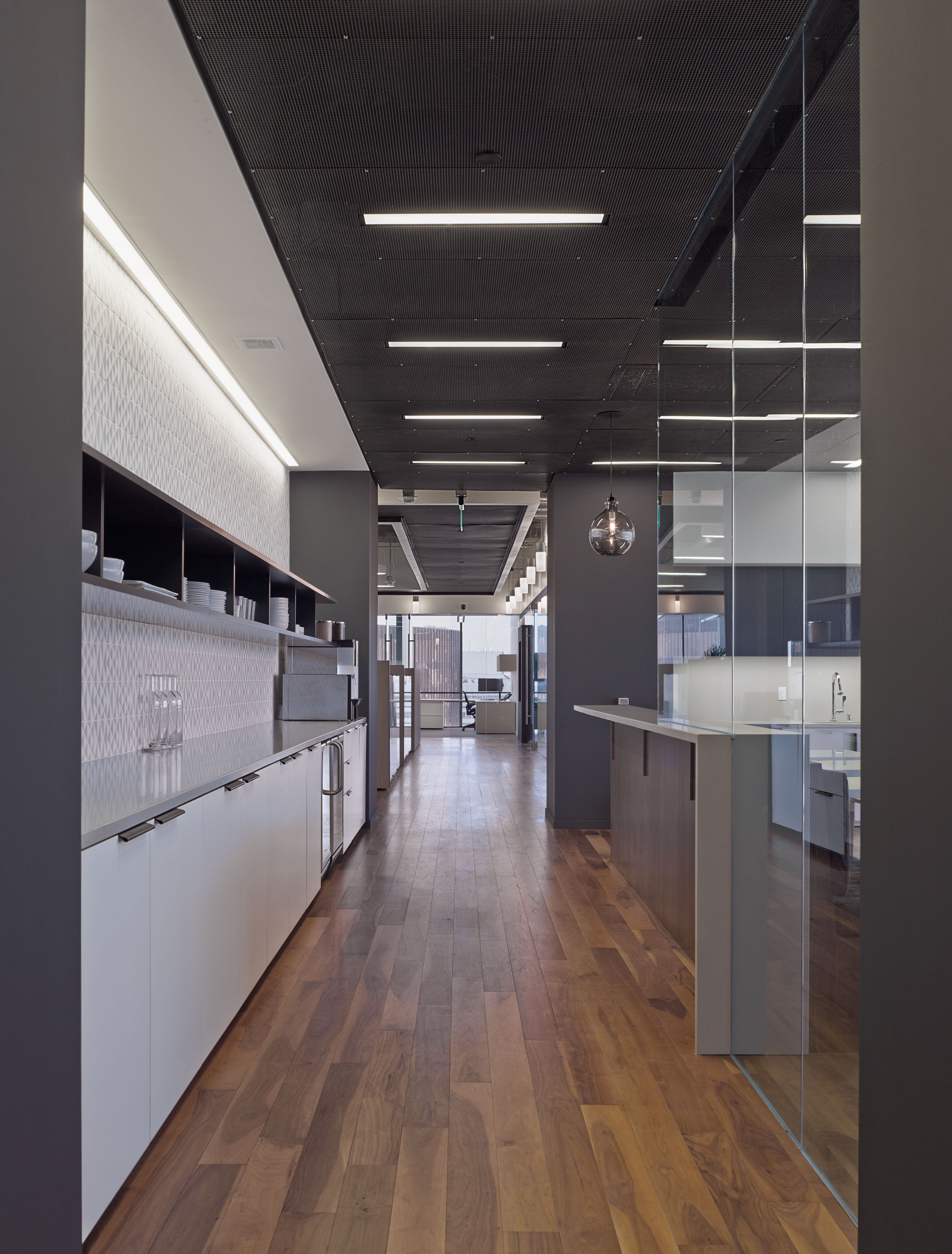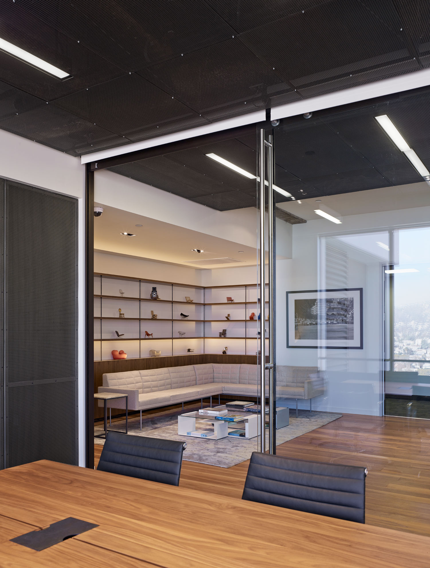 Handsomely detailed materials are meticulously arranged within the exposed concrete shell and core to create a showcase that balances elegance and functionality. An arresting panoramic view of the city in the reception area reception is anchored by a cantilevered reception desk and tuxedo sofa. Floor to ceiling glazing draws the outside in. Pendant lights accentuate the height of the exposed concrete slab above. The 15’ high ceilings with suspended dark perforated panels with recessed lighting and polished walnut floors guide internal circulation.