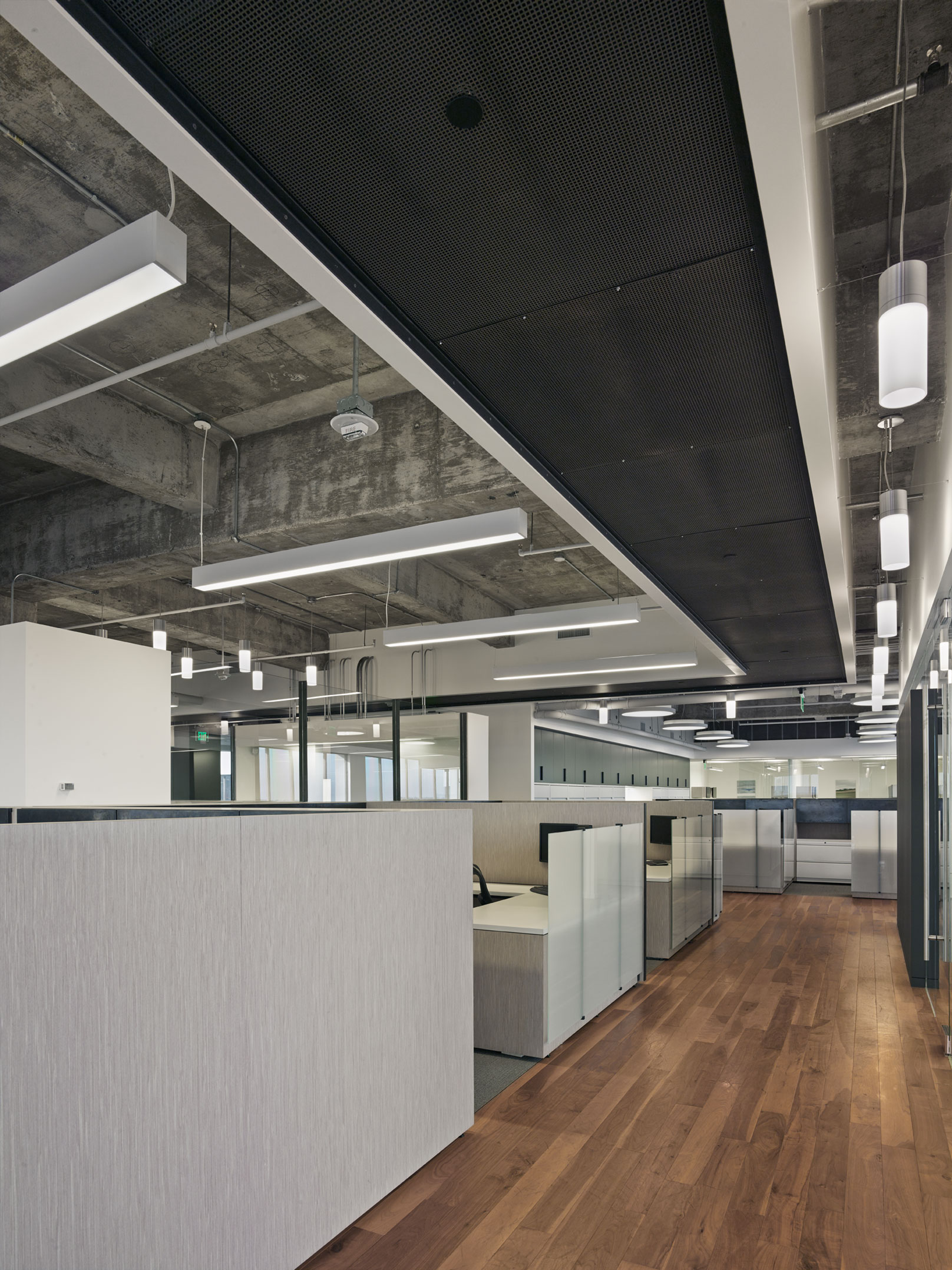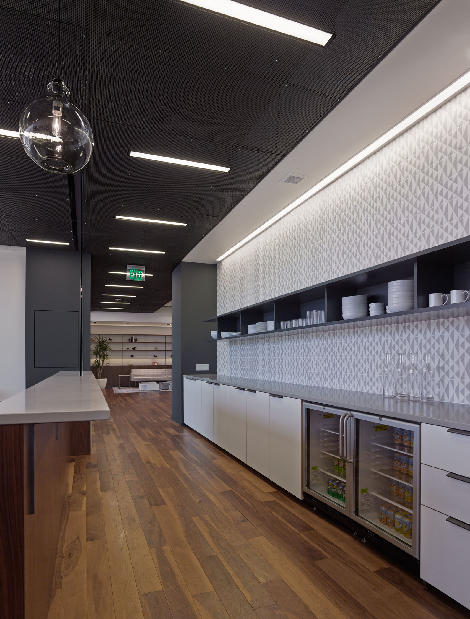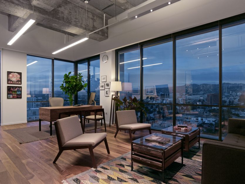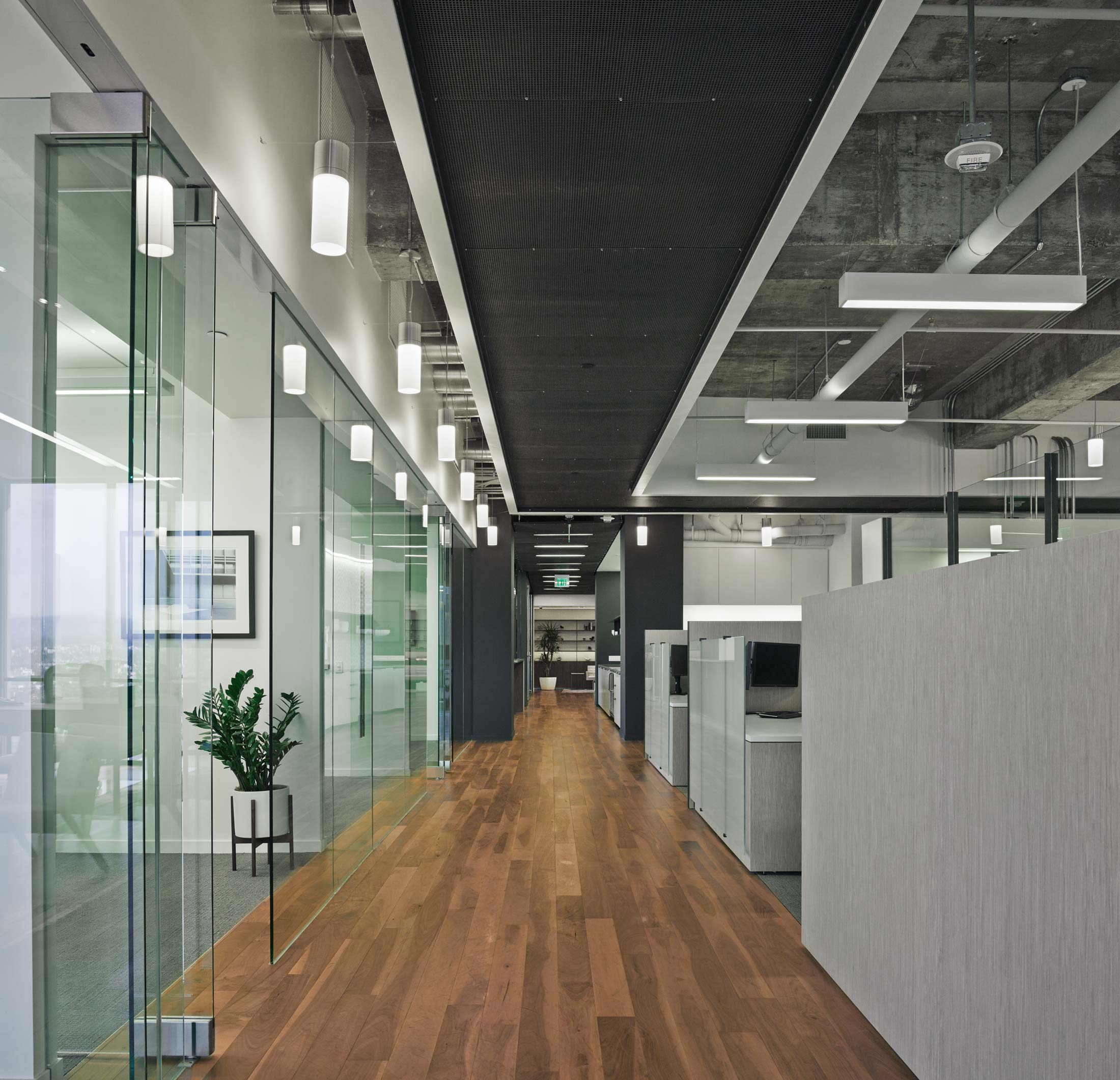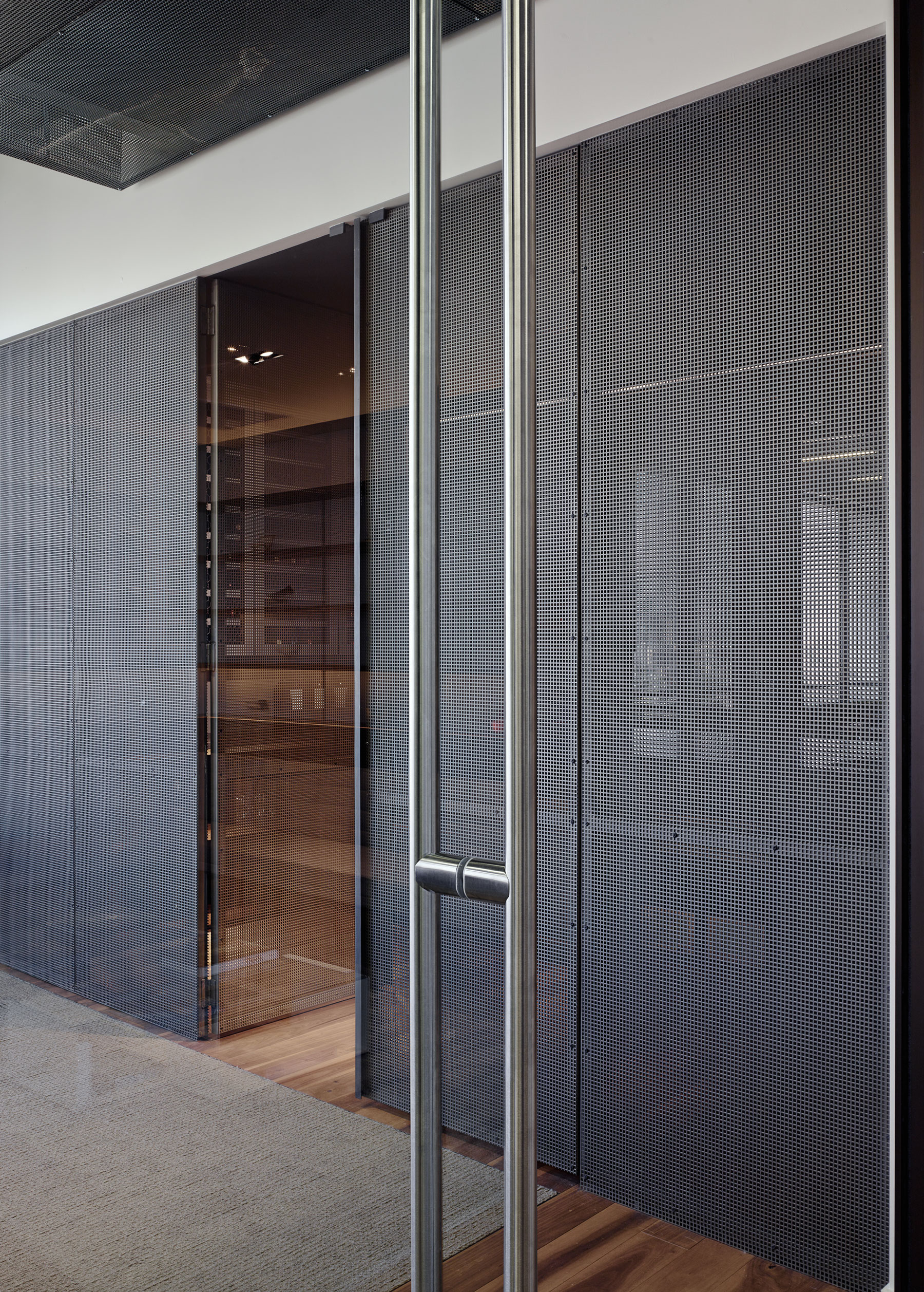 Handsomely detailed materials are meticulously arranged within the exposed concrete shell and core to create a showcase that balances elegance and functionality. An arresting panoramic view of the city in the reception area reception is anchored by a cantilevered reception desk and tuxedo sofa. Floor to ceiling glazing draws the outside in. Pendant lights accentuate the height of the exposed concrete slab above. The 15’ high ceilings with suspended dark perforated panels with recessed lighting and polished walnut floors guide internal circulation.