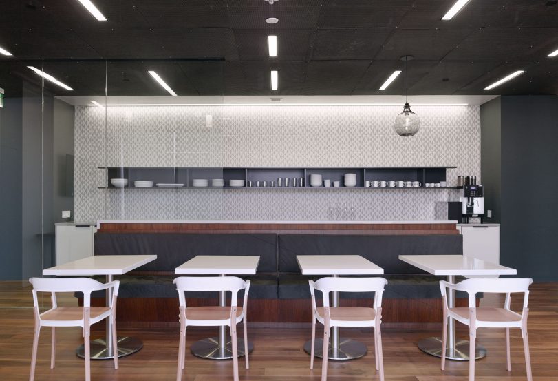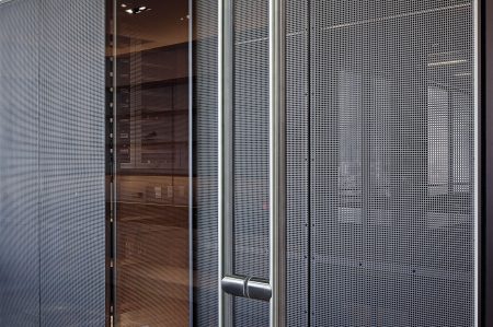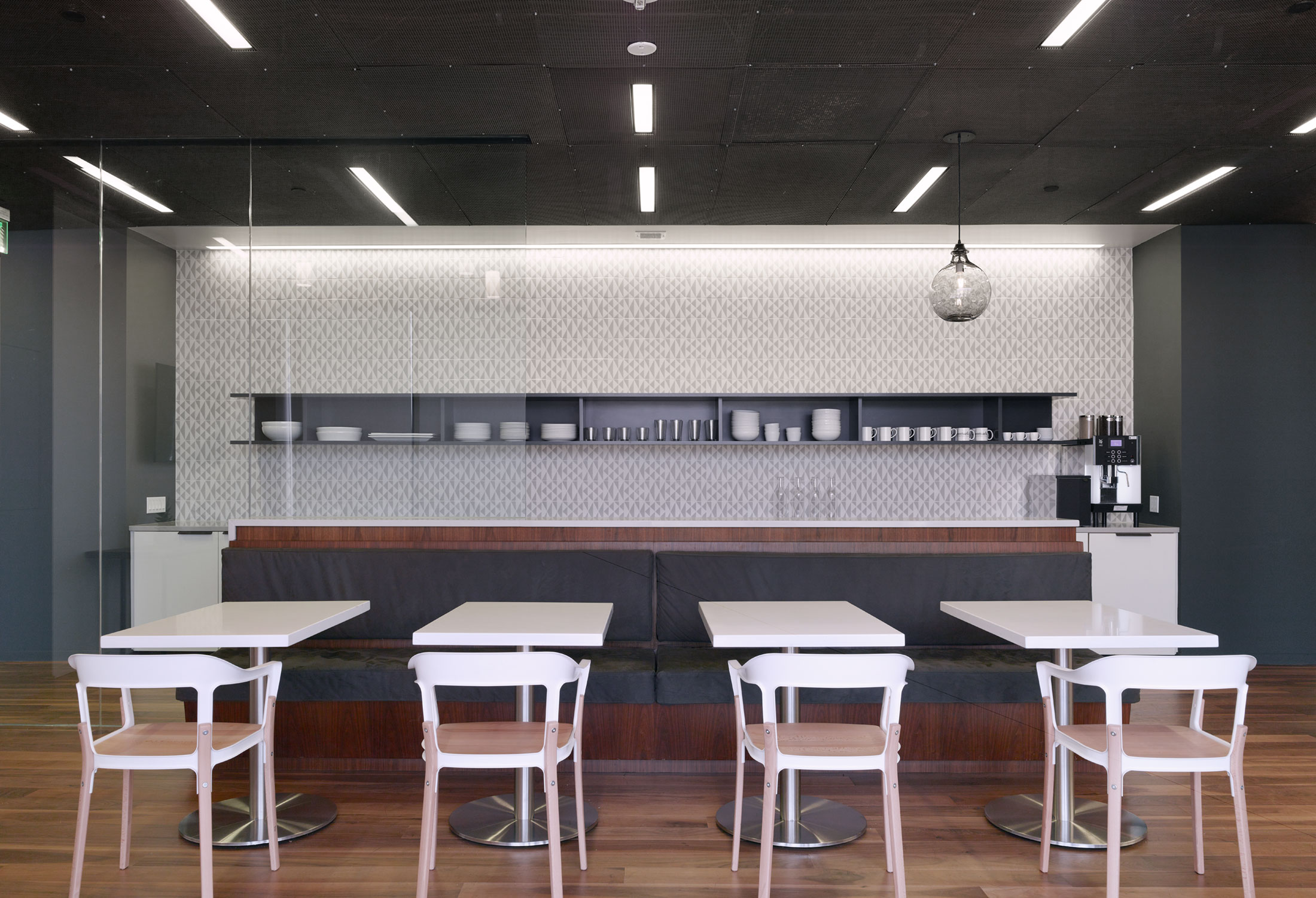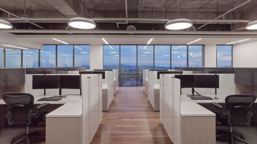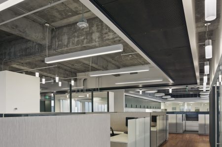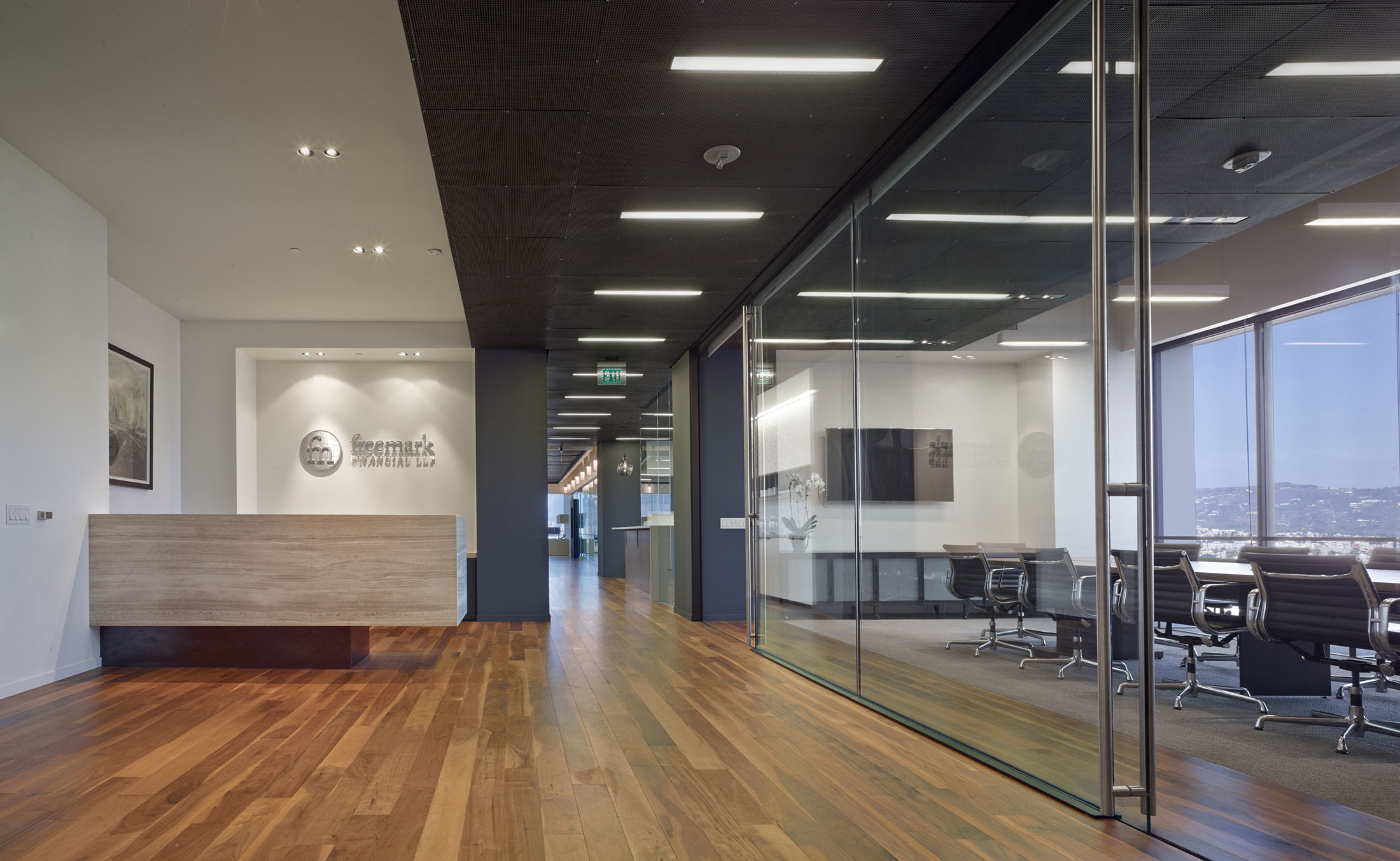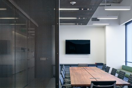 Handsomely detailed materials are meticulously arranged within the exposed concrete shell and core to create a showcase that balances elegance and functionality. An arresting panoramic view of the city in the reception area reception is anchored by a cantilevered reception desk and tuxedo sofa. Floor to ceiling glazing draws the outside in. Pendant lights accentuate the height of the exposed concrete slab above. The 15’ high ceilings with suspended dark perforated panels with recessed lighting and polished walnut floors guide internal circulation.
