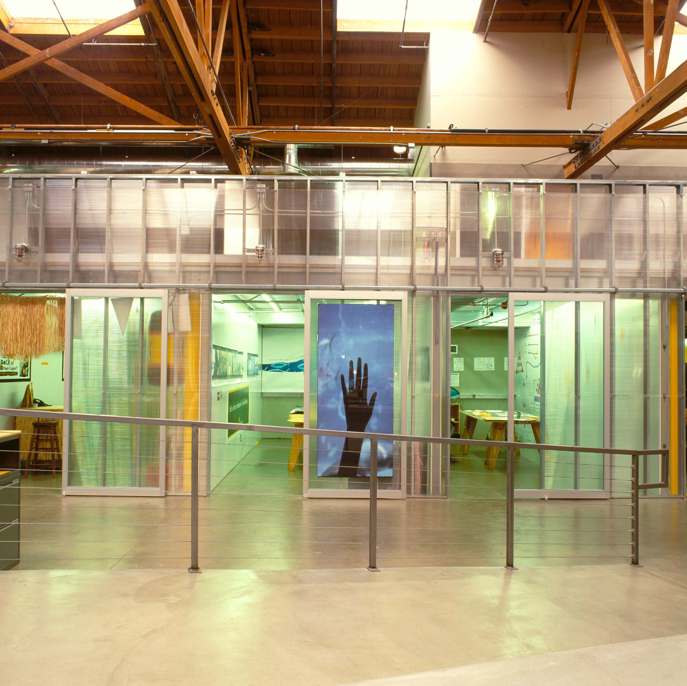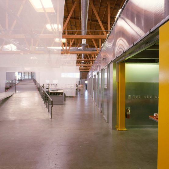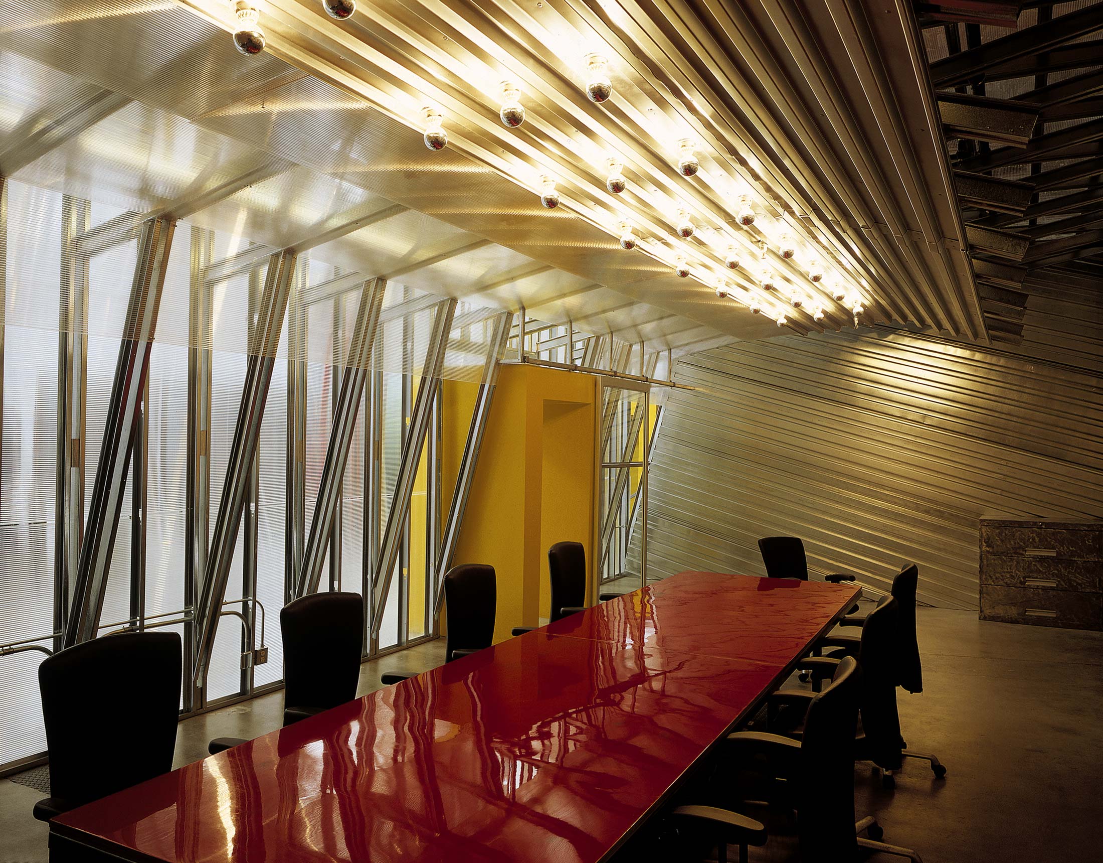 Conference rooms are defined by ribbed plastic sheeting, corrugated galvanized steel walls, and bright yellow doorways. Located at the rear of the building, each conference room is encased by a steel “wave” which houses the conference lighting. Ornamentation is minimal, allowing client presentations to fill the conference space without distraction.
