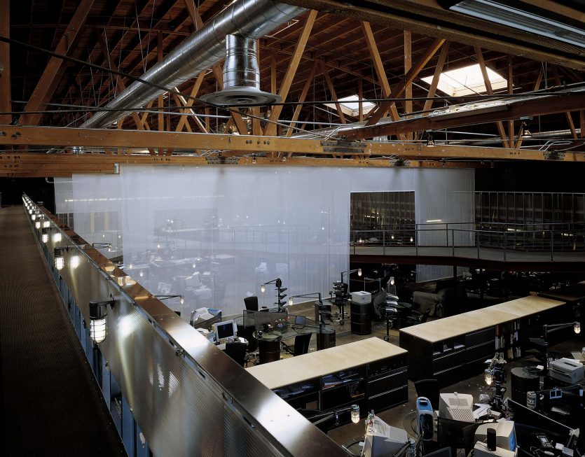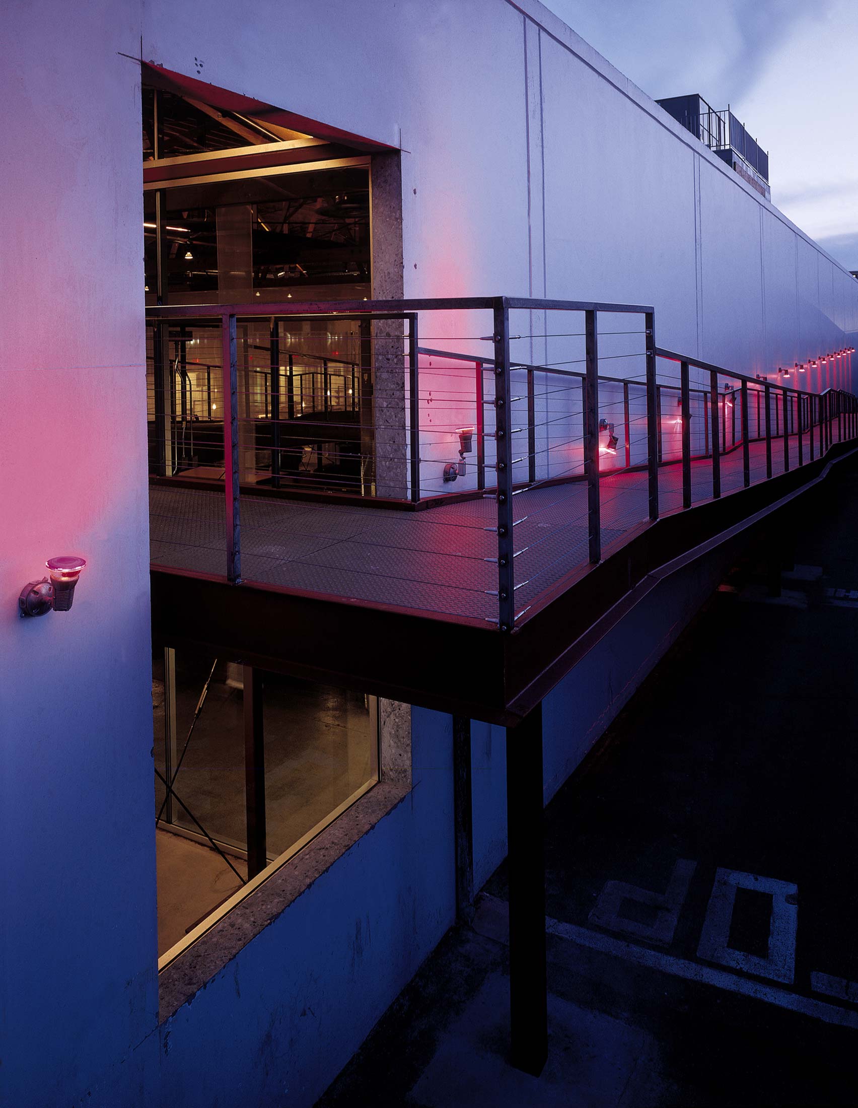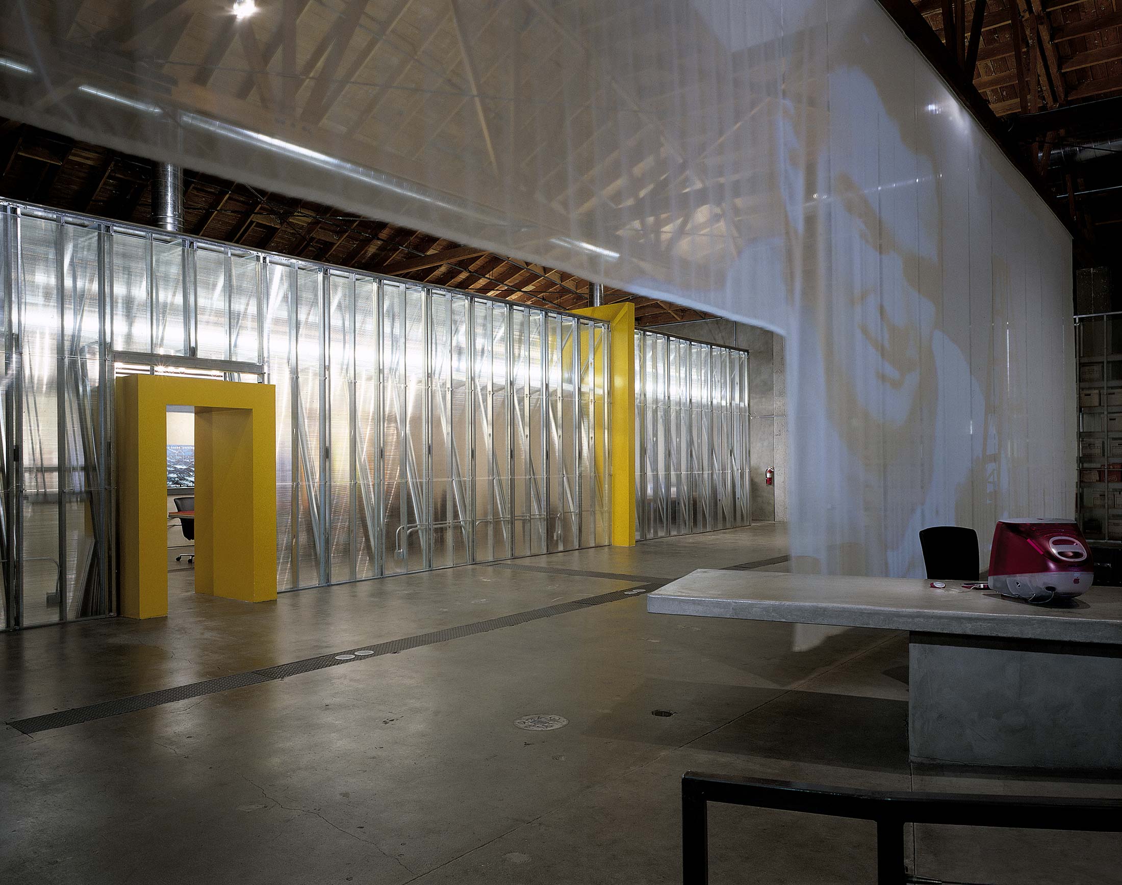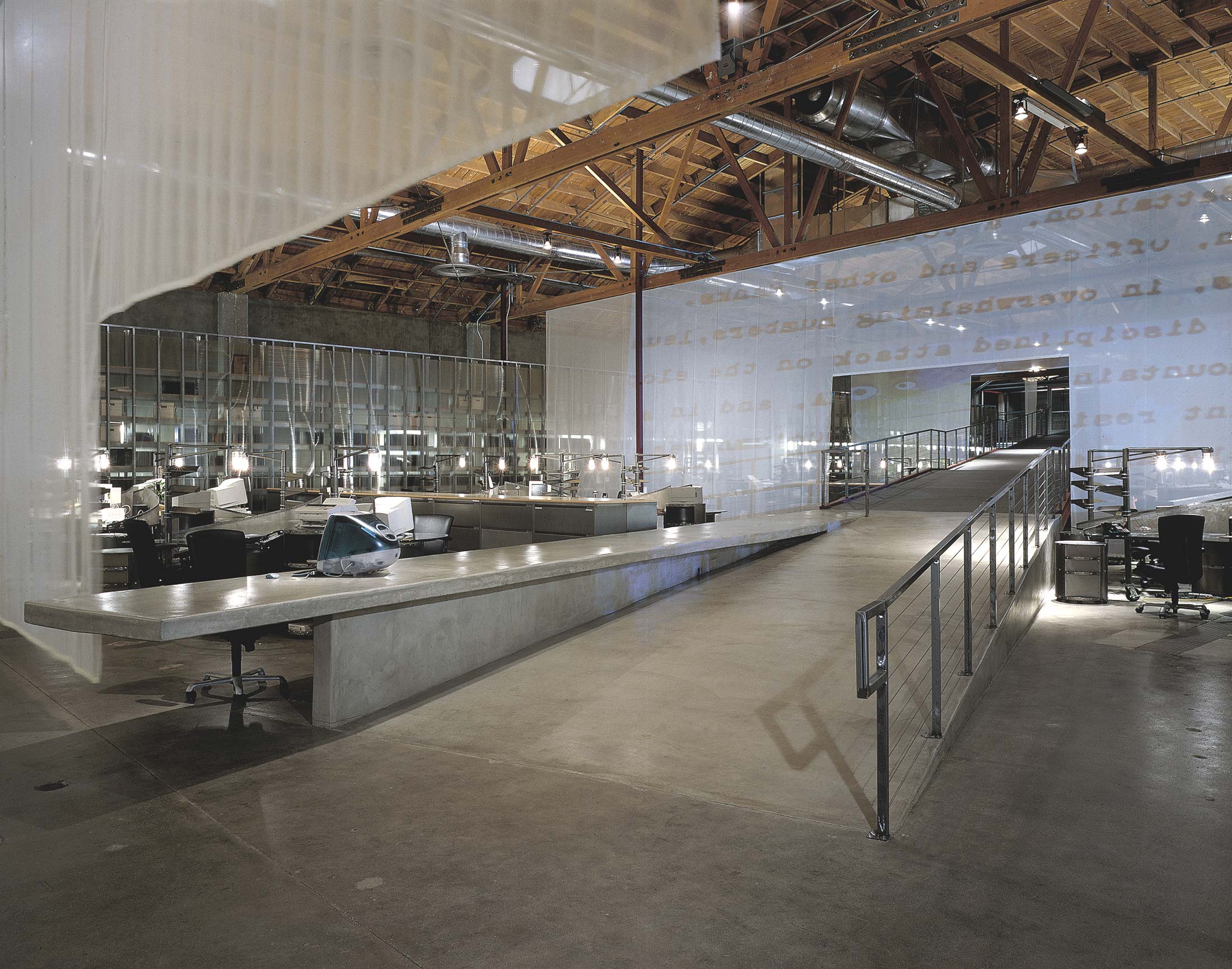 The interior features a processionary, 9.5 foot high ramp leading down from the elevated second-floor glass-enclosed entryway. As guests, clients, and staff make their way down the ramp, and through the entire length of the working “hall,” they are exposed to an ever-changing palette of the agency’s work projected on a series of theatrical scrims spanning the width of the space. The “soul of the creative machine” is revealed to all that enter the agency. The reception area is at the end of the ramp, at the back of the building, reinforcing Ground Zero’s inverted “business as usual” attitude.