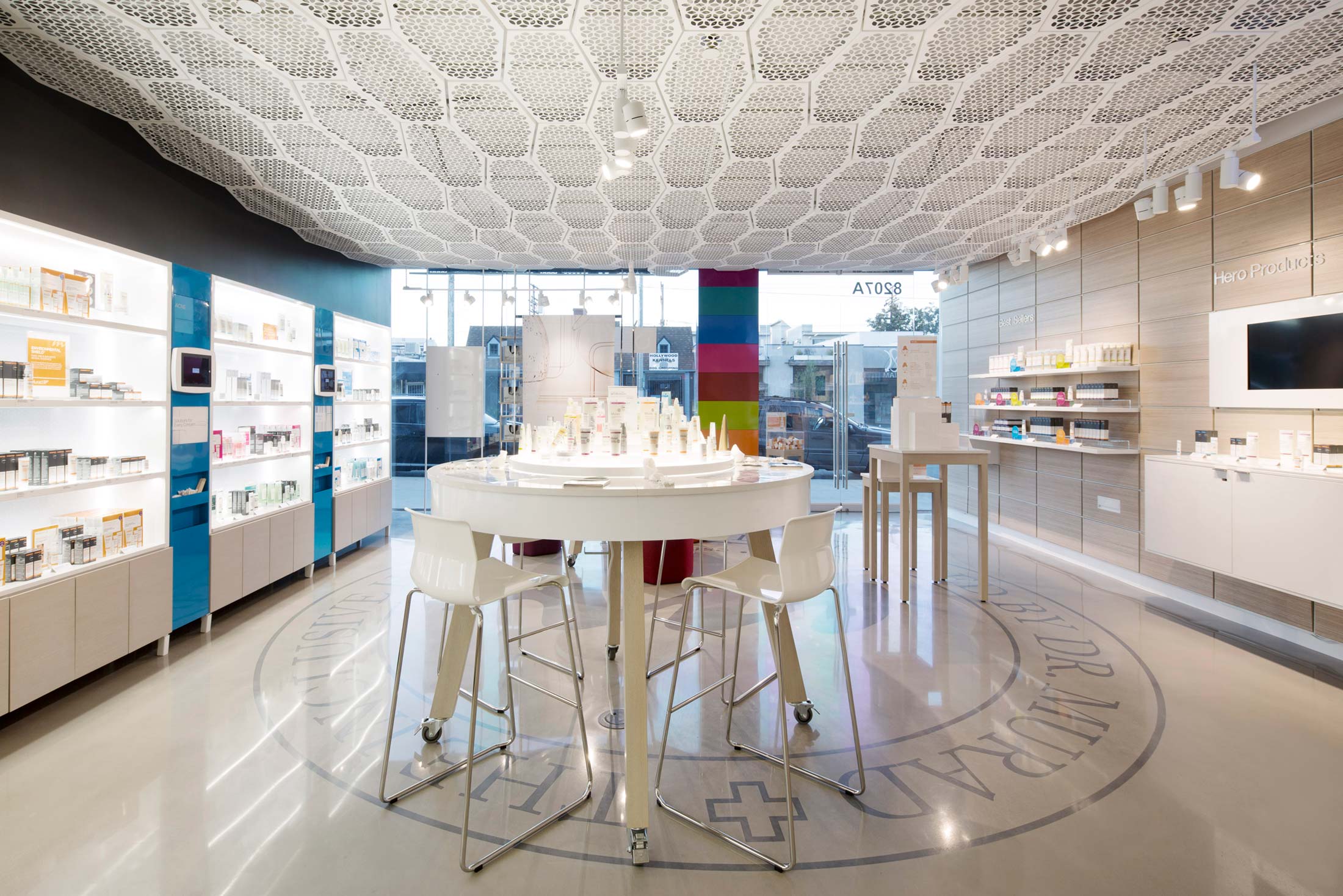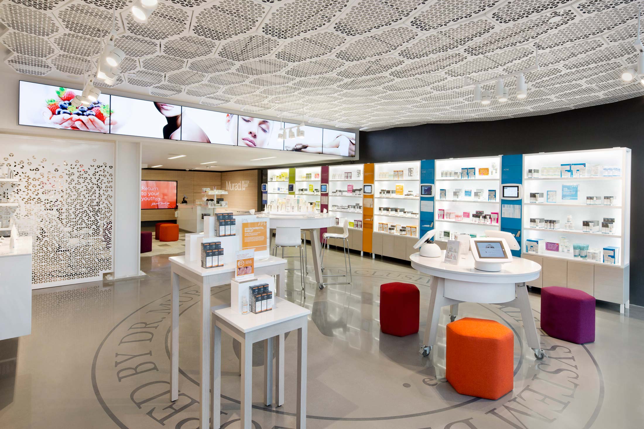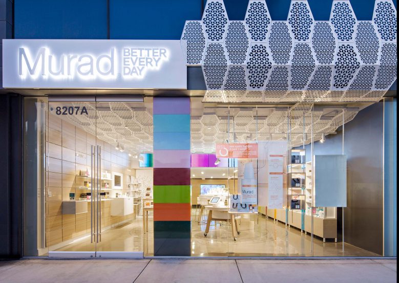 Murad teamed up with ShubinDonaldson to create their first flagship store in the heart of Los Angeles. Experience design played a big role in determining the overall layout and location of display fixtures in order to maximize the best brand experience. The clean modernist design creates a beautiful backdrop to the colorful aesthetic of the beauty brand. Murad’s “Inclusive Health” philosophy is represented in custom patterns designed throughout key elements of the project like ceramic tiles, laser cut screens, and an iconic ceiling element that is also present in the brand’s new corporate headquarters designed by ShubinDonaldson. For ShubinDonaldson, it was important to visually reflect the brand’s DNA not only through the materiality, but also the construction process. The brand’s belief in social responsibility was carried through the use of environmentally friendly and sustainable materials and products.
