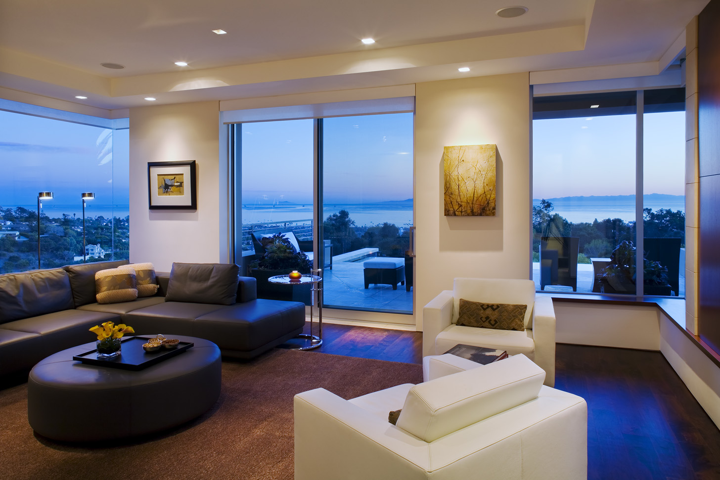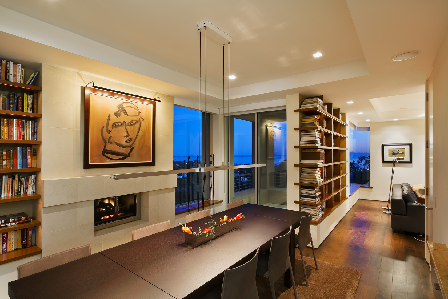 The original house was taken apart, piece-by-piece, with all reusable elements donated to Habitat for Humanity. Building on the original foundation and caissons, a passive rooftop solar heating system provides for domestic hot water; a passive solar ground-level hot-water system is used to heat the pool. Photo-voltaic power generates household electricity through a 2.8kw system; when power is not needed, it feeds back into the grid. Radiant hot-water floor heating and central air conditioning in the ceilings systems are in place but rarely used because of the solar orientation of the home and the natural ventilation. Additional energy-saving systems include double-pane windows, UV-resistant glass, ample insulation, and energy-efficient appliances. Deep exterior overhangs are designed to provide shade in the summer, and let in sun during the winter.
