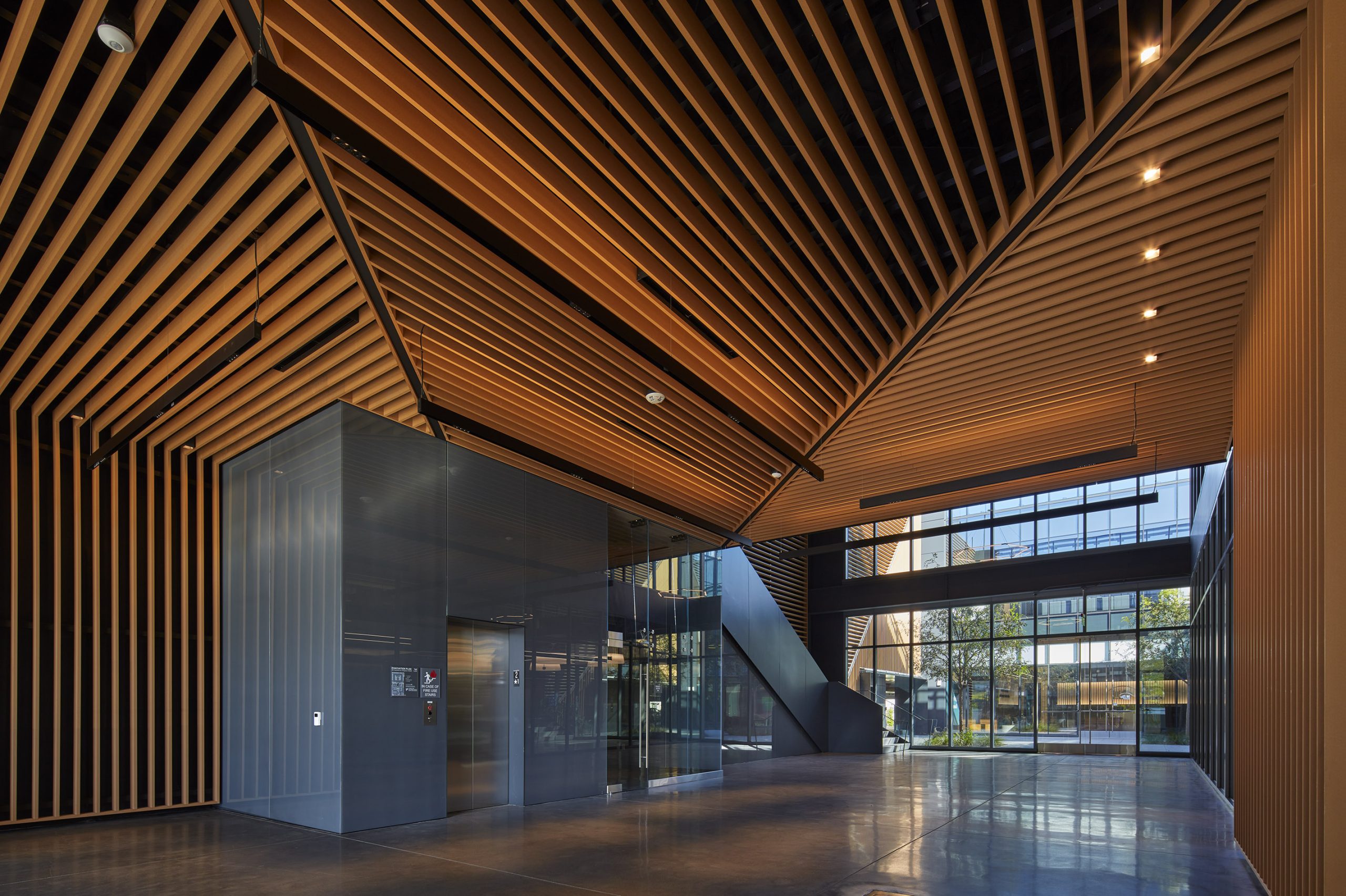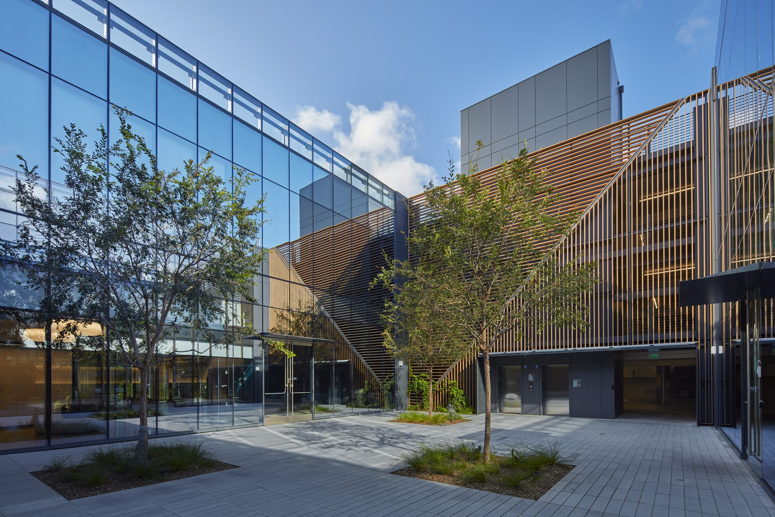 The new courtyard, with wooden screens and double-height glazing, redefines the interior-exterior dynamic, providing an entry from the parking lot and a sanctuary for tenants. Materials played a vital role, blending concrete, glass, and steel with wood ceilings, screens, and biophilia to balance permanence and comfort.