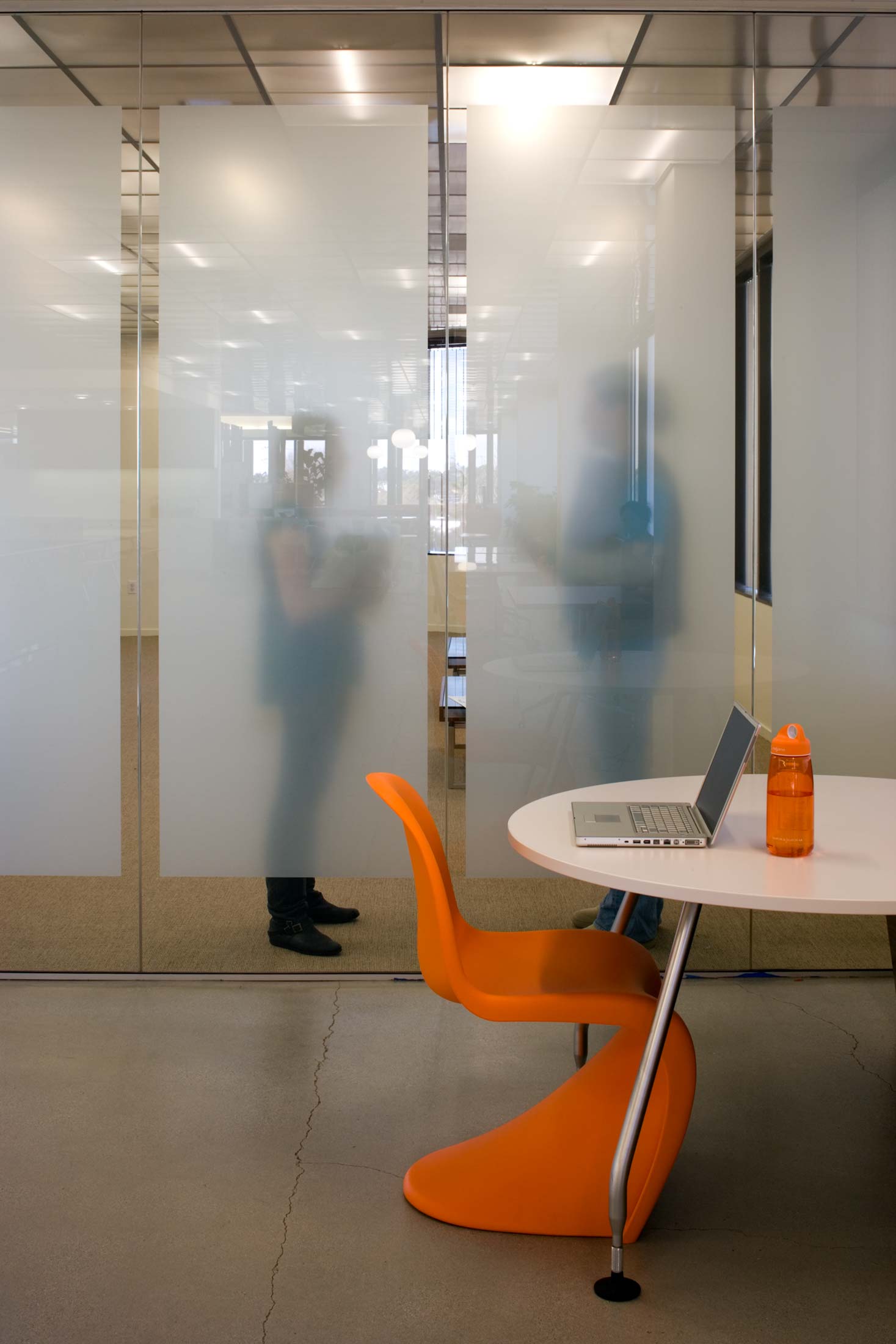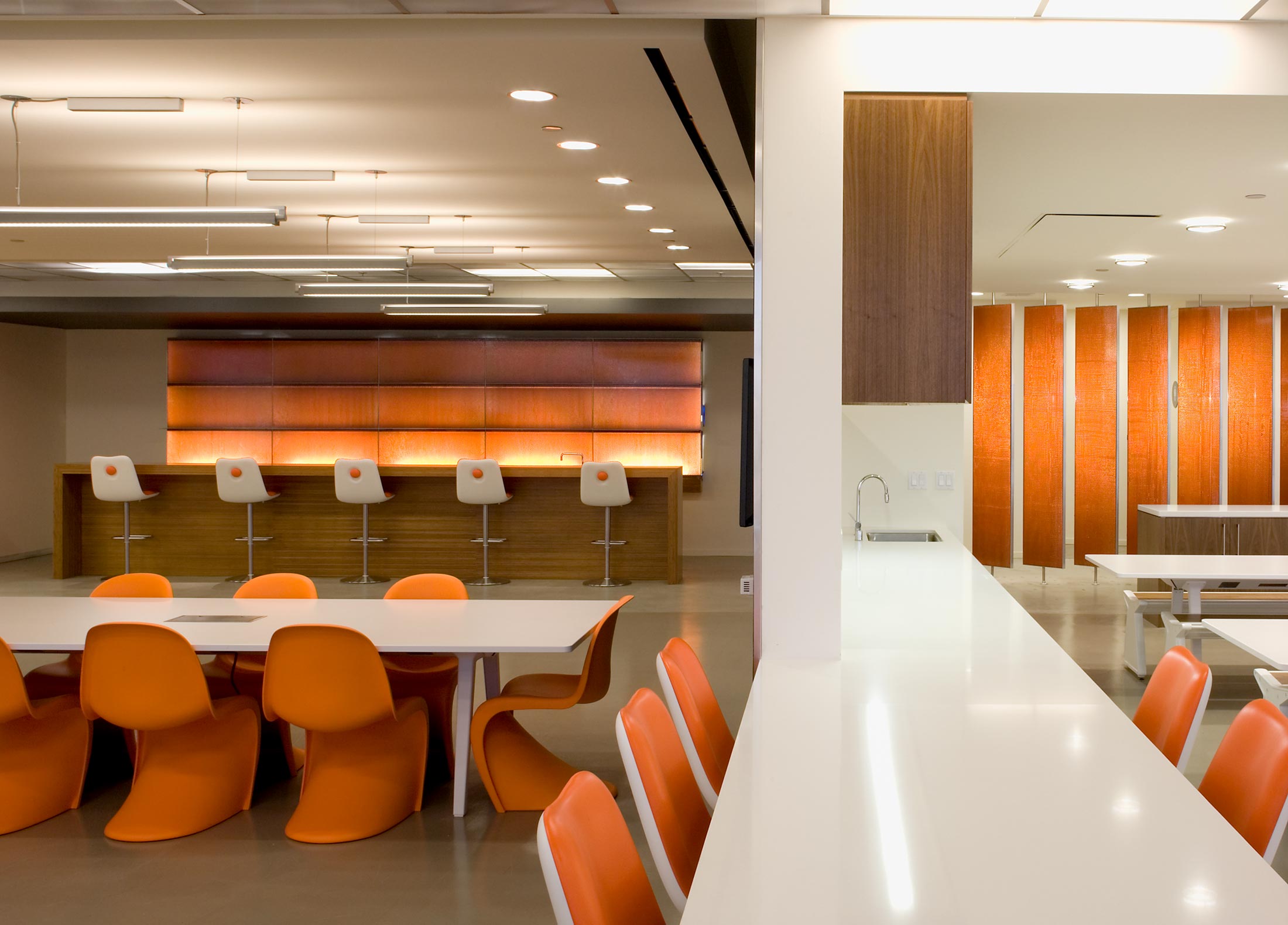 ShubinDonaldson incorporated elements of a home into the design through large gestures, such a grand staircase/meeting space, living and dining areas, and a “backyard” for casual gathering. Focusing great attention on the main floor — centrally located on the third level — ShubinDonaldson designed a communal hub to bring staff together in a variety of configurations. The advertising agency’s branded orange color was used throughout in furnishings and materials.