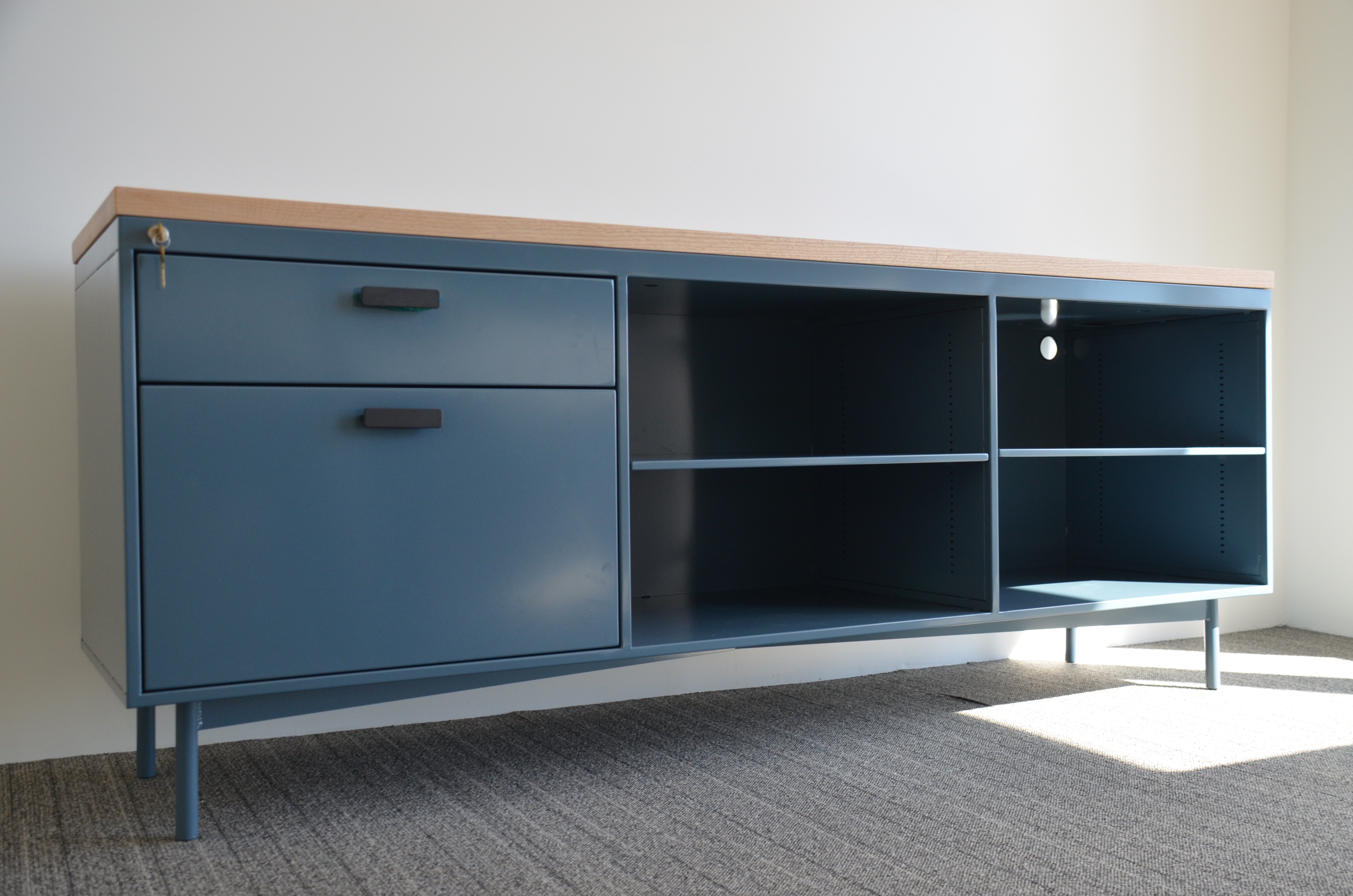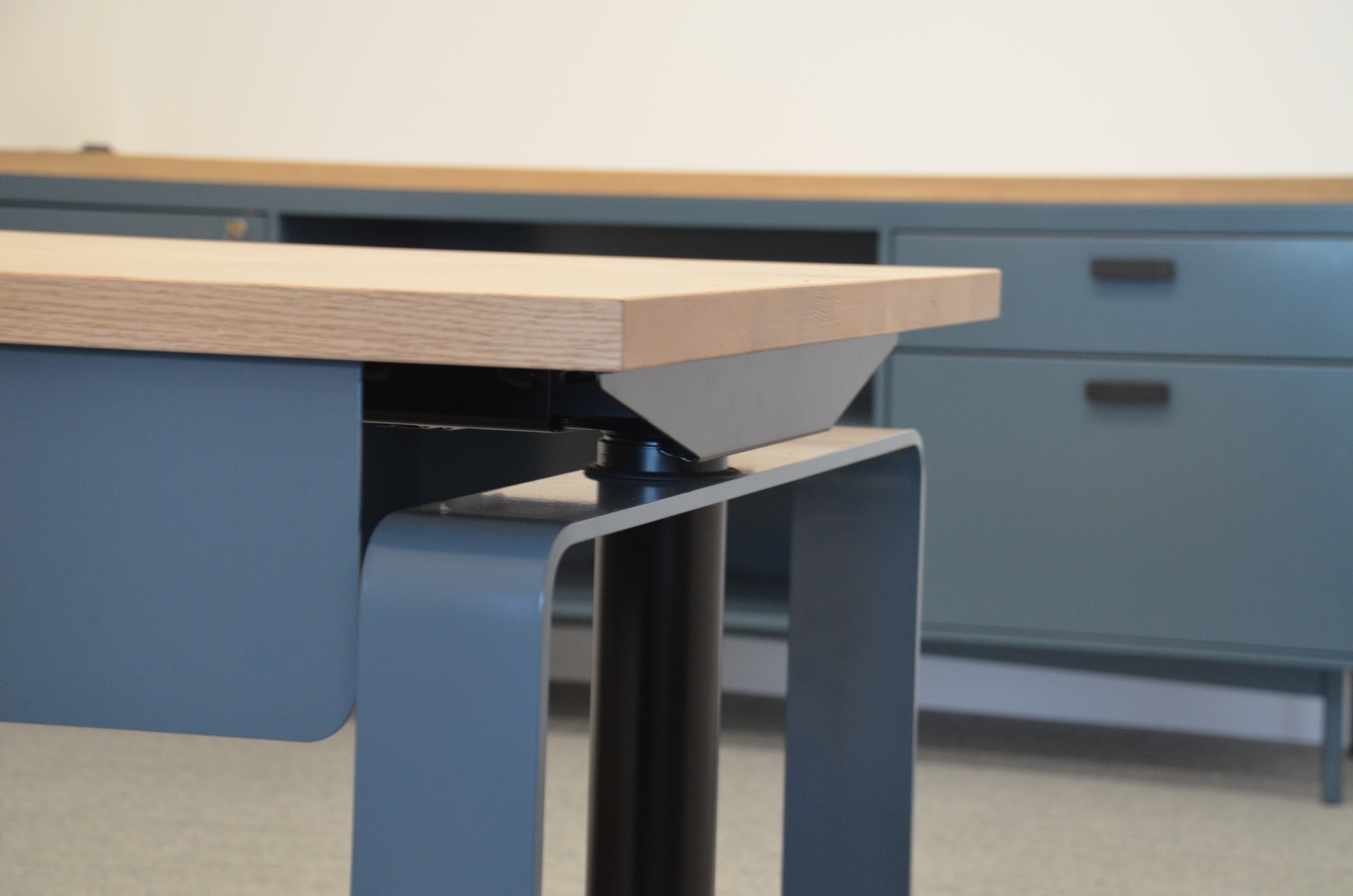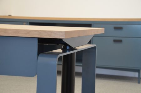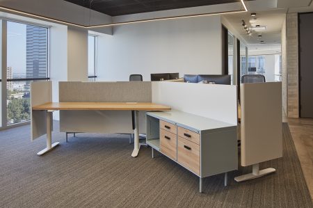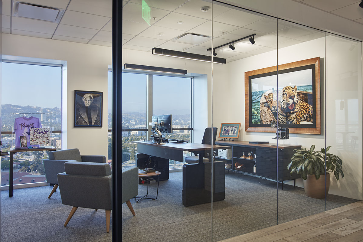 Open workstations fill the spaces between individual offices, facing the outward windows. The workstations were custom-designed in partnership with MASH Studios and utilize the space to its fullest potential by emulating the triangular floor-plate. These workstations are oriented to allow both privacy, due to the nature of the work tasks, and collaboration between the staff. The kitchen is proudly located at a vertex of the triangle and allows stunning views of Beverley Hills, DTLA, and the Santa Monica Bay. This corner is the most open of the spaces within the office, with ample space for staff-members to congregate and a café-feel.