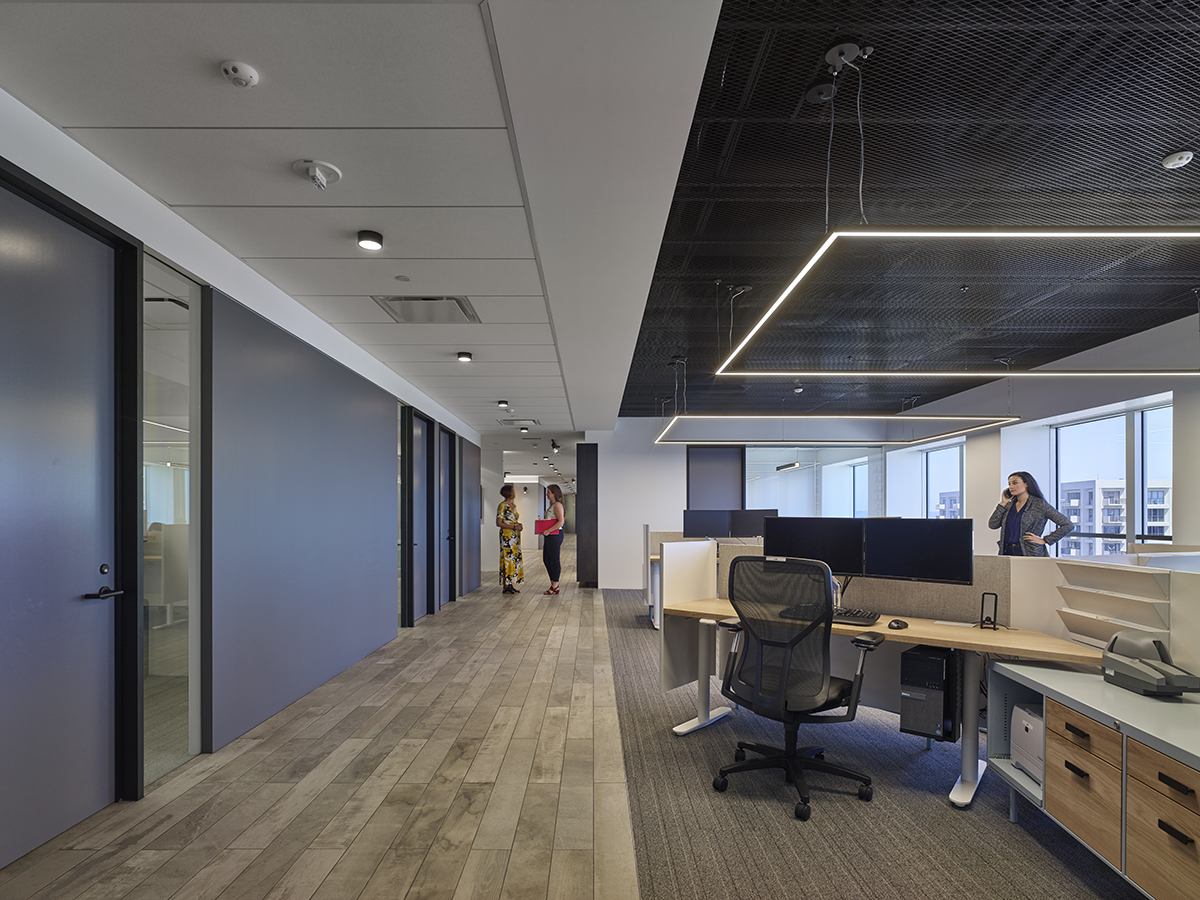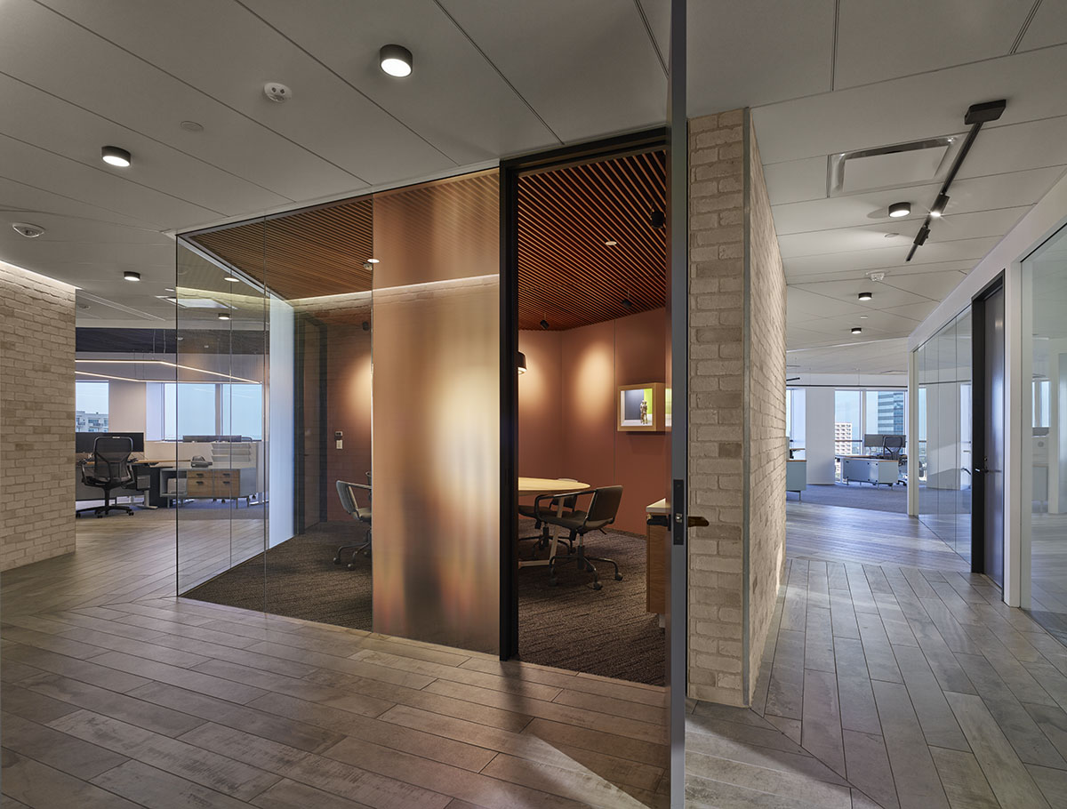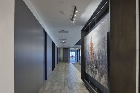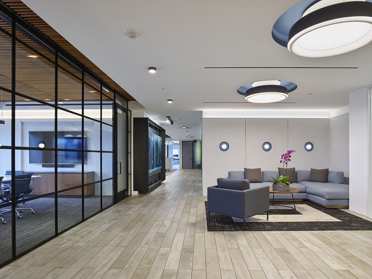 The entrance lighting sets the tone for the office space, with custom fabricated “portal” light fixtures set into the ceiling with a cool-blue soffit light to accentuate the feature. Smaller forms of these lights are carried onto the entry wall set into the plaster and similar lighting elements throughout the office.