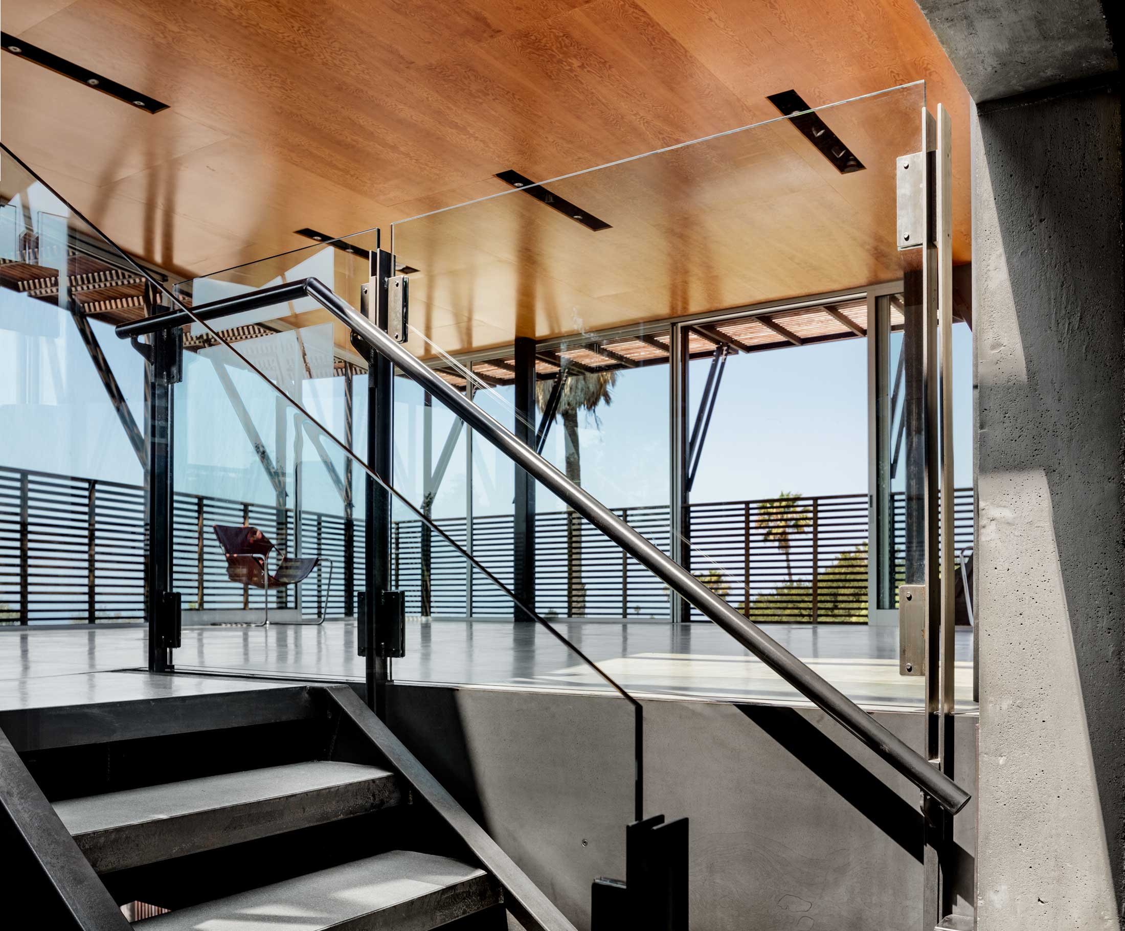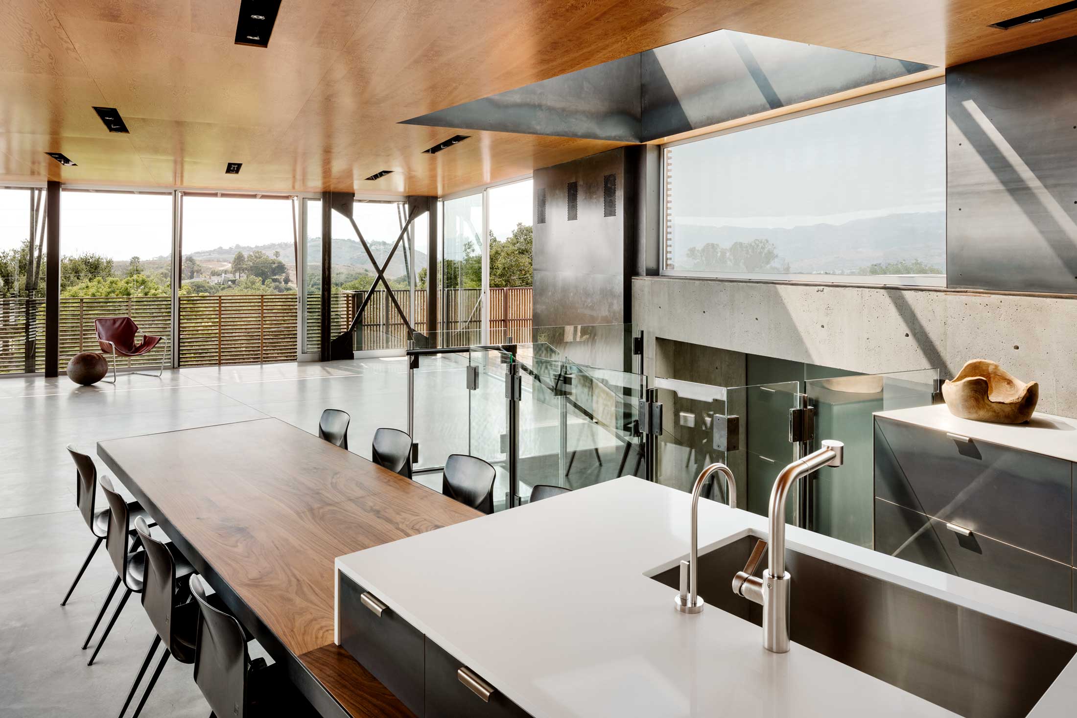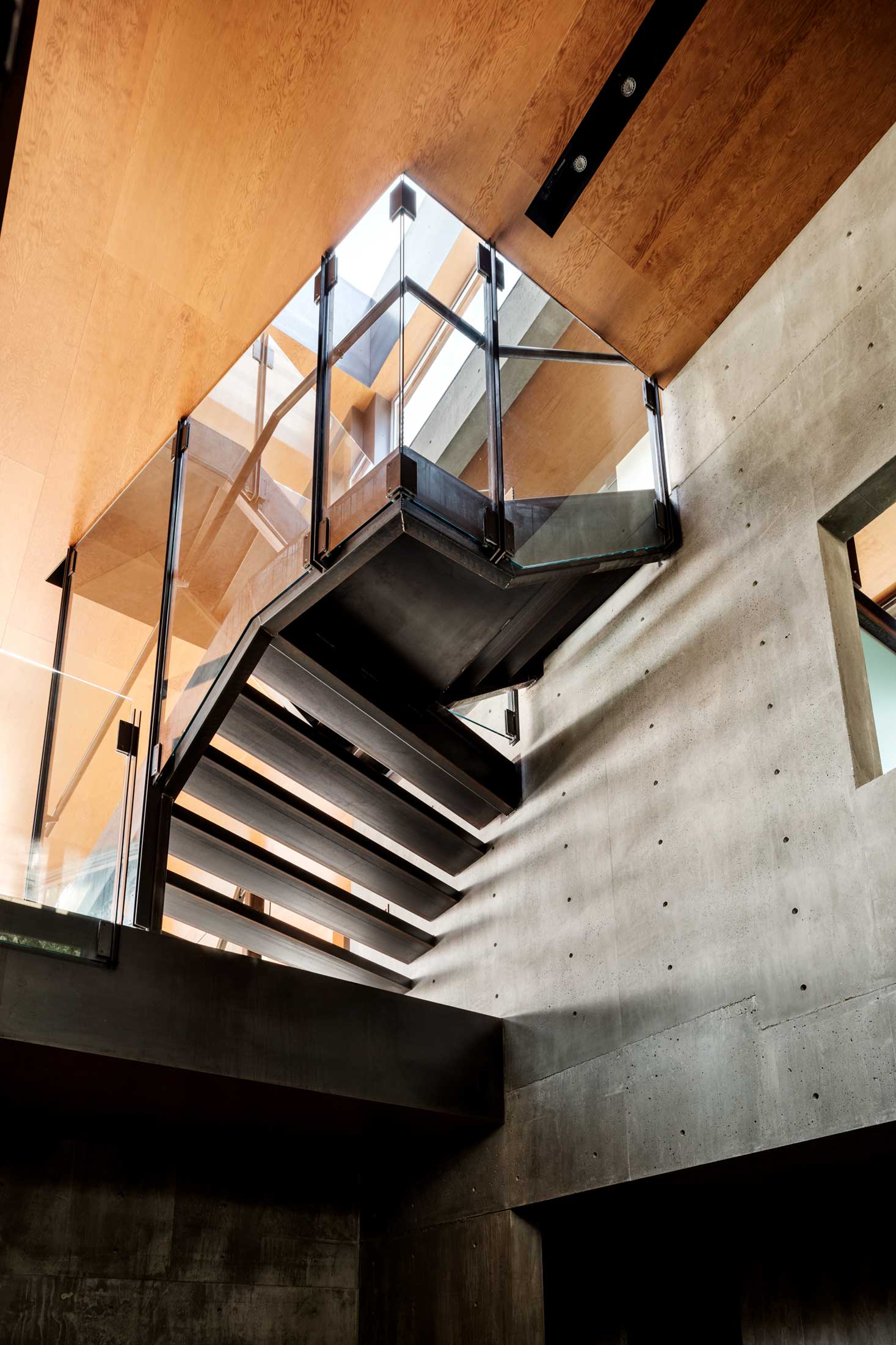 Due to the complexity of the form, the material palette for the home was limited to wood, cast concrete, steel and glass. The house has a central stair that cuts up through the home with a skylight above that allows daylight to penetrate the home and light it from within.