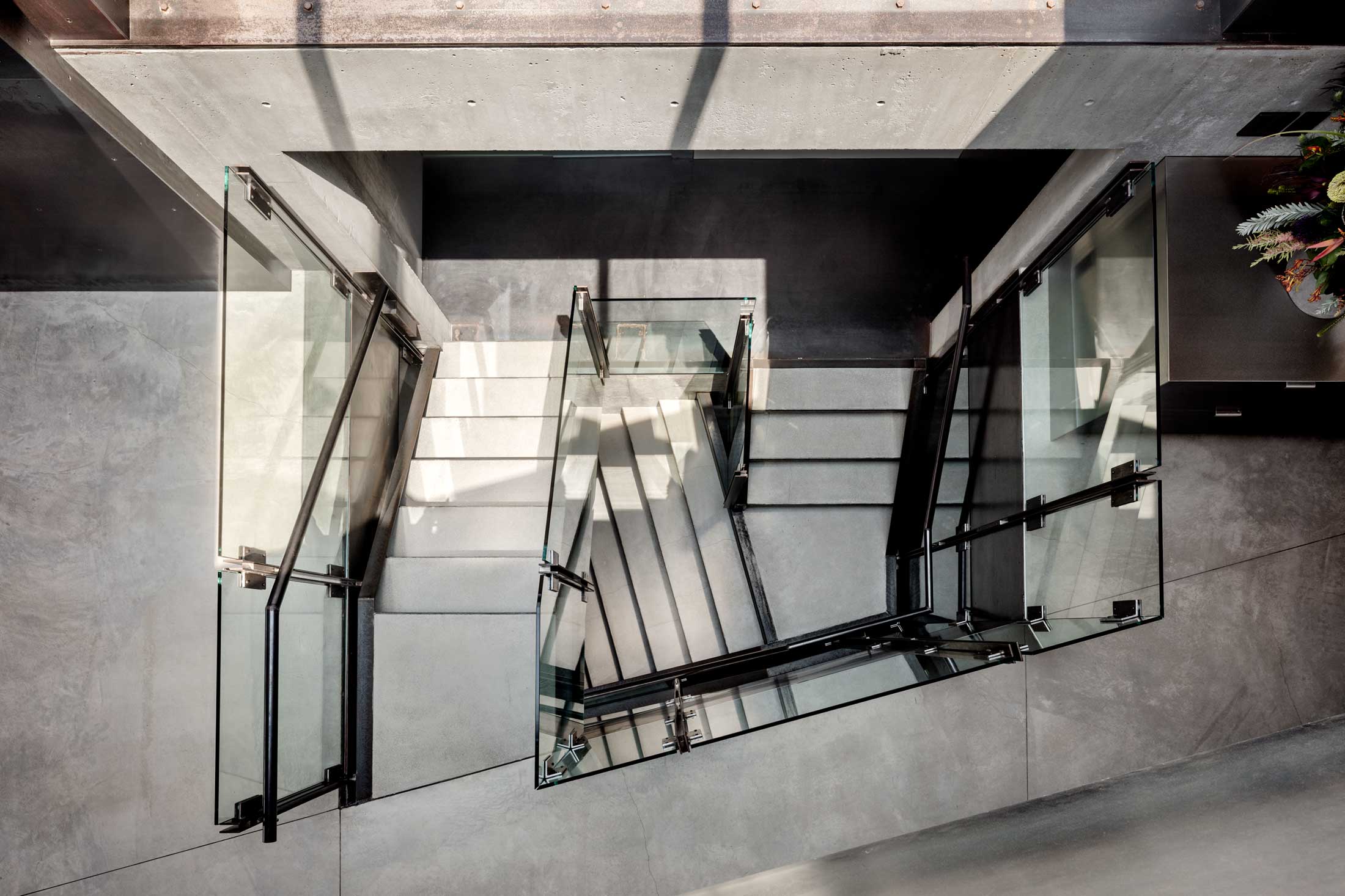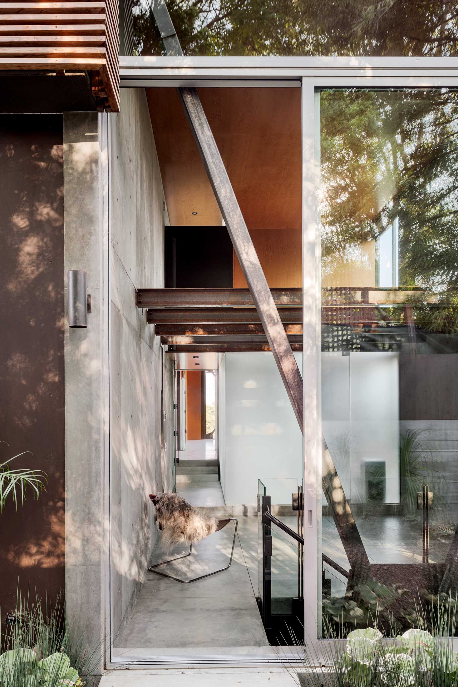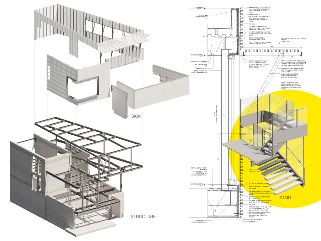 Due to the complexity of the form, the material palette for the home was limited to wood, cast concrete, steel and glass. The house has a central stair that cuts up through the home with a skylight above that allows daylight to penetrate the home and light it from within.