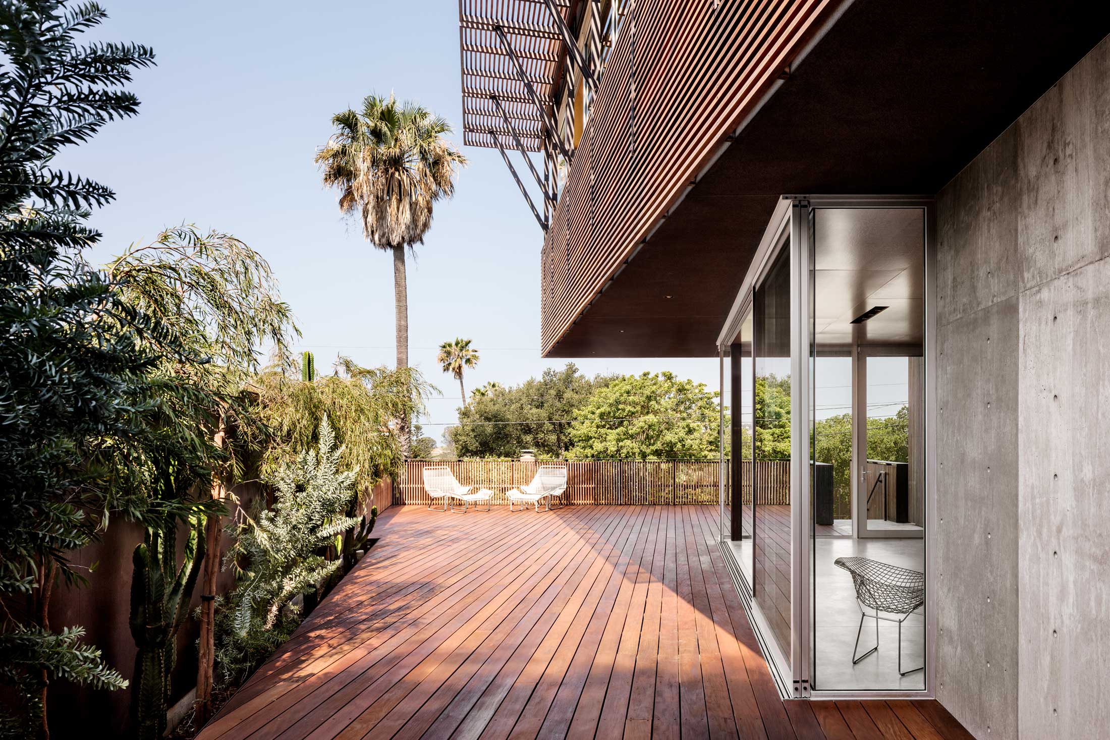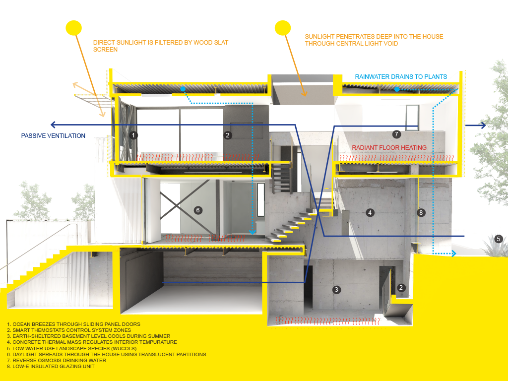 Environmentally, the home is cooled passively by ocean breezes, lit evenly during the day by daylight, and Ipe wood screens minimize sun load on the extensive view windows.