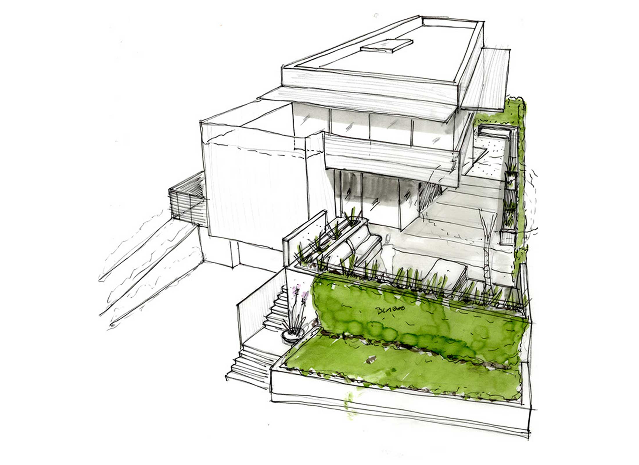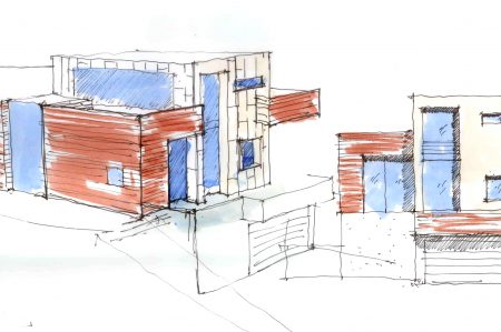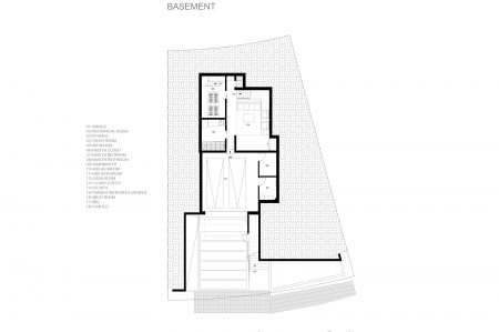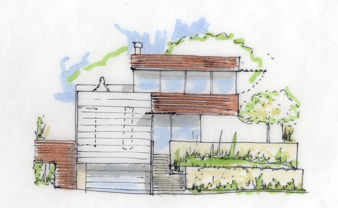 The main challenge was to “wedge” this home into a narrow complex shape of constraints and opportunities provided by the hillside site, zoning requirements and neighborhood context. These constraints resulted in a unique formal solution deploying a concrete and steel structural frame to maximize the formal responsiveness of the structure.