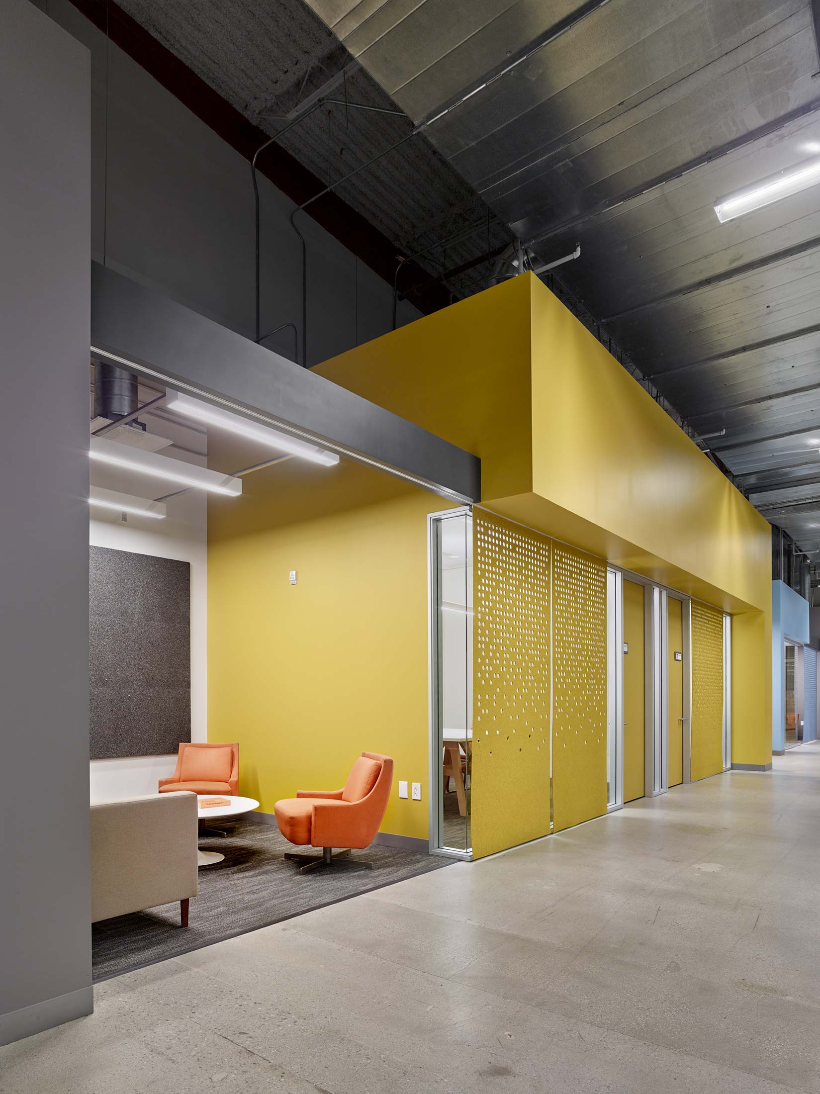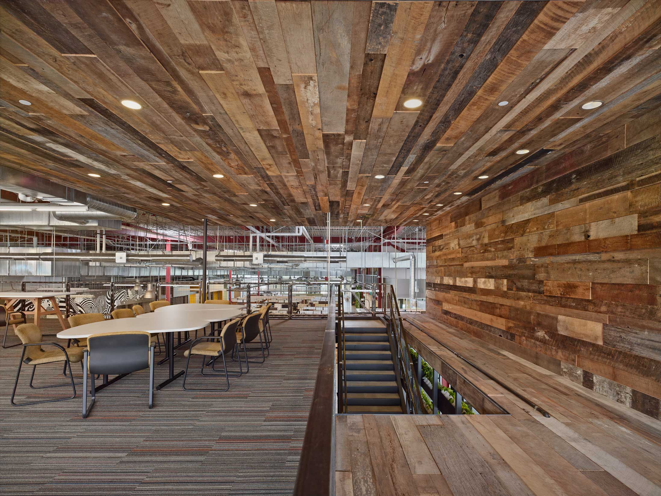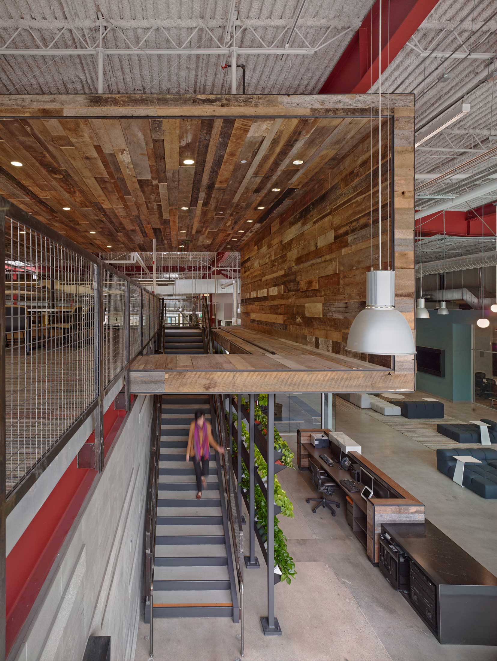 A massive folding “box” clad in reclaimed barn wood sets the tone for a reception space filled with large volumes and architectural forms. Playing against the scale of the building’s industrial shell, the material palette embraces a more residential tone with warm colors and textures. The existing structural elements are brightly painted enhancing their scale and presence in the vast space. The design celebrates the framework of the shell while promoting the minds of an advertising giant.