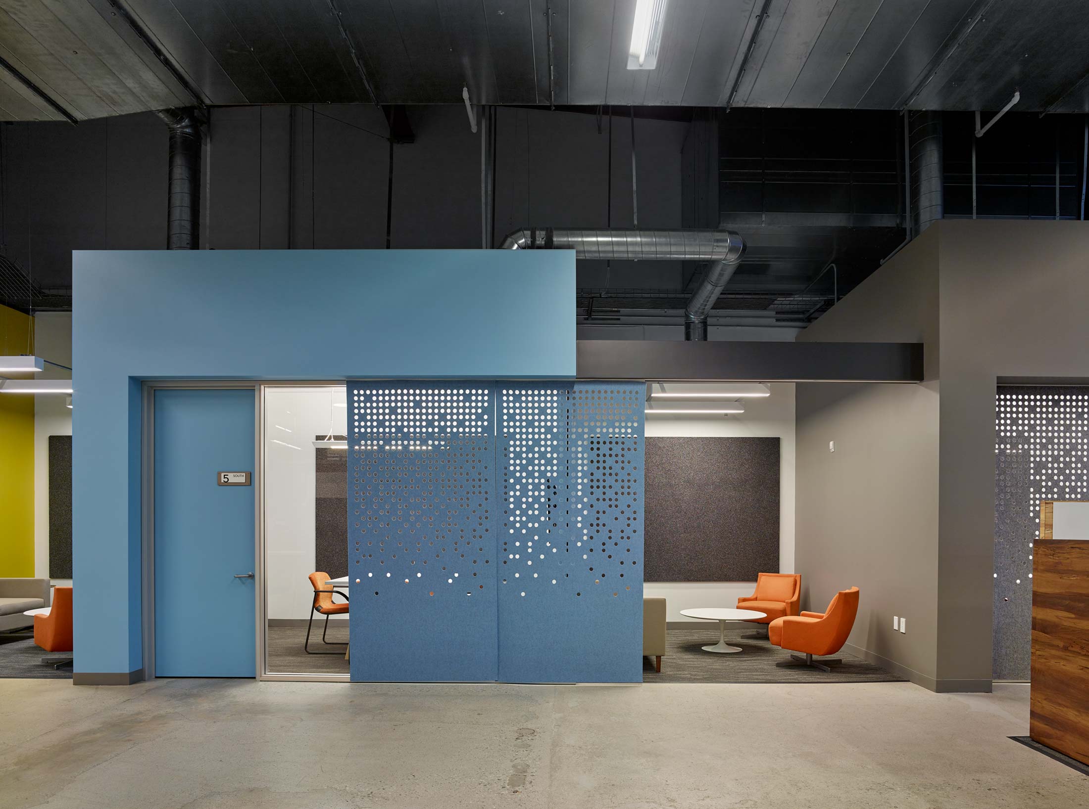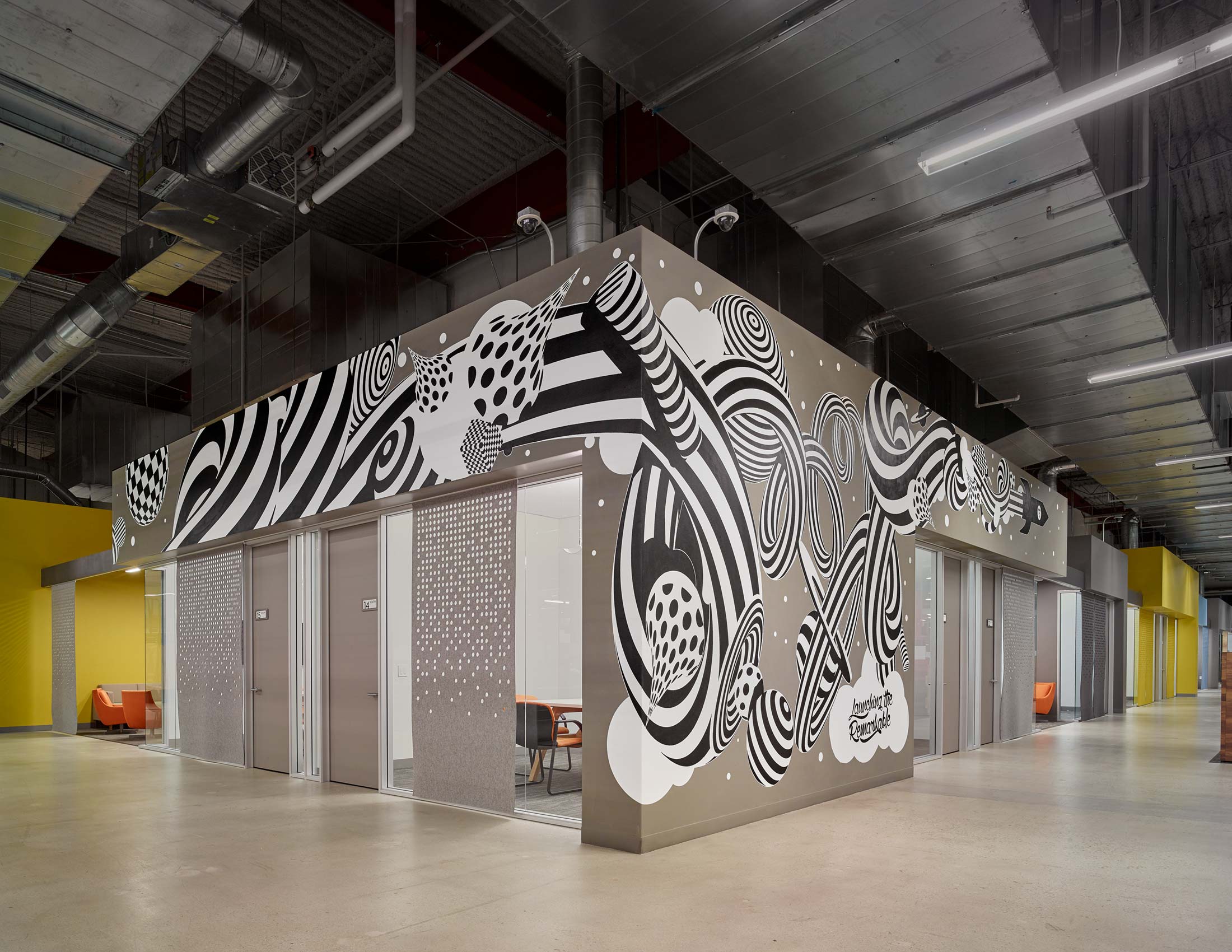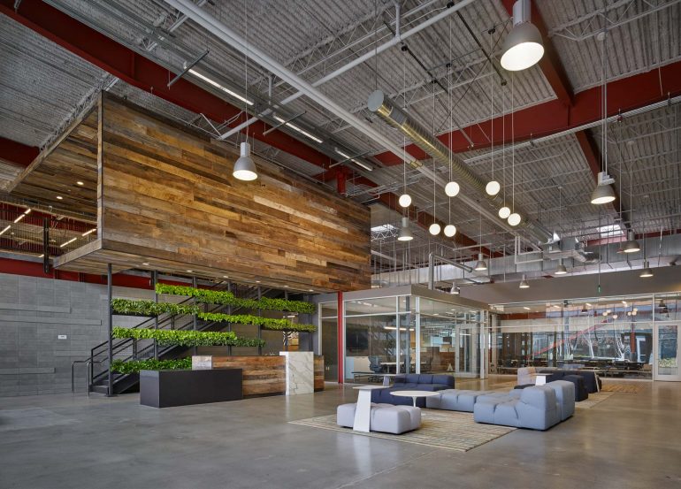 A massive folding “box” clad in reclaimed barn wood sets the tone for a reception space filled with large volumes and architectural forms. Playing against the scale of the building’s industrial shell, the material palette embraces a more residential tone with warm colors and textures. The existing structural elements are brightly painted enhancing their scale and presence in the vast space. The design celebrates the framework of the shell while promoting the minds of an advertising giant.