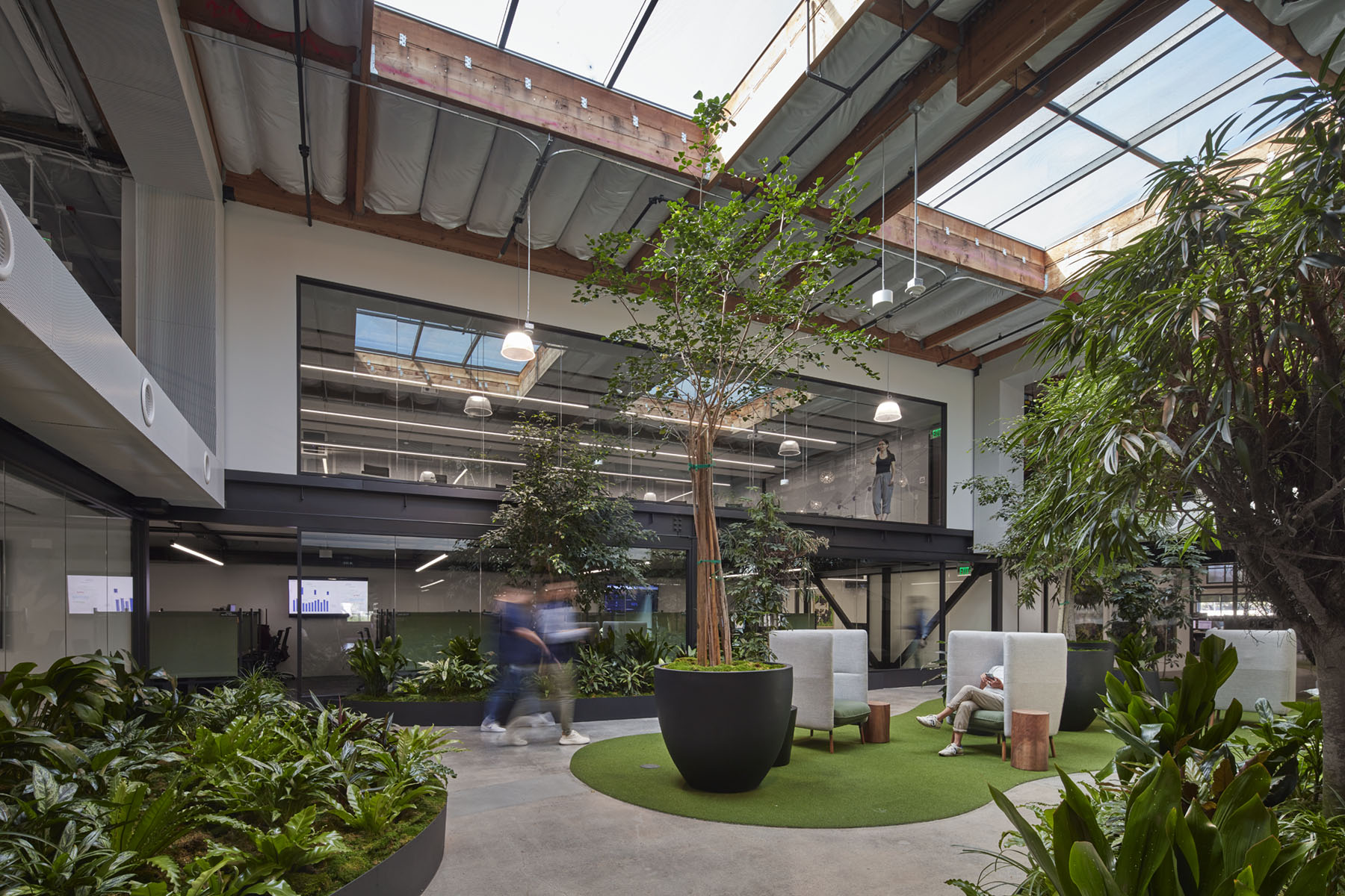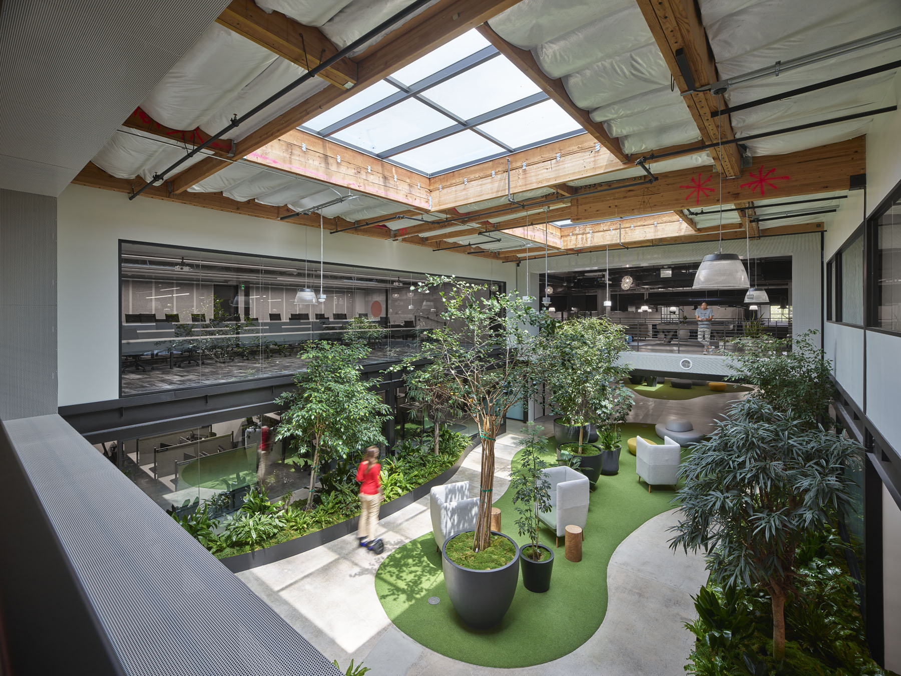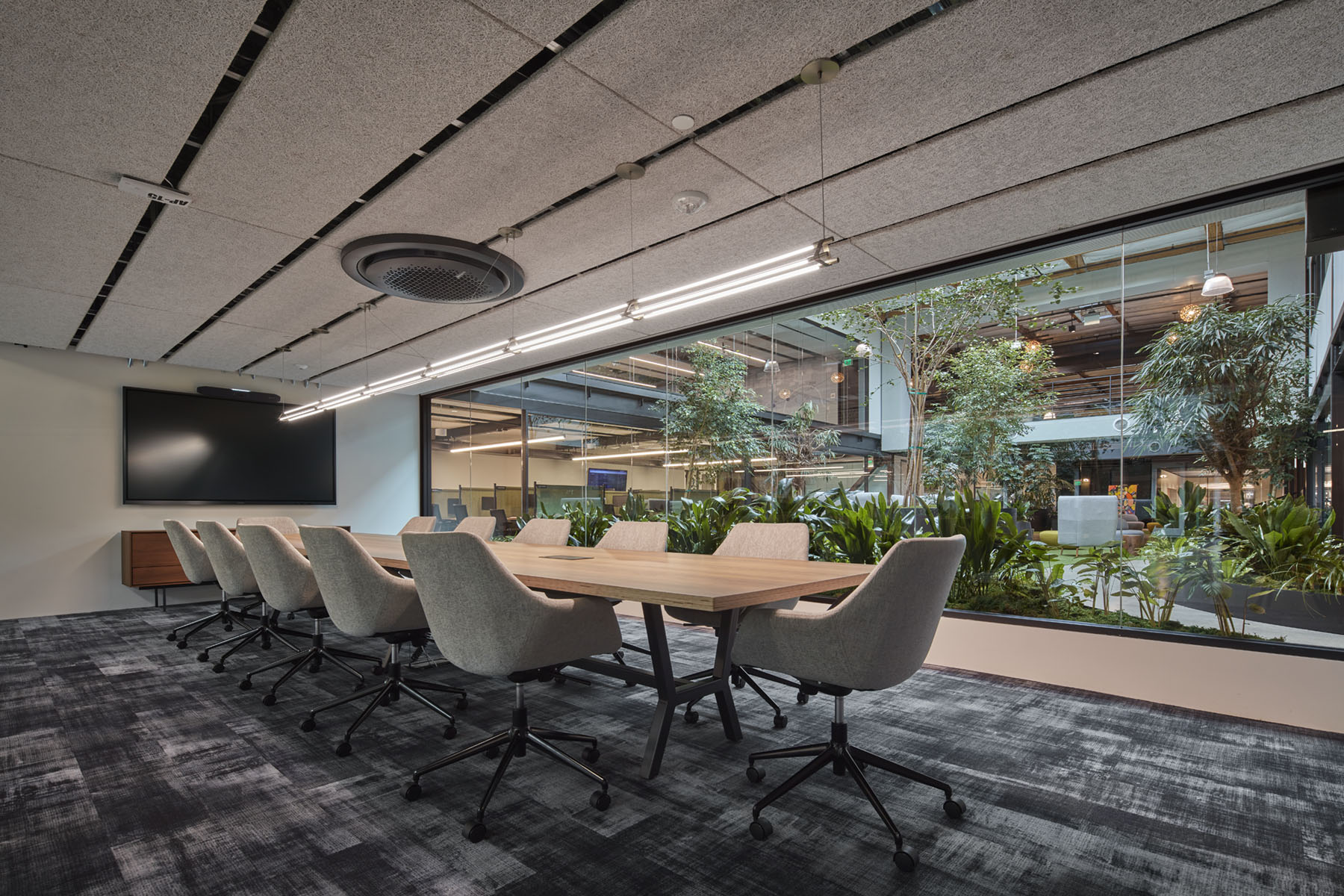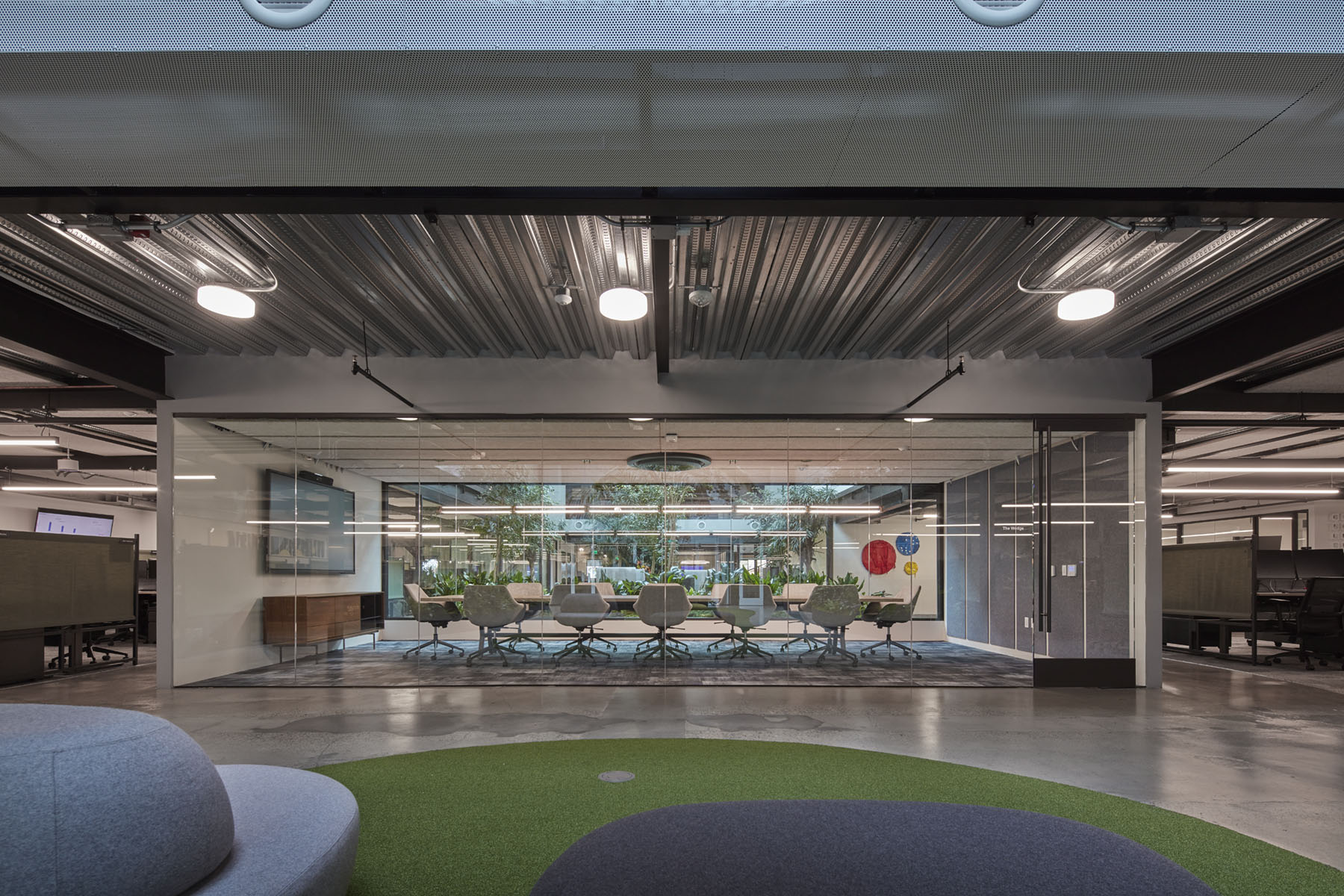 The project’s design is all about transparency. Roof openings flood the space with sunlight, and offices and communal areas are adorned with glass walls, bringing a new level of company transparency into the mix. When you seek a breath of fresh air, collaborative spaces embrace biophilic design, offering a dash of domestic comfort and a park-like indoor-outdoor recreational experience.