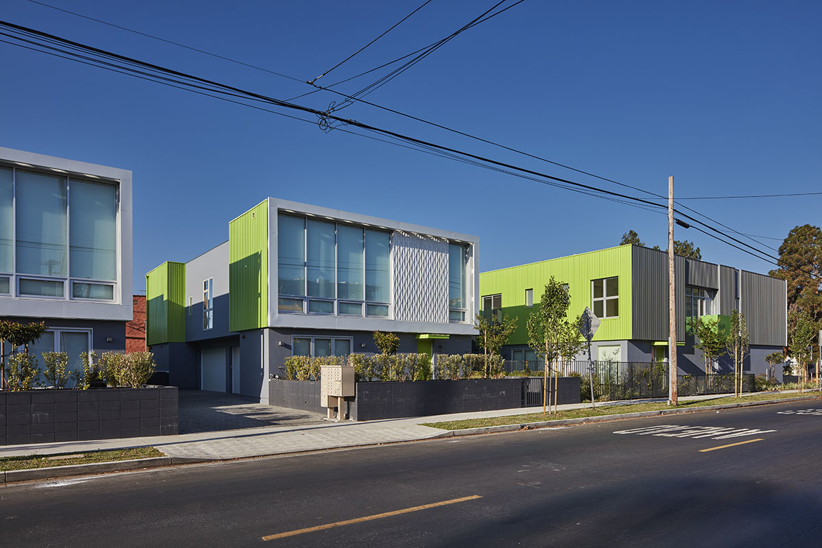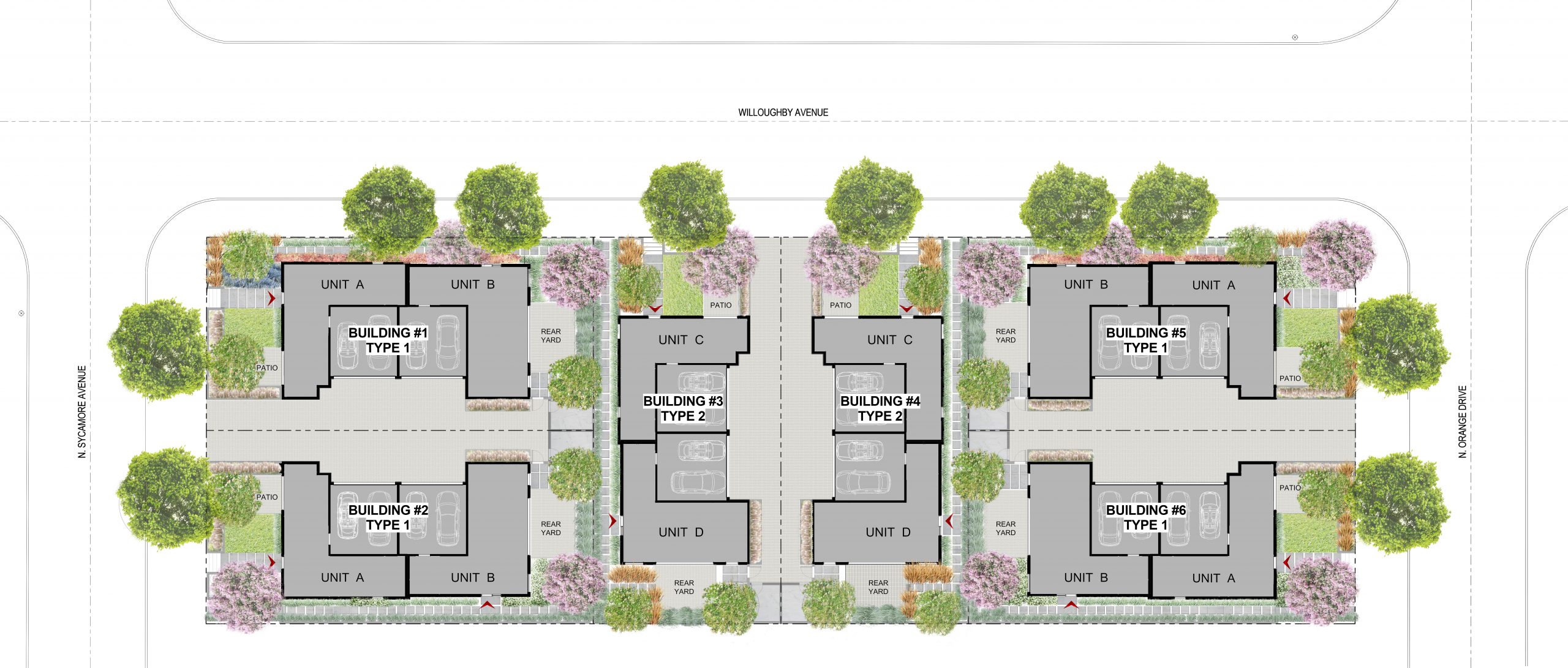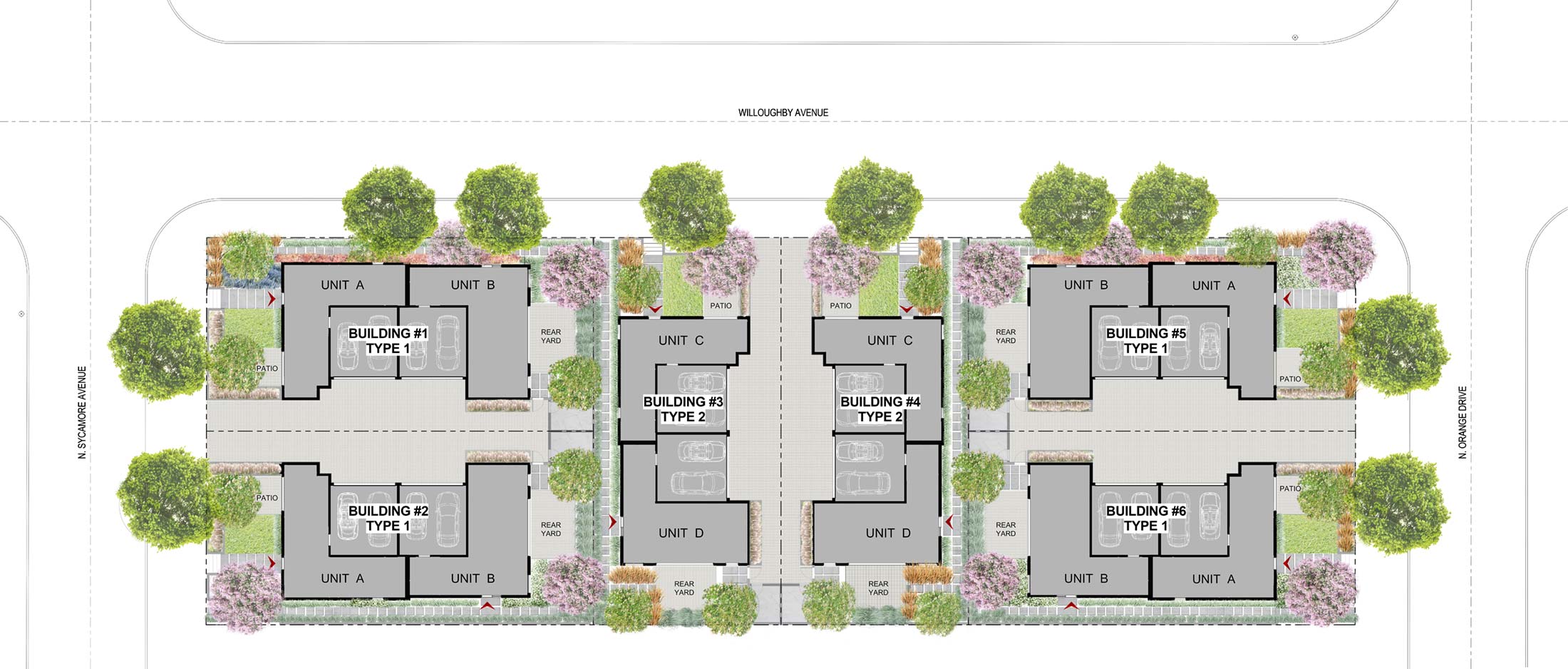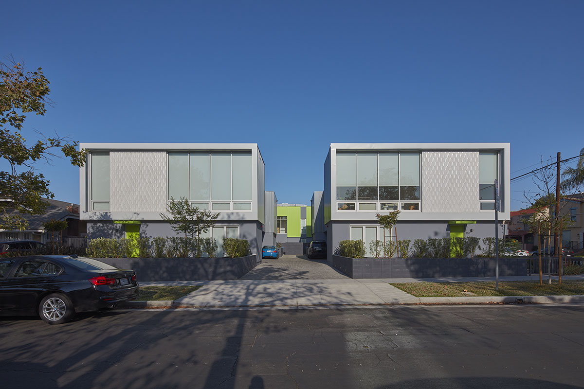The Willoughby Duplexes encompass an entire block near the La Brea Corridor. This complex is consciously designed to create a “village-like” feel, with six two-story residences oriented in pairs with intersecting circulation and landscaping to create flow and green-space. Each pair of buildings has individual entries and driveways creating a connective opening between the residences. The duplexes are wood-framed and arranged in two alternating 3-bedroom layouts, with the living quarters on the second floor in one orientation, and on the first floor within the other.